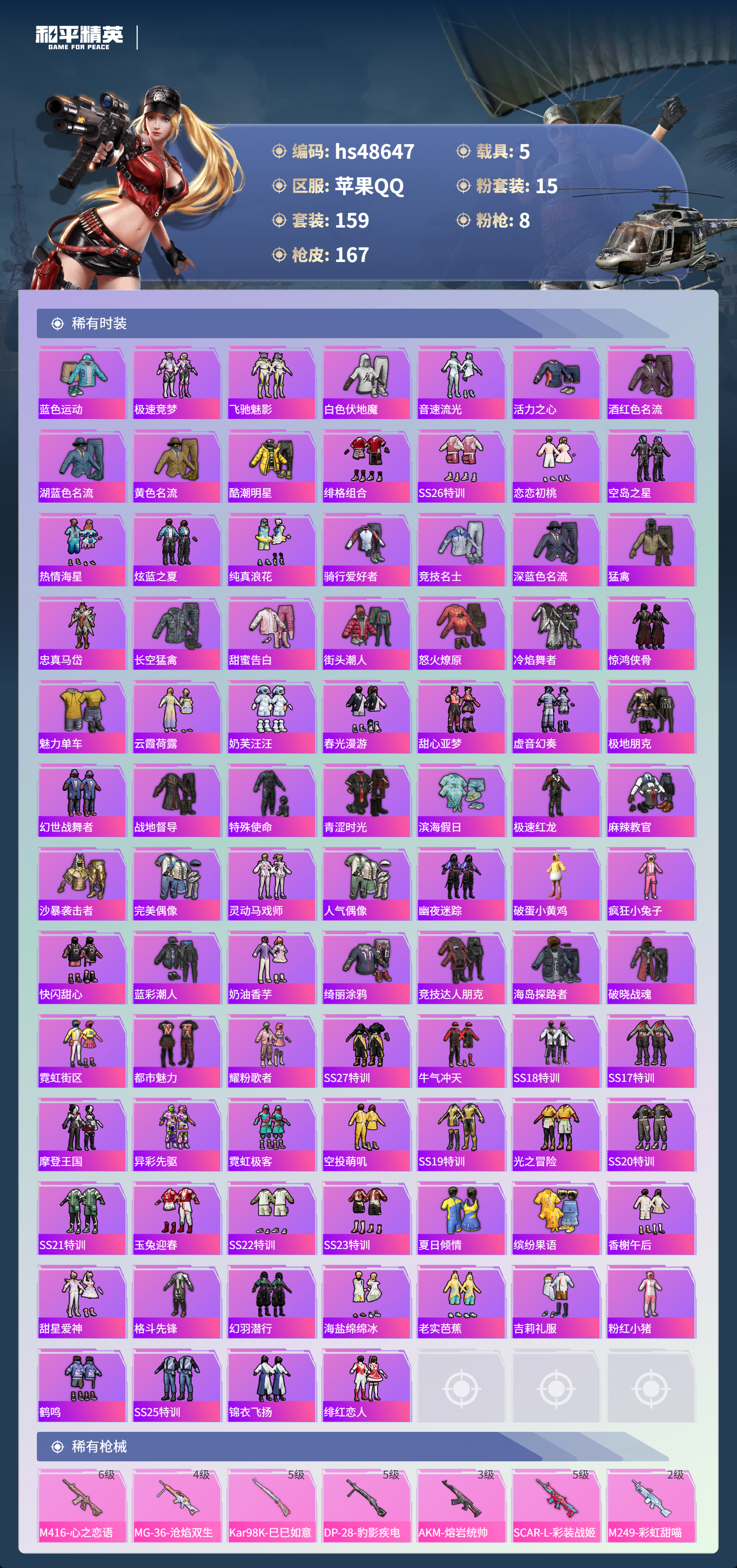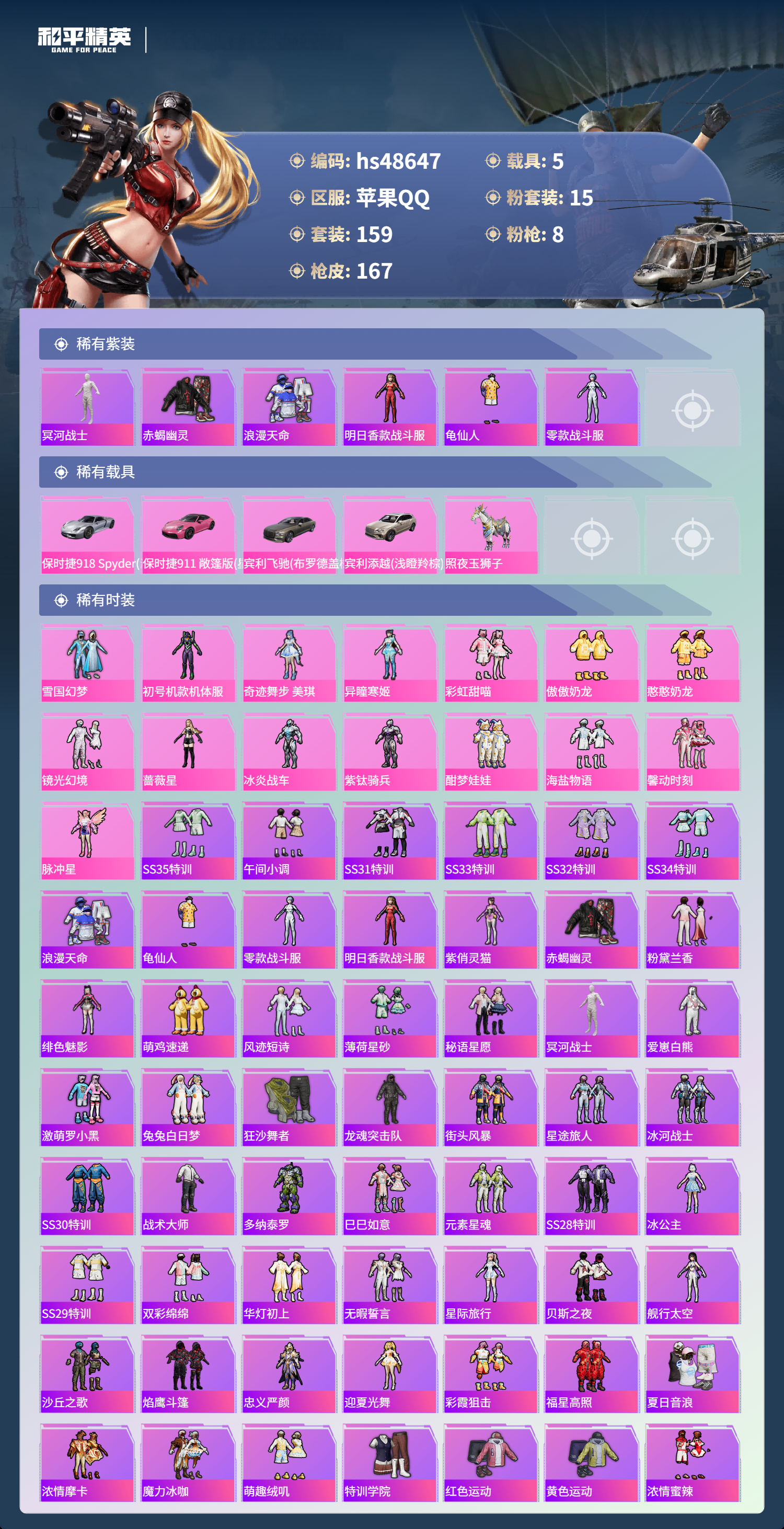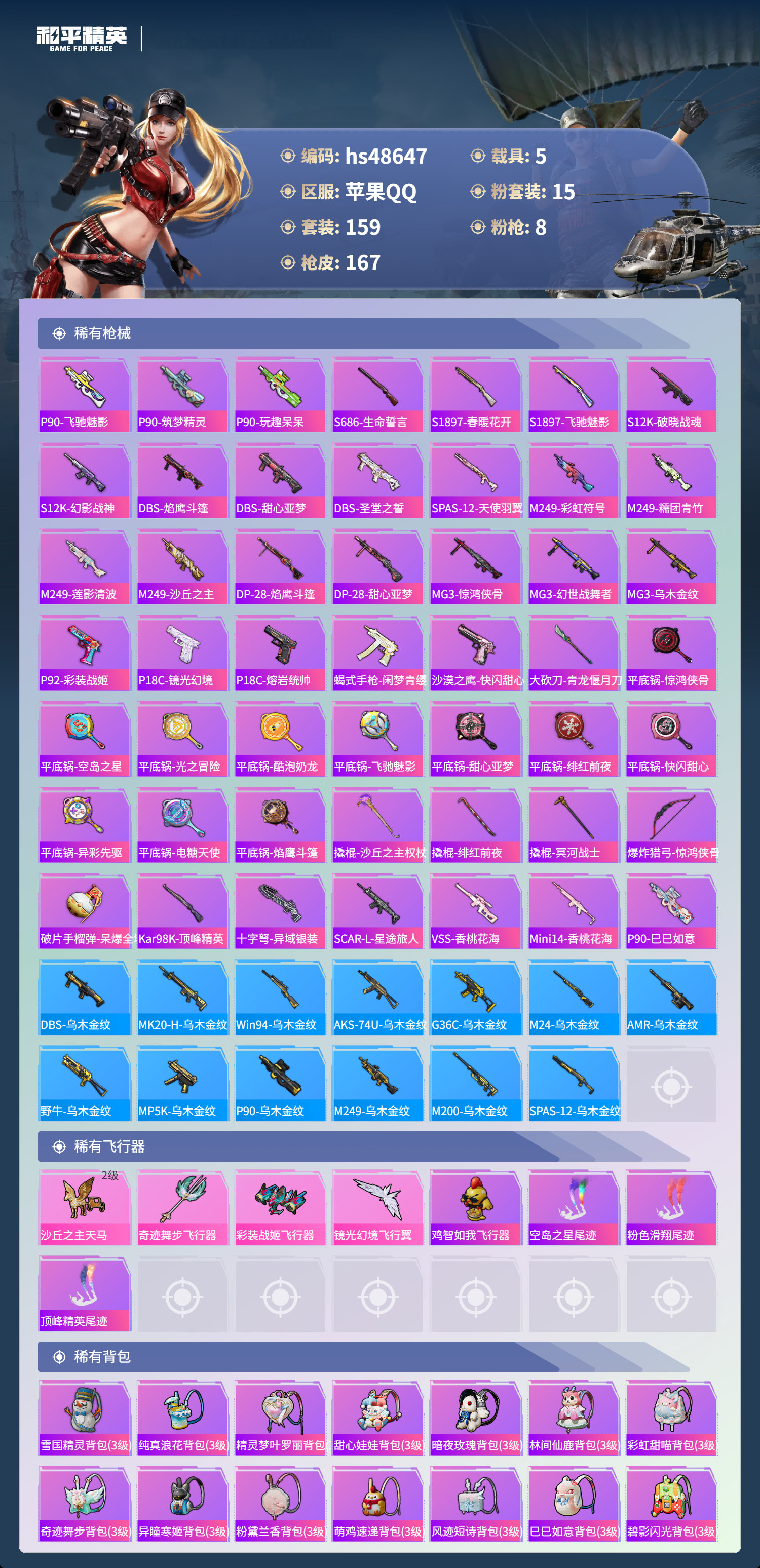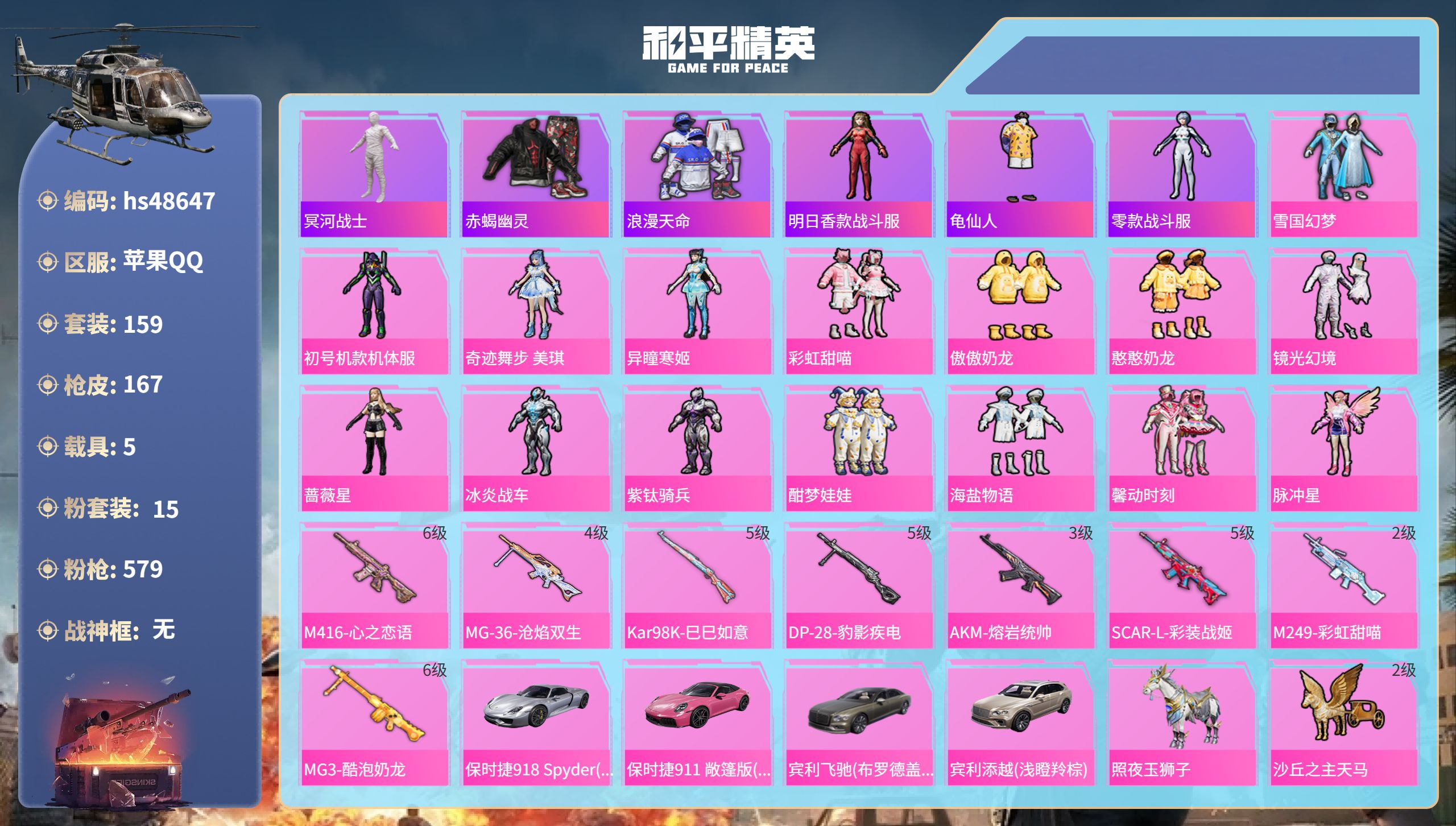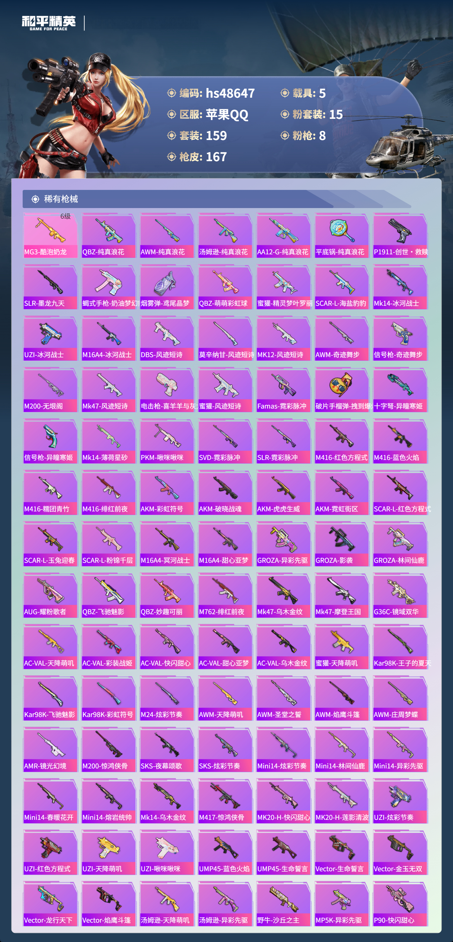 【95913】【不可二次】【苹果QQ】龟仙人 木乃伊 雪国梦幻 宾利添越(浅瞪羚棕) 酣梦娃娃 狂沙舞者 极速红龙 AKM-熔岩统帅 赤蝎幽灵 Mini14-林间仙鹿 雪国幻梦 海盐物语 SCAR-L-彩装战姬 M249-彩虹甜喵 GROZA-林间仙鹿 M416-心之恋语 粉红小猪 馨动时刻 MG3-酷泡奶龙 照夜玉狮子 紫螳螂 浪漫天命 镜光幻境飞行翼 激萌罗小黑