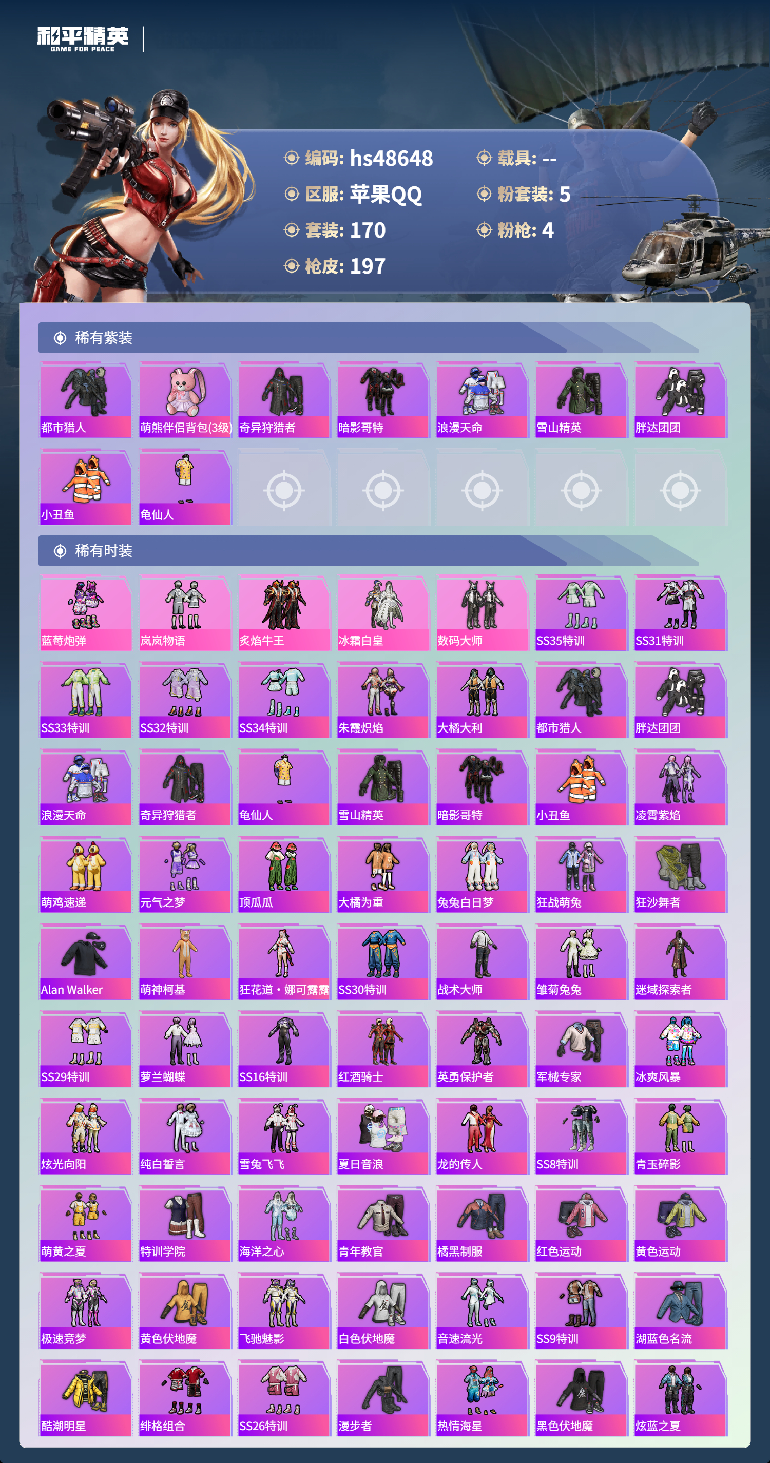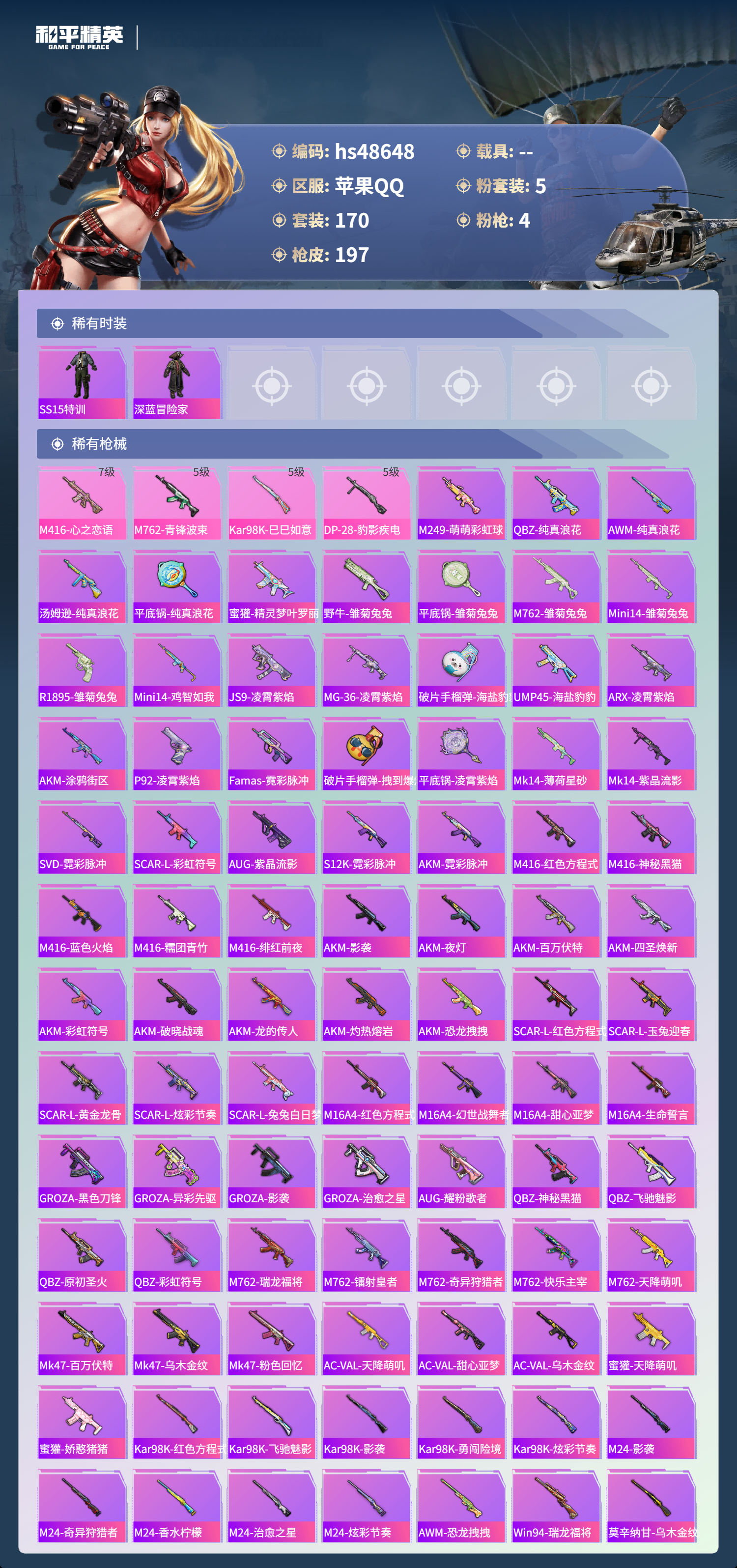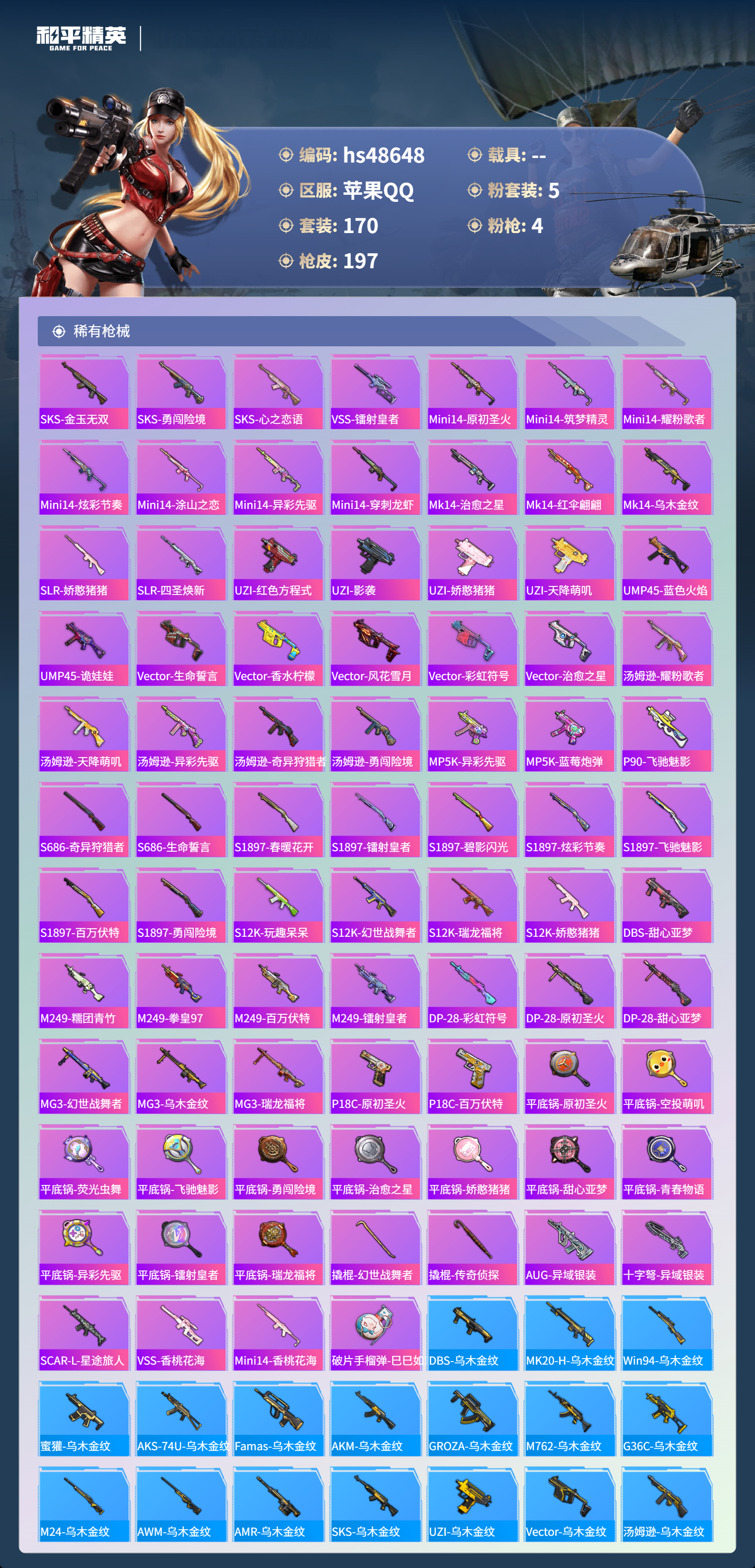 【95915】【不可二次】【苹果QQ】蓝莓炮弹 龟仙人 大橘为重 S686-奇异狩猎者 M762-青锋波束 漫步者 都市猎人 M24-奇异狩猎者 极速红龙 M762-奇异狩猎者 M416-心之恋语 M24-香水柠檬 瑞龙福将 浪漫天命 胖达团团 纯白誓言 团圆交子 岚岚物语 奇异狩猎者 萌神柯基 M762-瑞龙福将 海洋之心 狂沙舞者 童话森林 AKM-百万伏特 数码大师 暗影哥特 Vector