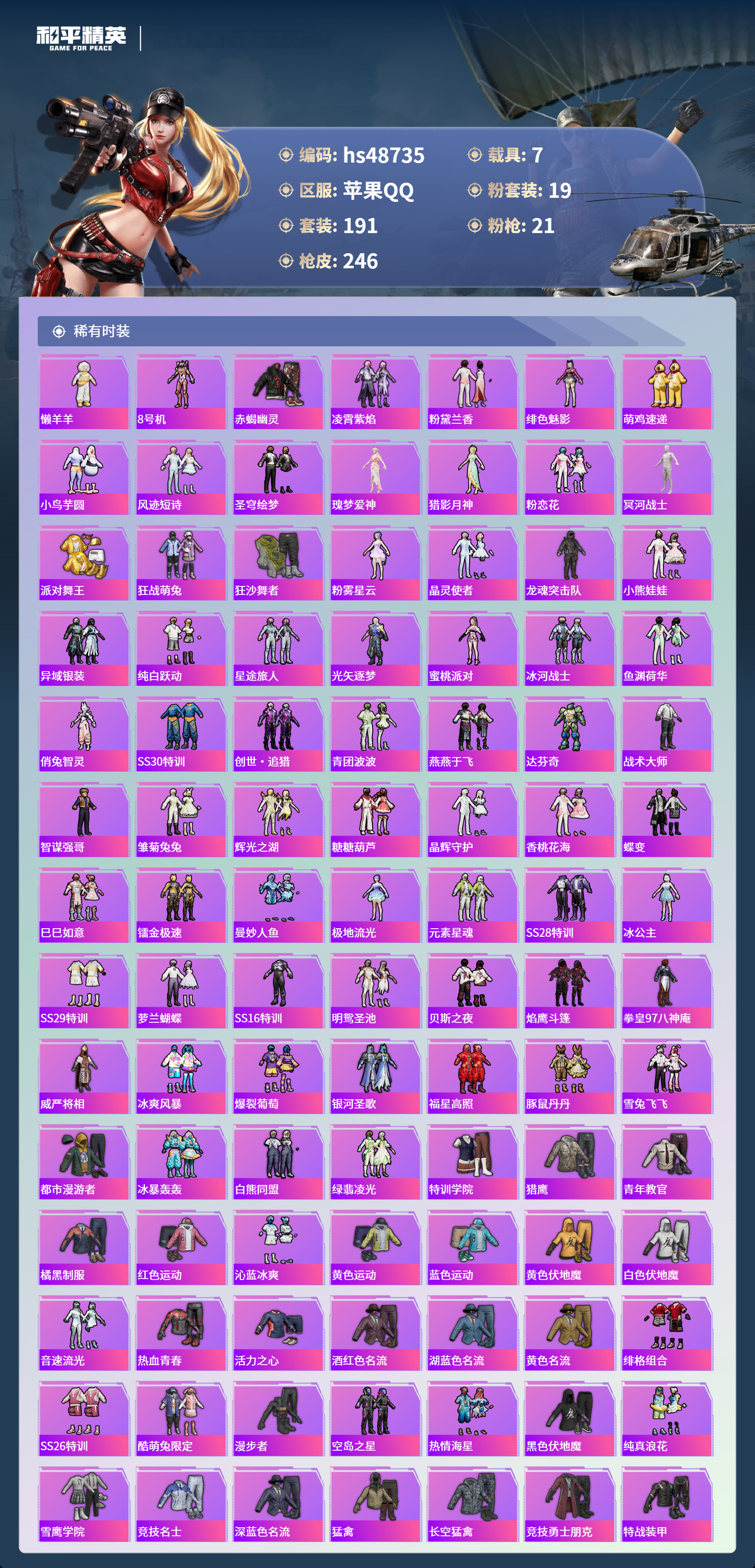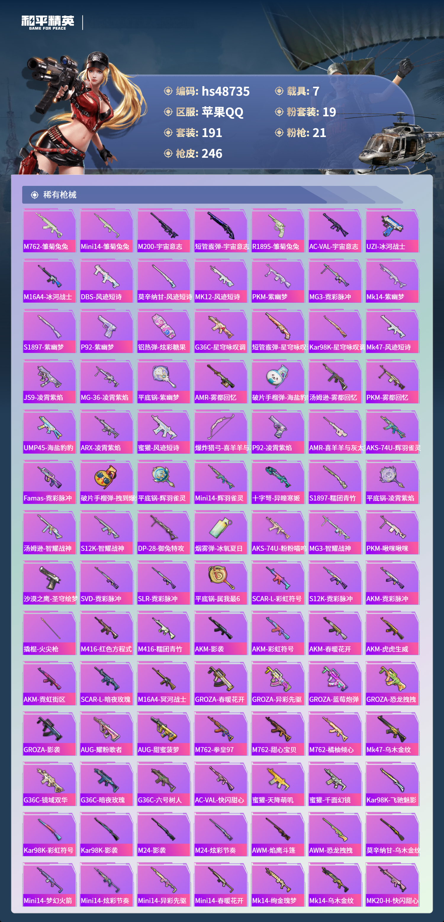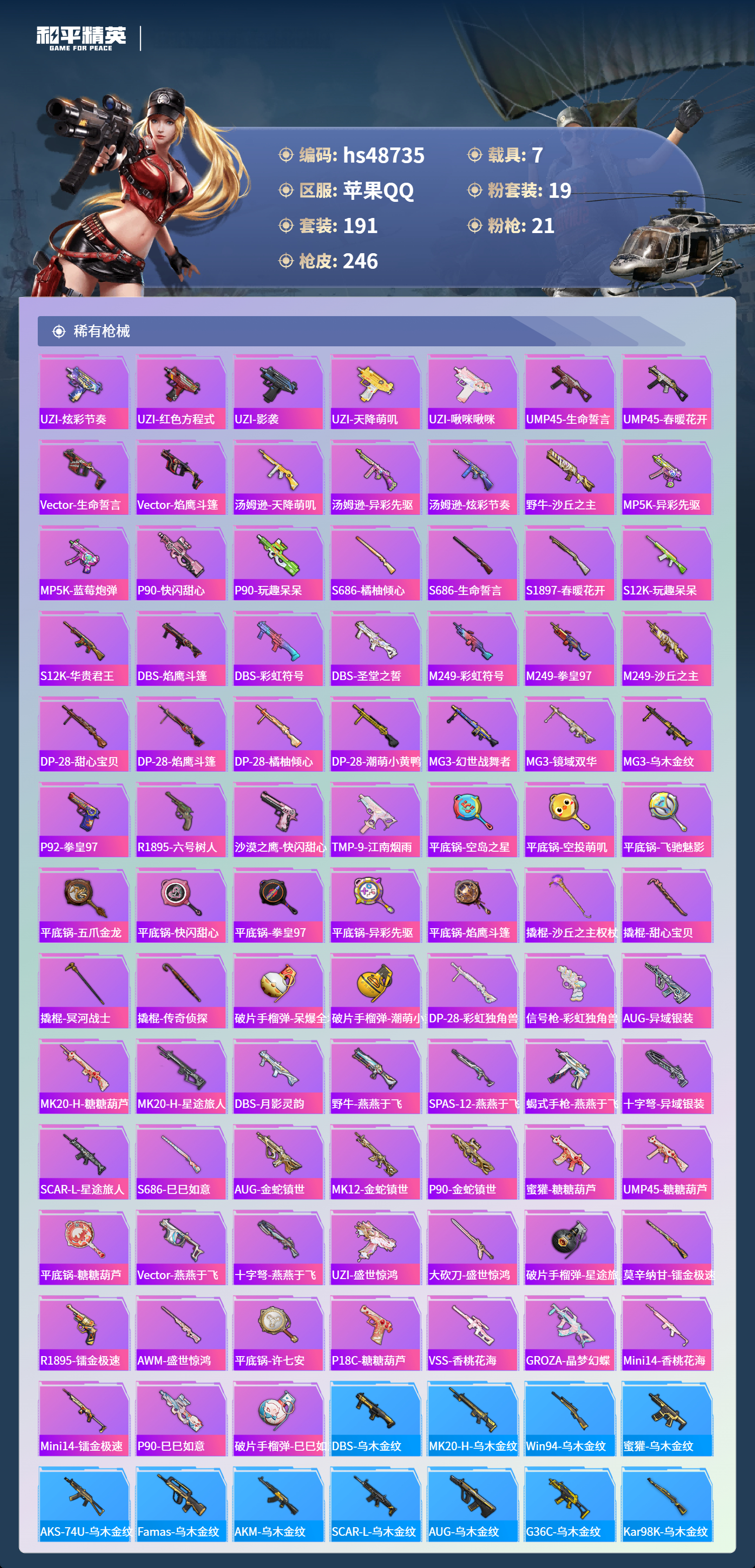 【95940】【可二次】【苹果QQ】蓝莓炮弹 龟仙人 AKM-绿萝繁花 木乃伊 漫步者 P90-沙丘之主 都市猎人 豚鼠丹丹 赤蝎幽灵 沙丘之主-图卡盟 放客神游 AUG-星梦奇缘 盛世惊鸿-云鸾 UMP45-量子极限 缤纷油彩 浪漫假日 蝶舞迷情 浪漫天命 SCAR-L-时空协奏 M24-镜域双华 星梦玉骢 DP-28-圣堂之誓 UMP45-宇宙意志 甜心巧克力 狂沙舞者 龙翔九天飞行器 春暖