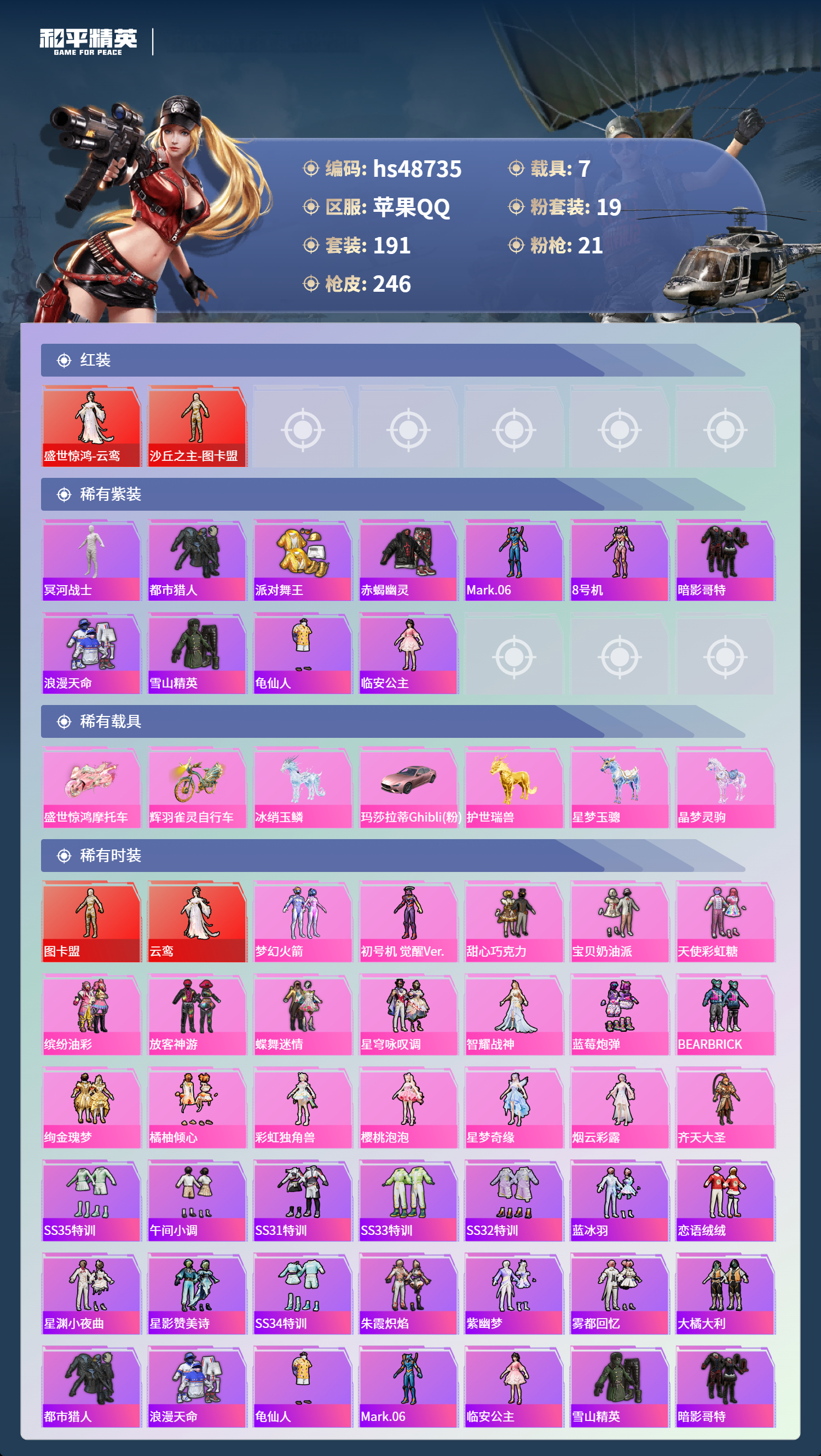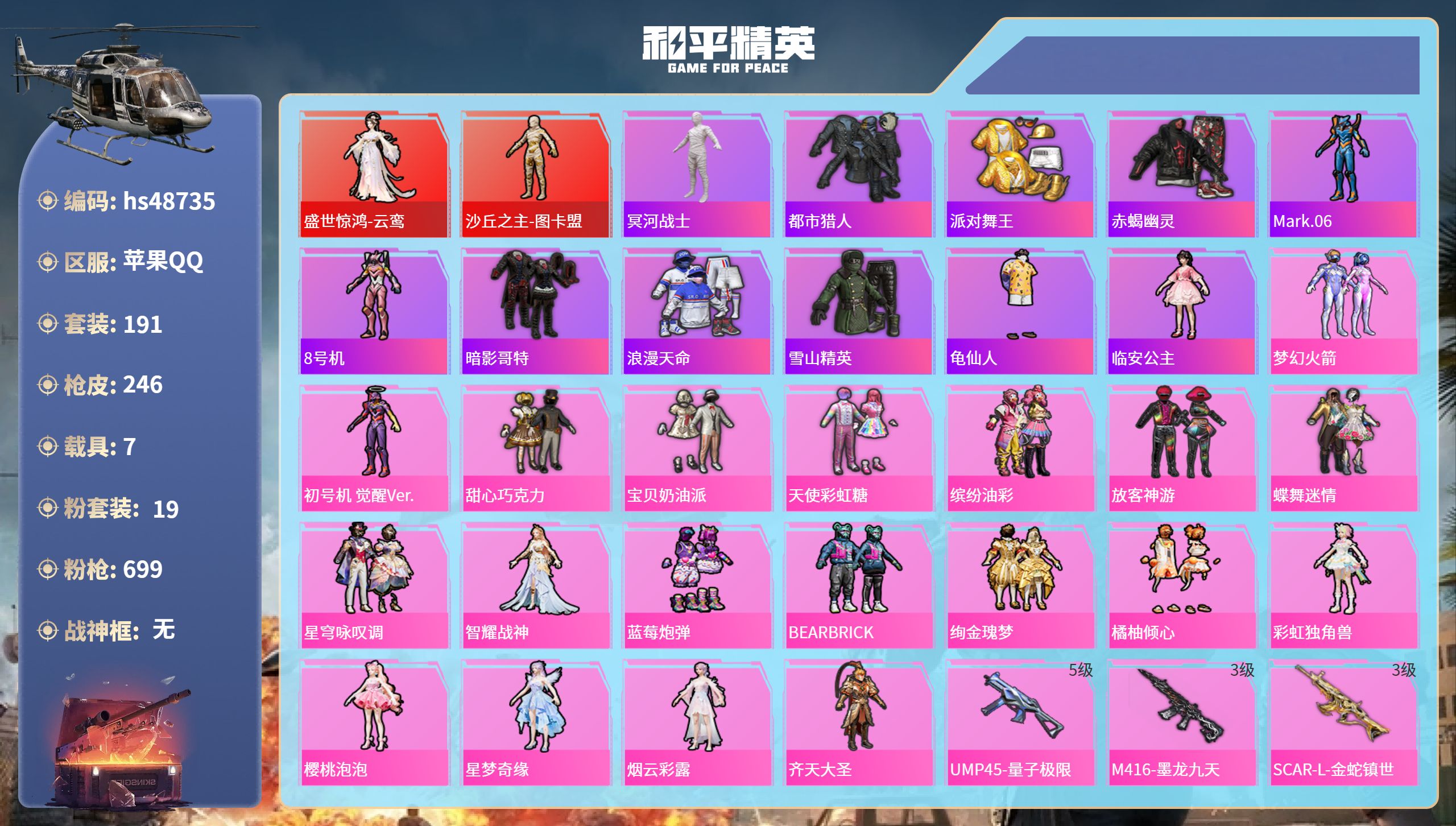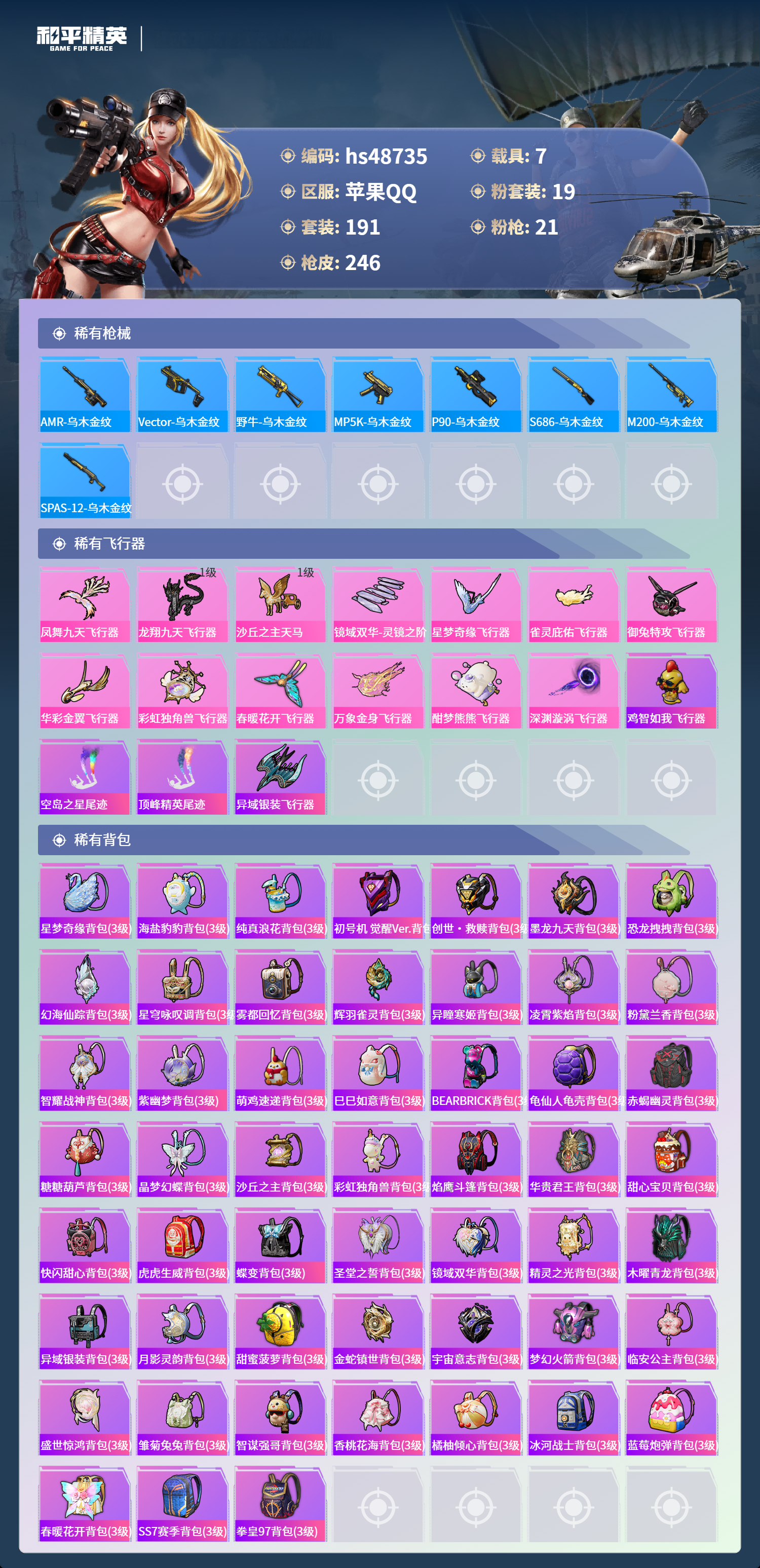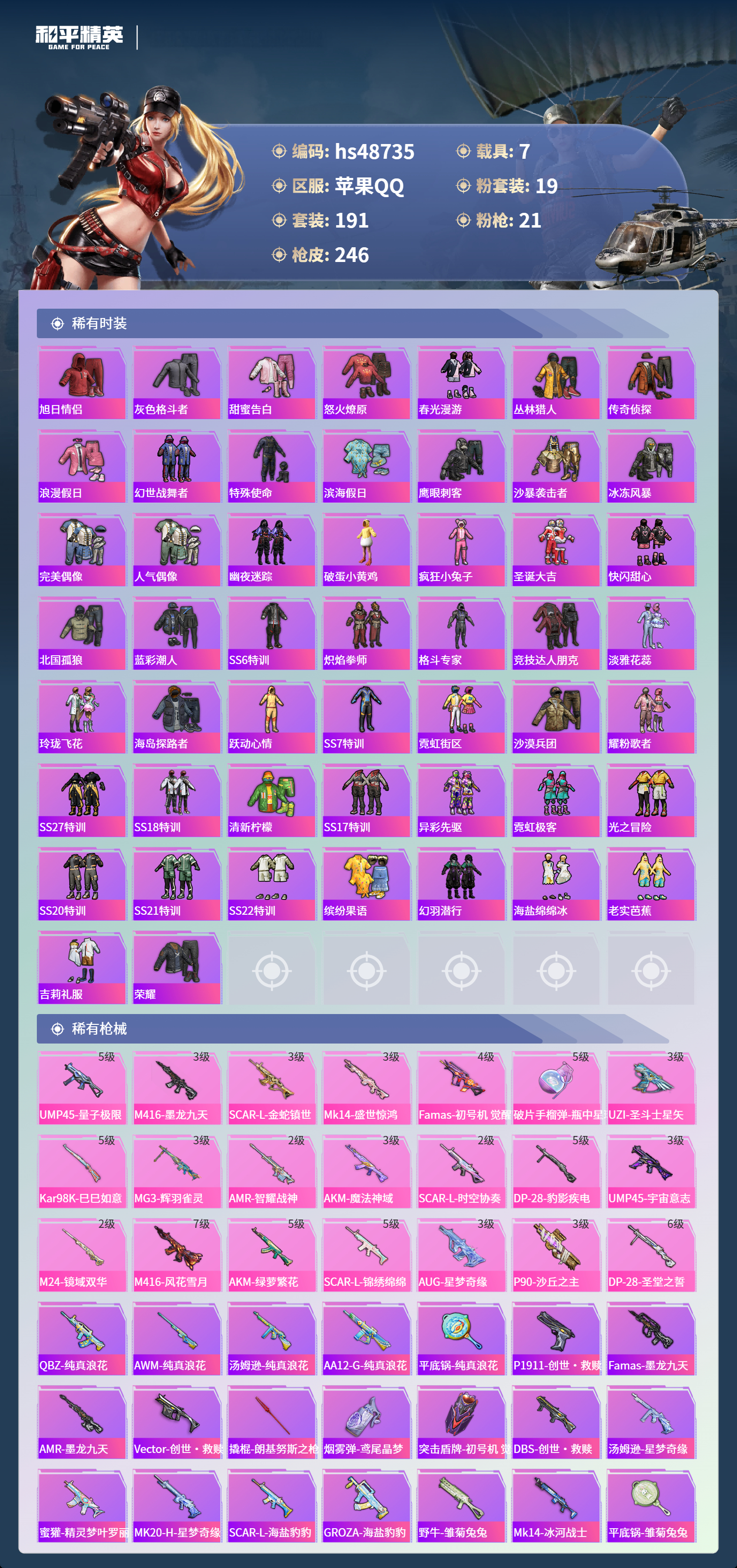 【95940】【可二次】【苹果QQ】蓝莓炮弹 龟仙人 AKM-绿萝繁花 木乃伊 漫步者 P90-沙丘之主 都市猎人 豚鼠丹丹 赤蝎幽灵 沙丘之主-图卡盟 放客神游 AUG-星梦奇缘 盛世惊鸿-云鸾 UMP45-量子极限 缤纷油彩 浪漫假日 蝶舞迷情 浪漫天命 SCAR-L-时空协奏 M24-镜域双华 星梦玉骢 DP-28-圣堂之誓 UMP45-宇宙意志 甜心巧克力 狂沙舞者 龙翔九天飞行器 春暖