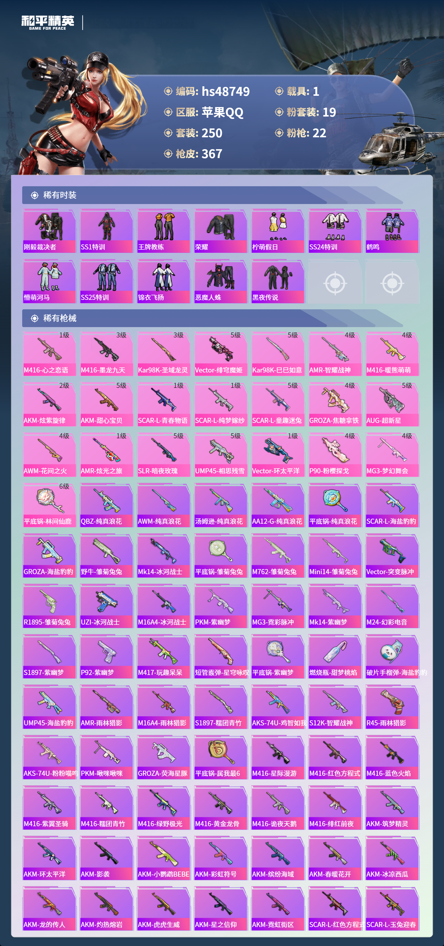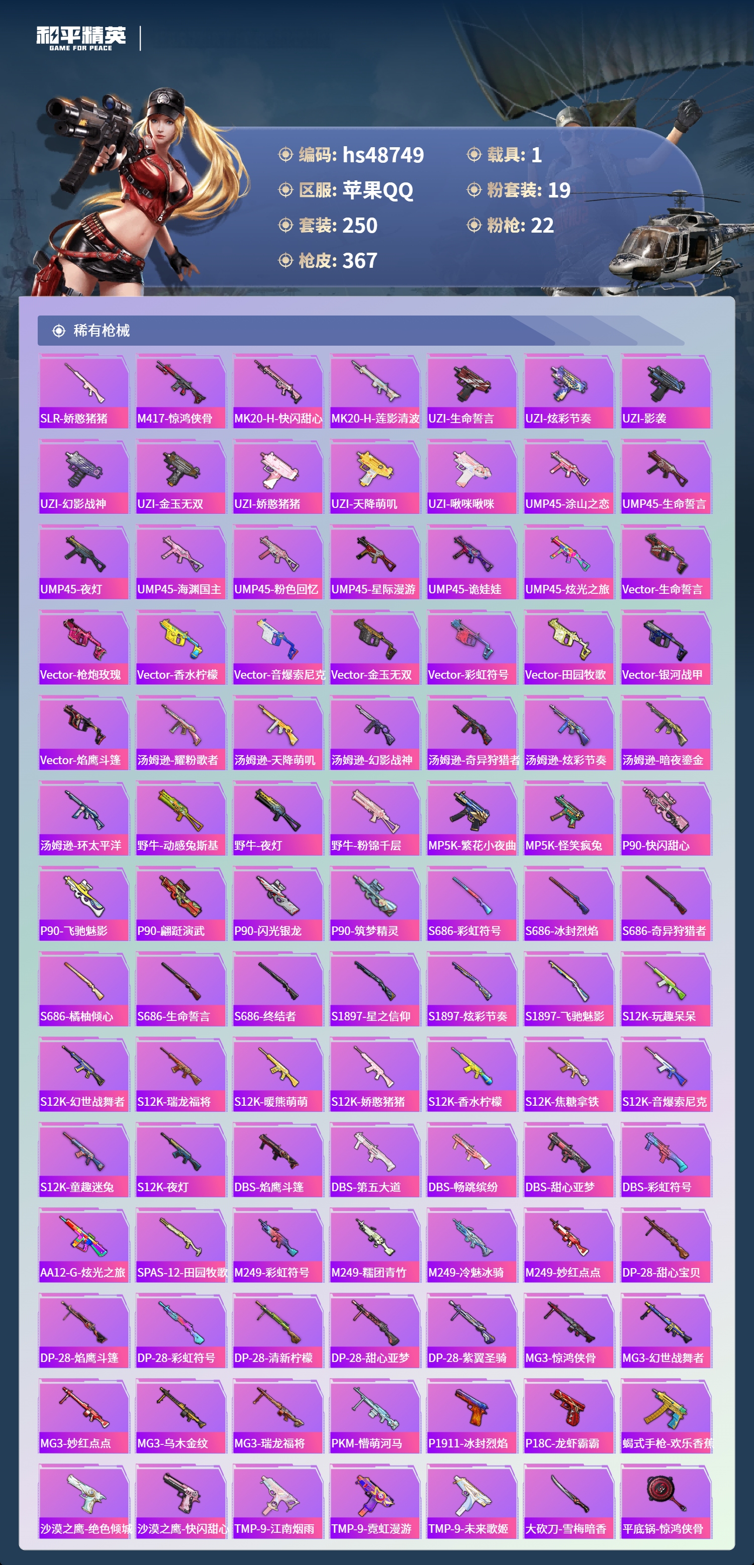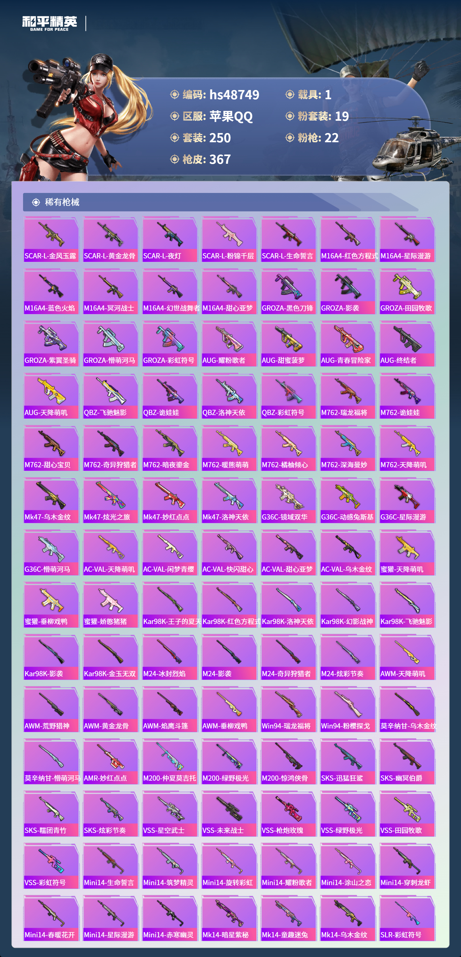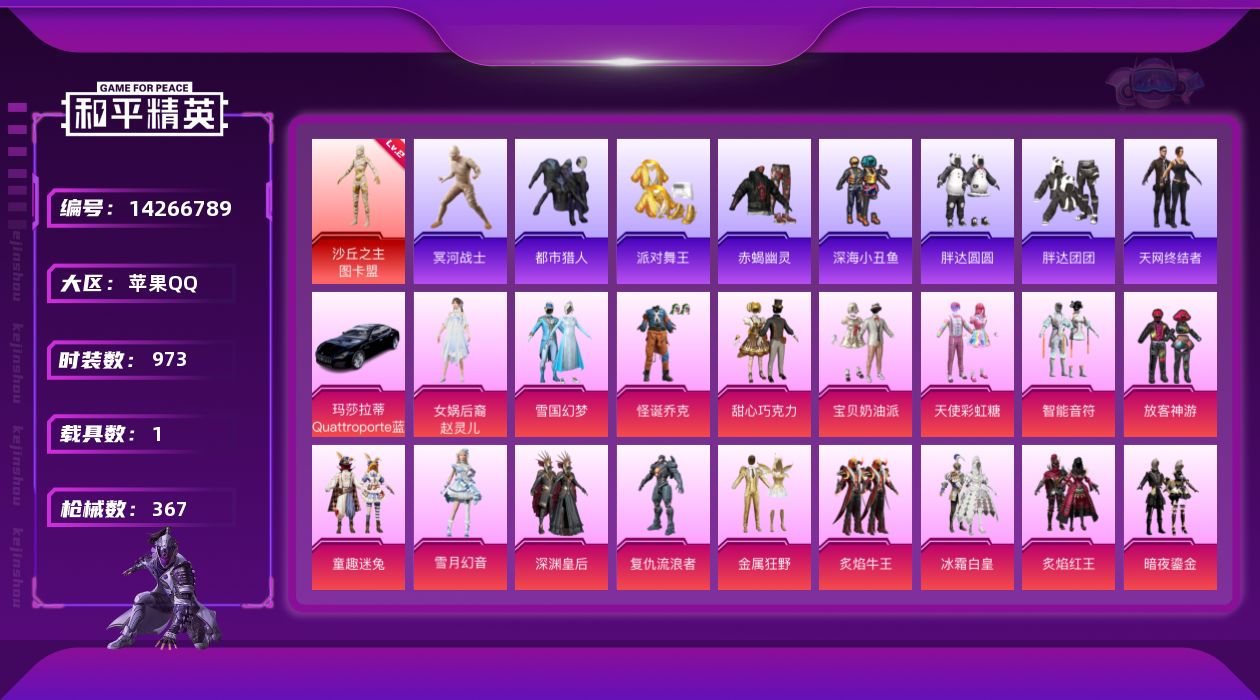 【95941】【可二次】【苹果QQ】龟仙人 漫步者 M416-星际漫游 都市猎人 金属狂野 M762-奇异狩猎者 沙丘之主-图卡盟 M416-暖熊萌萌 M416-心之恋语 深海小丑鱼 SCAR-童趣迷兔 童趣迷兔 智能音符 AWM-黄金龙骨 MG3-梦幻舞会 AKM-甜心宝贝 SS1特训 怪诞乔克 迅捷狂鲨 M762-瑞龙福将 潮萌小黄鸭 Vector-环太平洋 狂沙舞者 AKM-炫紫旋律 AW