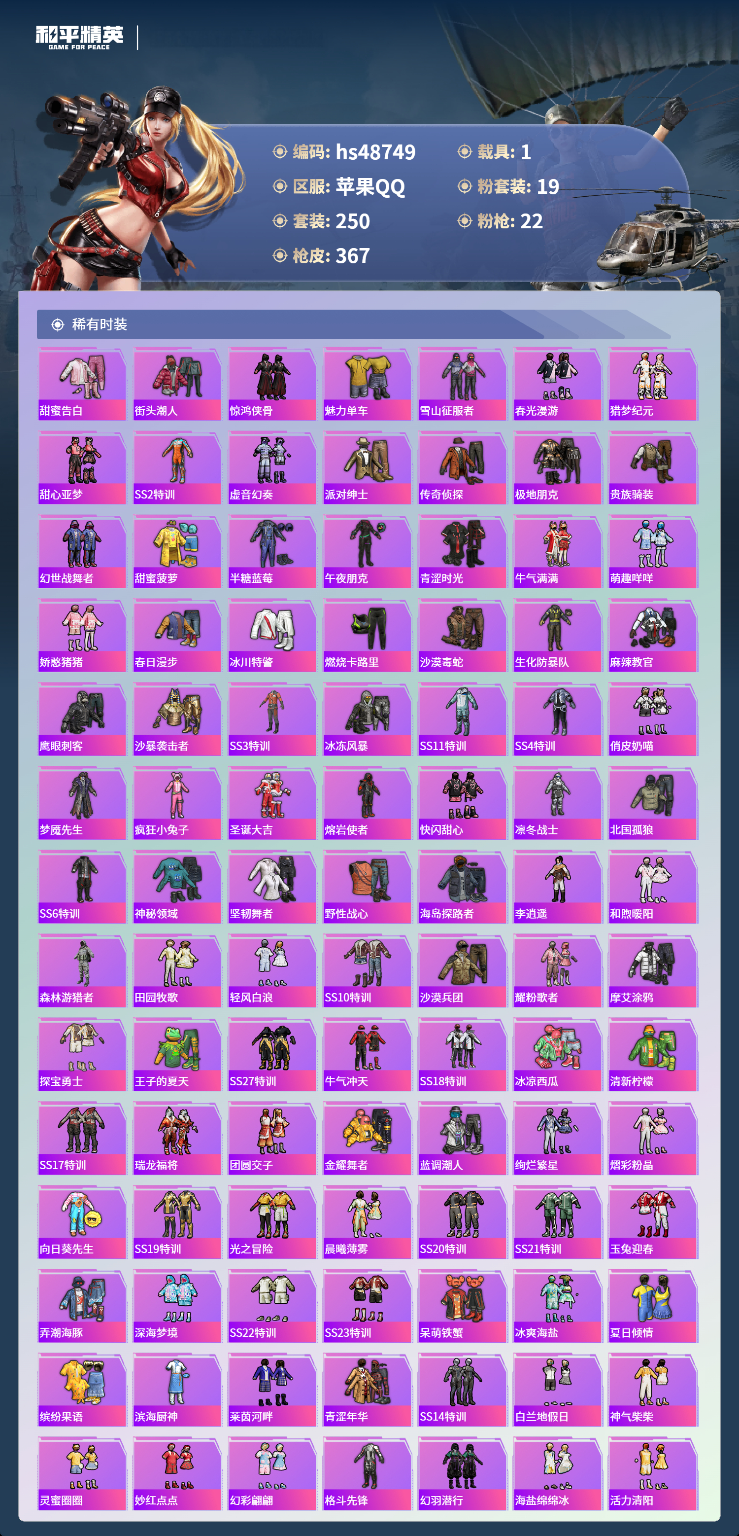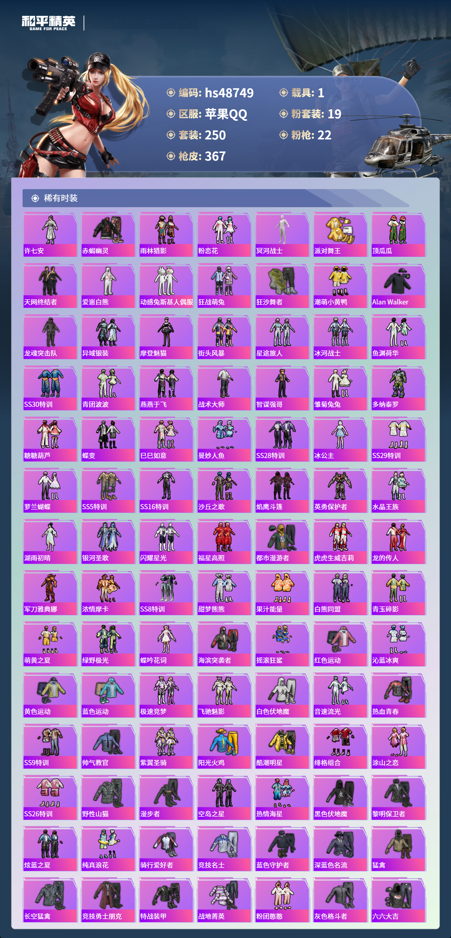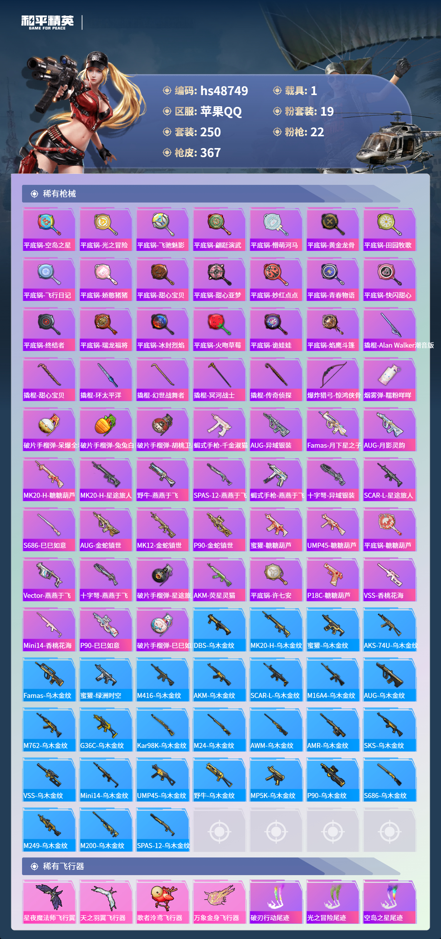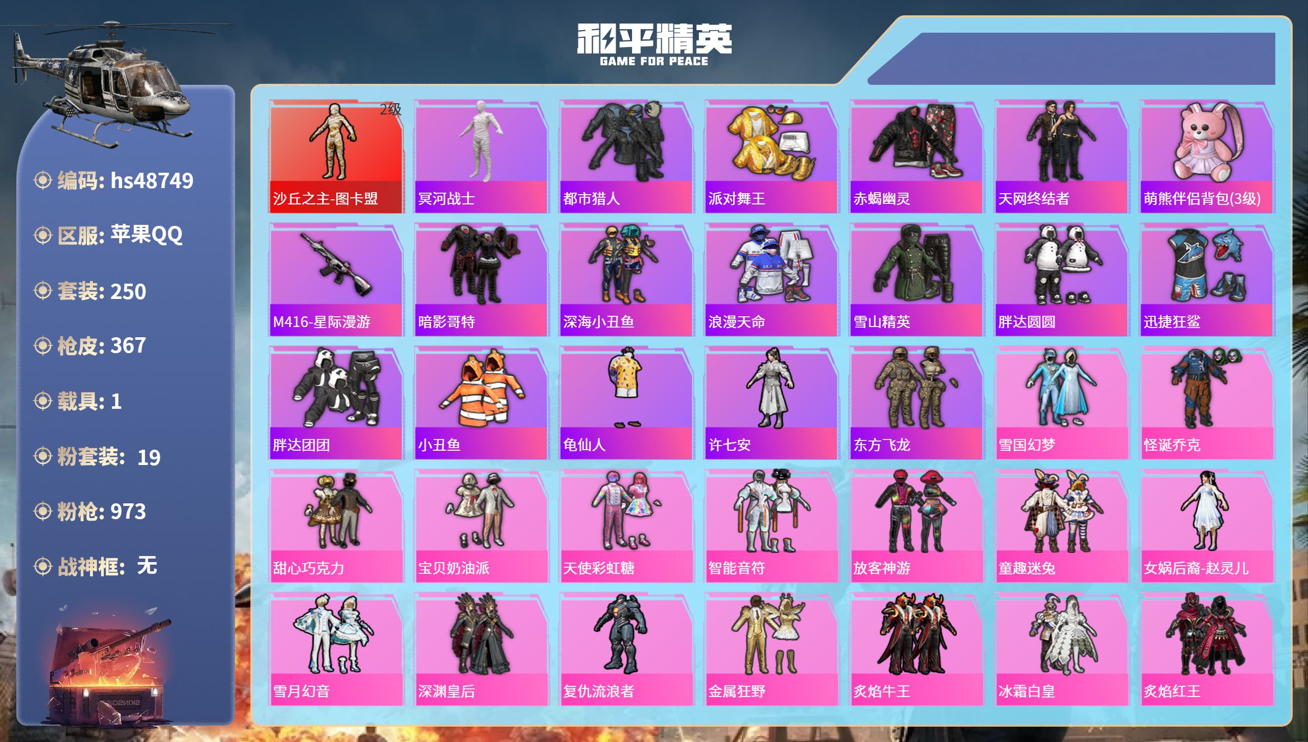 【95941】【可二次】【苹果QQ】龟仙人 漫步者 M416-星际漫游 都市猎人 金属狂野 M762-奇异狩猎者 沙丘之主-图卡盟 M416-暖熊萌萌 M416-心之恋语 深海小丑鱼 SCAR-童趣迷兔 童趣迷兔 智能音符 AWM-黄金龙骨 MG3-梦幻舞会 AKM-甜心宝贝 SS1特训 怪诞乔克 迅捷狂鲨 M762-瑞龙福将 潮萌小黄鸭 Vector-环太平洋 狂沙舞者 AKM-炫紫旋律 AW