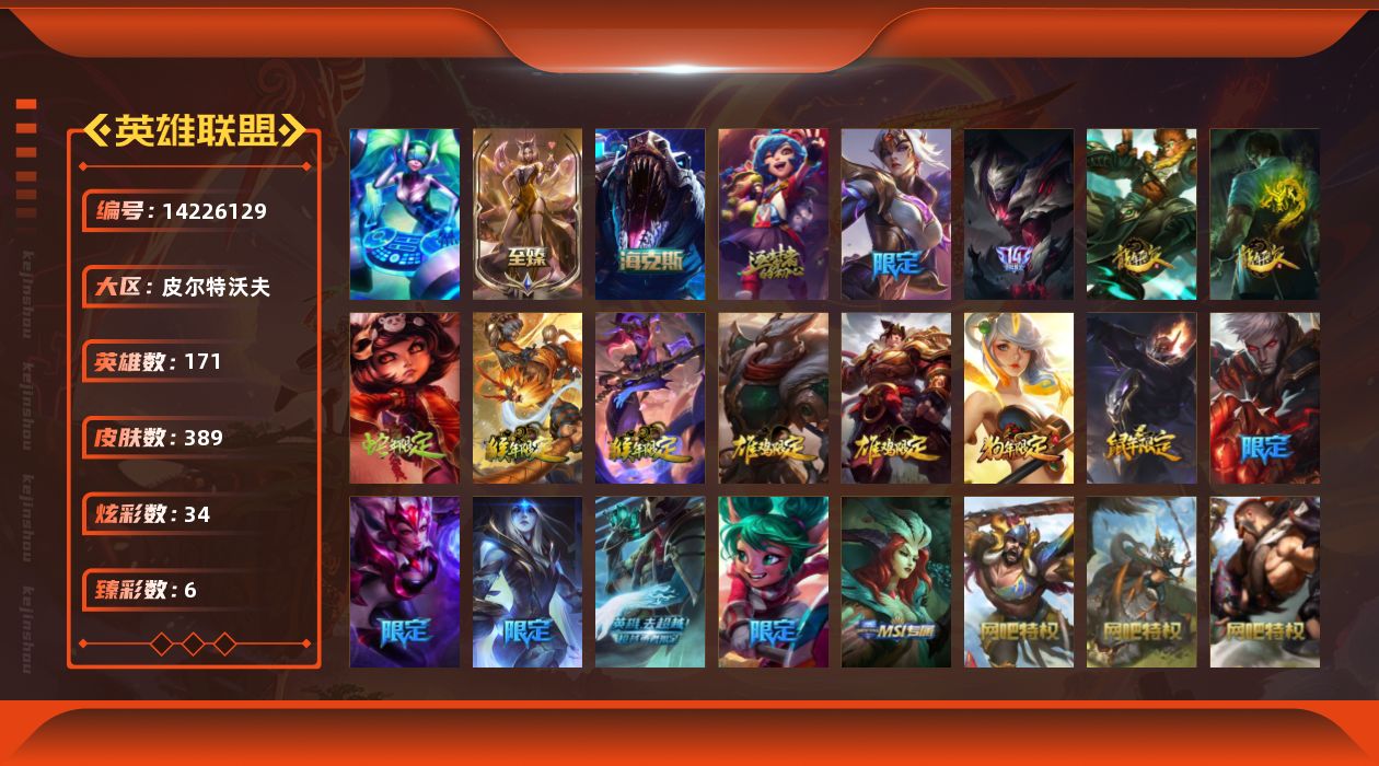 【99016】[14226129]可二次实名游戏等级:264 区服信息:皮尔特沃夫 单双排段位:华贵铂金 英雄数量:171 皮肤数量:389 炫彩数量:34 臻彩数量:6 神话数量:3 云顶神话数量:0 游戏点卷:80 神话精粹:4 蓝色精萃:67600 橙色精粹:1466 钥匙:0 宝箱:40 【重要头像】 【重要皮肤】KDA阿狸至臻 海克斯科技雷克顿 胜利女神娑娜 胜利之王泰达米尔 胜利巨口