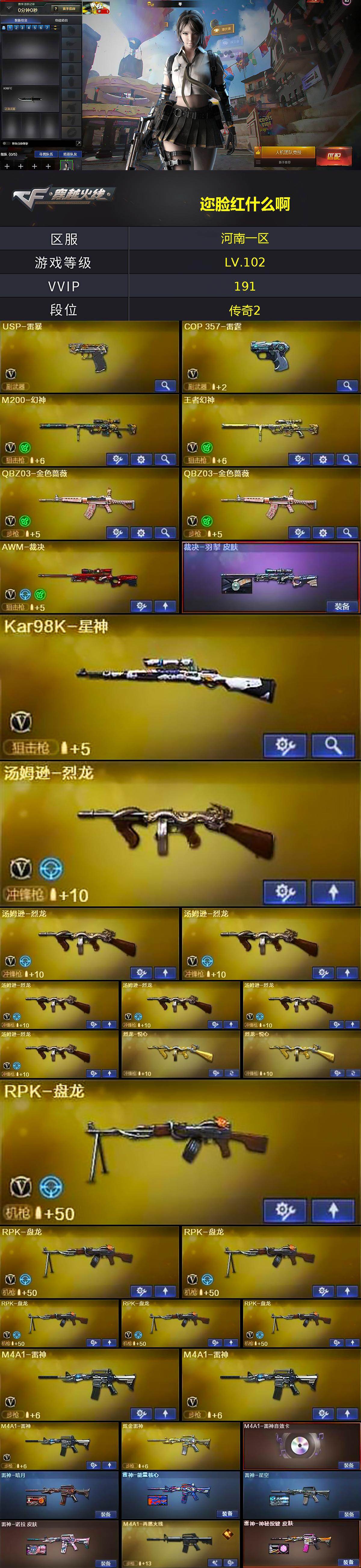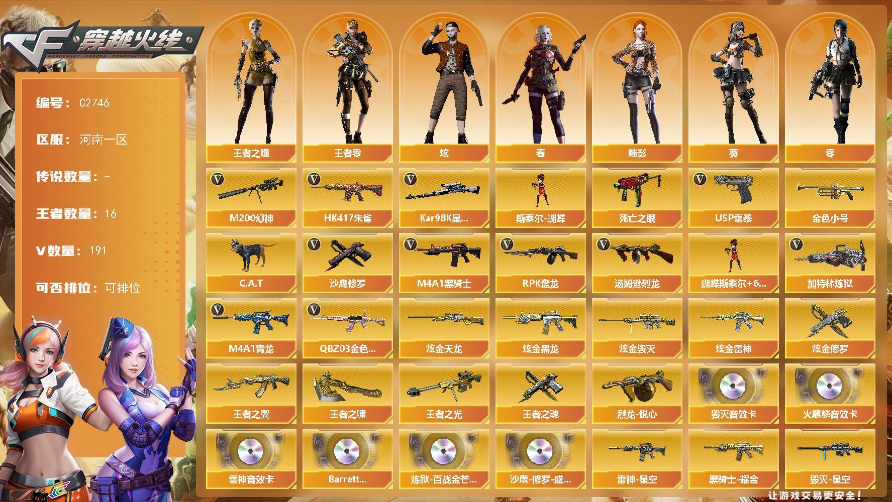 【99617】【99617】[14282264]河南一区-191V-16王者-7炫金【热门武器】:QBZ03-金色蔷薇*2,HK417-朱雀,M4A1-青龙,