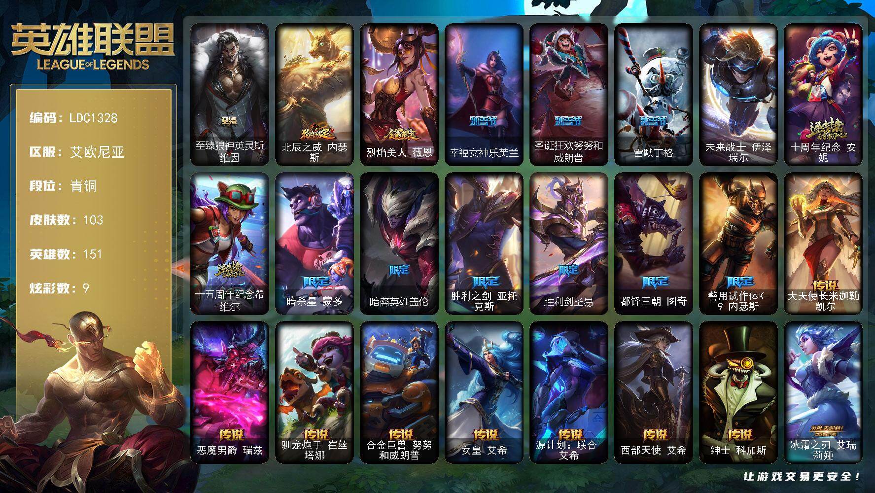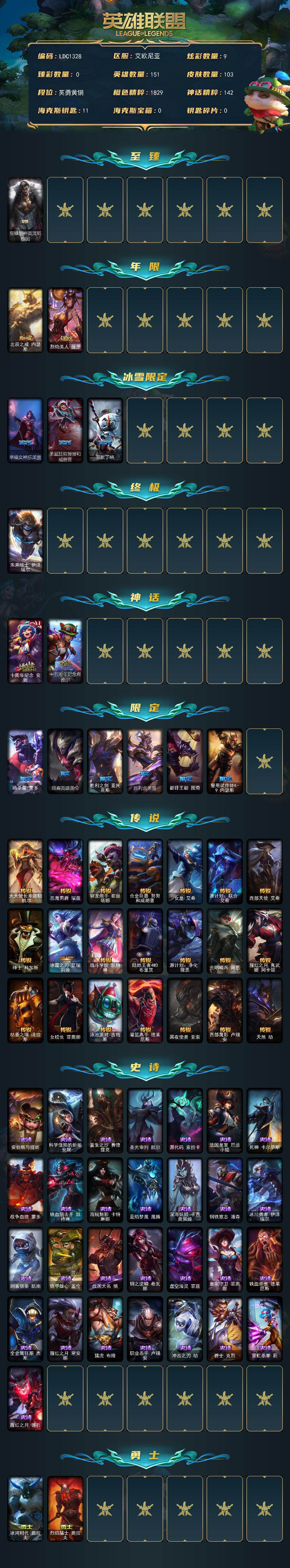 【100442】【LDC1328】151英雄/103皮肤/1终极/3神话/11限定/9炫彩/21传说/29史诗/青铜账号等级:402/至臻狼神英灵斯维因/北辰之威内瑟斯/烈焰美人薇恩/幸福女神乐芙兰/圣诞狂欢努努和威朗普/雪默丁格/未来战士伊泽瑞尔/十周年纪念安妮/十五周年纪念希维尔/暗杀星蒙多/暗裔英雄盖伦/胜利之剑亚托克斯/胜利剑圣易/都铎王朝图奇/警用试作体K-9内瑟斯/大天使长米迦勒凯尔