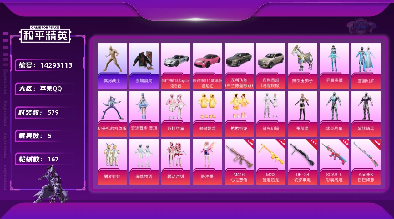 【100937】【不可二次】【苹果QQ】龟仙人 木乃伊 雪国梦幻 宾利添越(浅瞪羚棕) 酣梦娃娃 狂沙舞者 极速红龙 AKM-熔岩统帅 赤蝎幽灵 Mini14-林间仙鹿 雪国幻梦 海盐物语 SCAR-L-彩装战姬 M249-彩虹甜喵 GROZA-林间仙鹿 M416-心之恋语 粉红小猪 馨动时刻 MG3-酷泡奶龙 照夜玉狮子 紫螳螂 浪漫天命 镜光幻境飞行翼 激萌罗小黑
