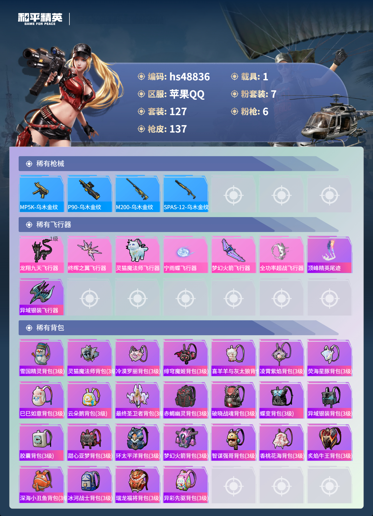 【100973】【不可二次】【苹果QQ】雪国梦幻 漫步者 迷蝶贵族 都市猎人 M762-瑞龙福将 全功率超战飞行器 狂沙舞者 龙翔九天飞行器 赤蝎幽灵 雪国幻梦 梦幻火箭 粉红小猪 瑞龙福将 紫螳螂 醒狮腾龙 浪漫天命 SCAR-L-青春物语 梦幻火箭飞行器 暗影哥特 团圆交子