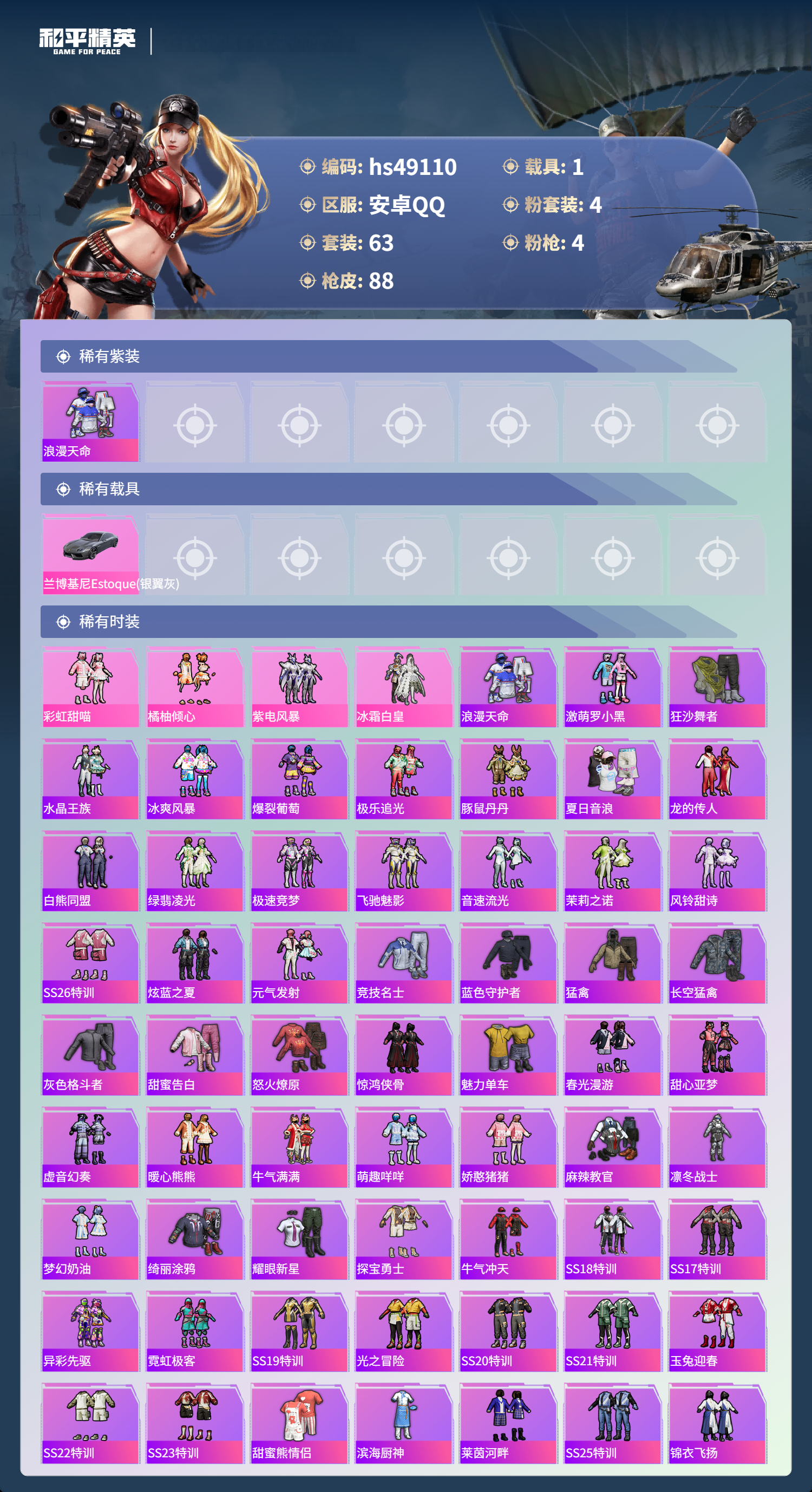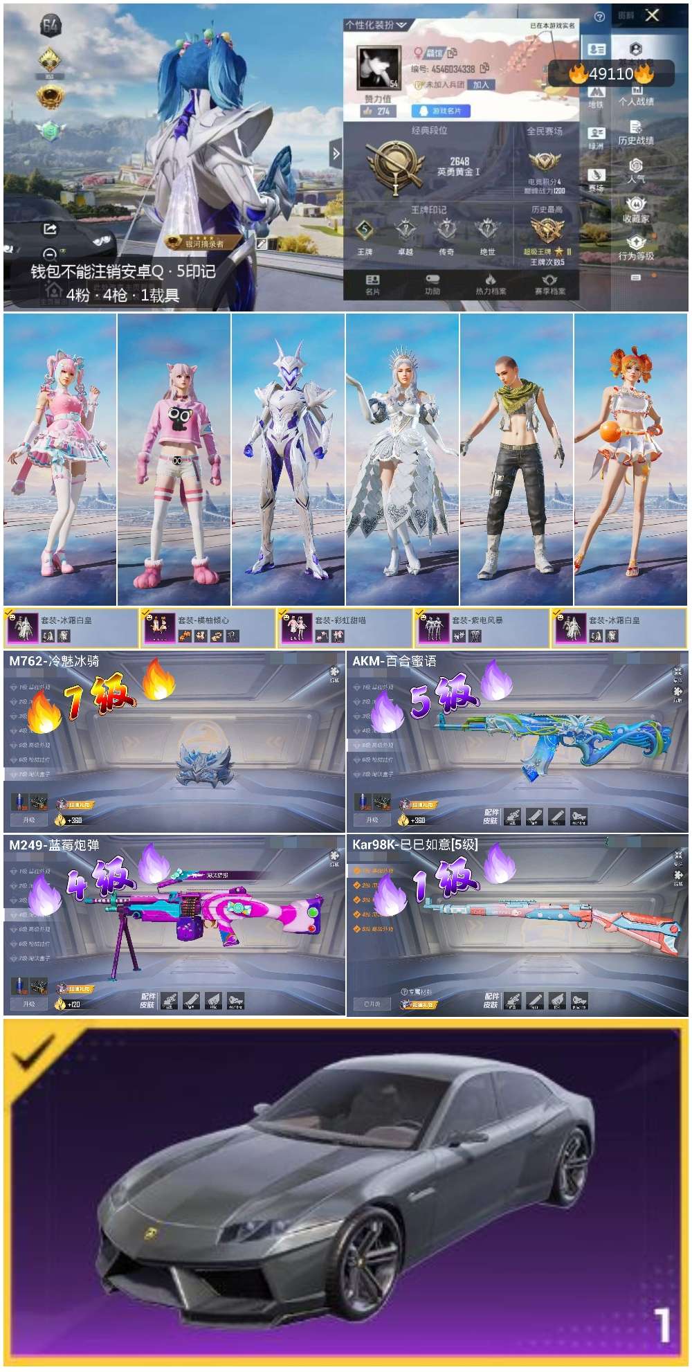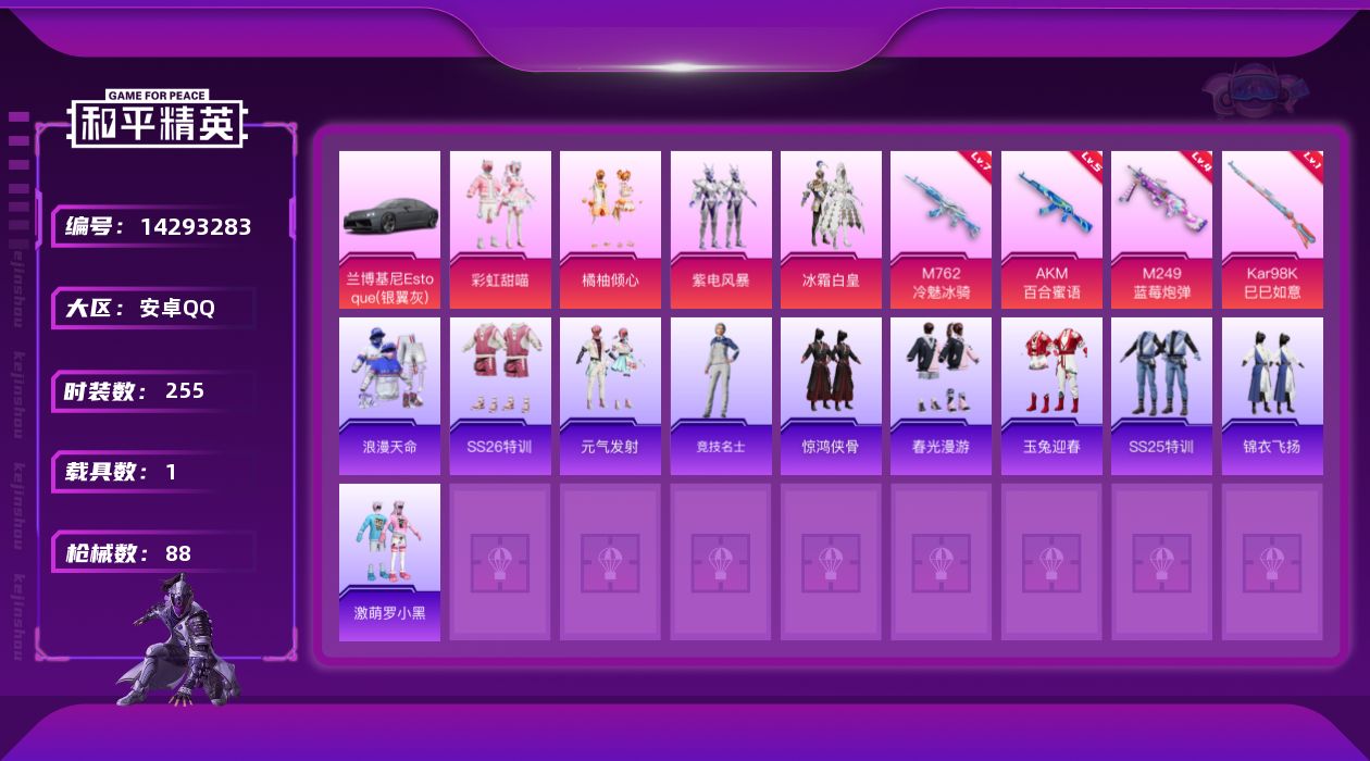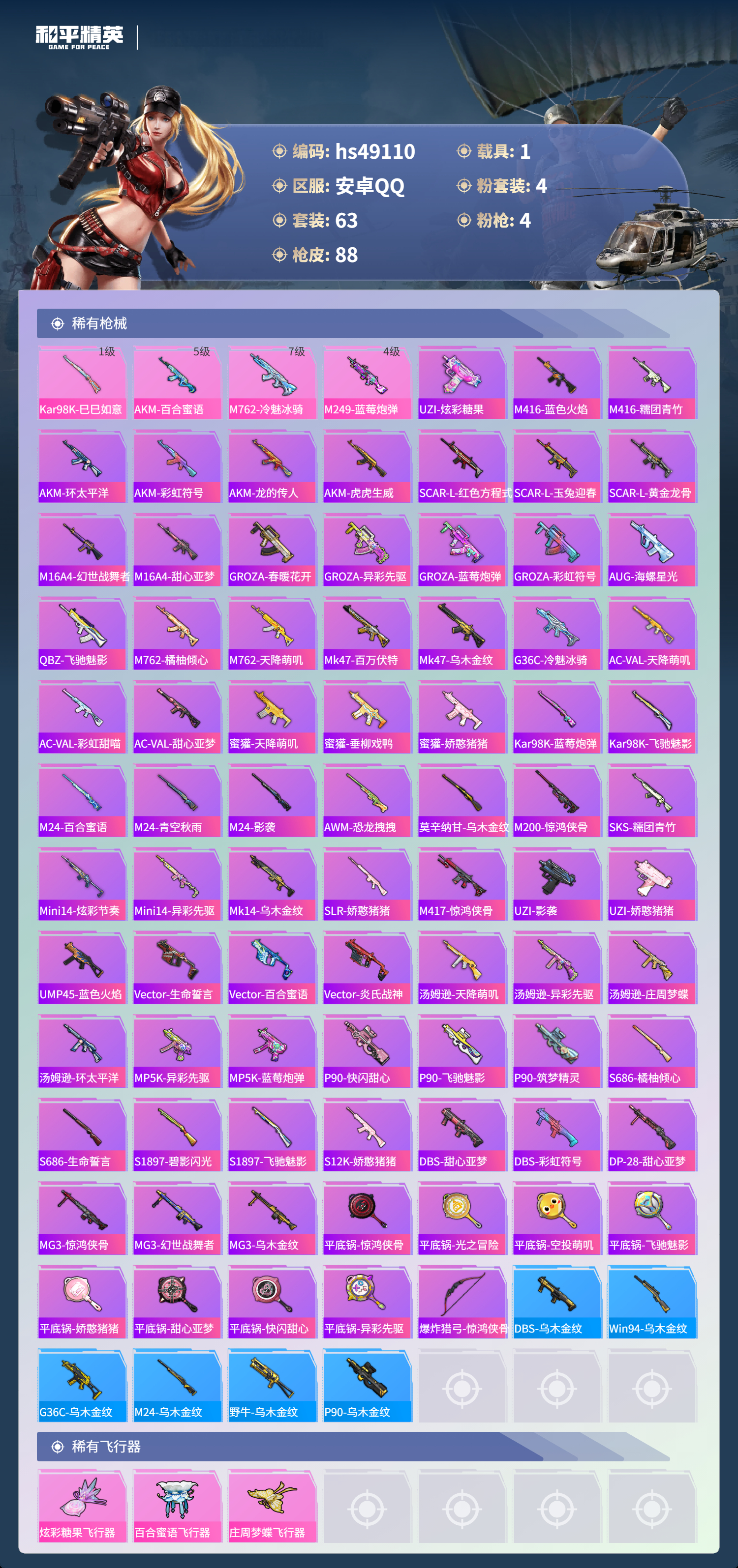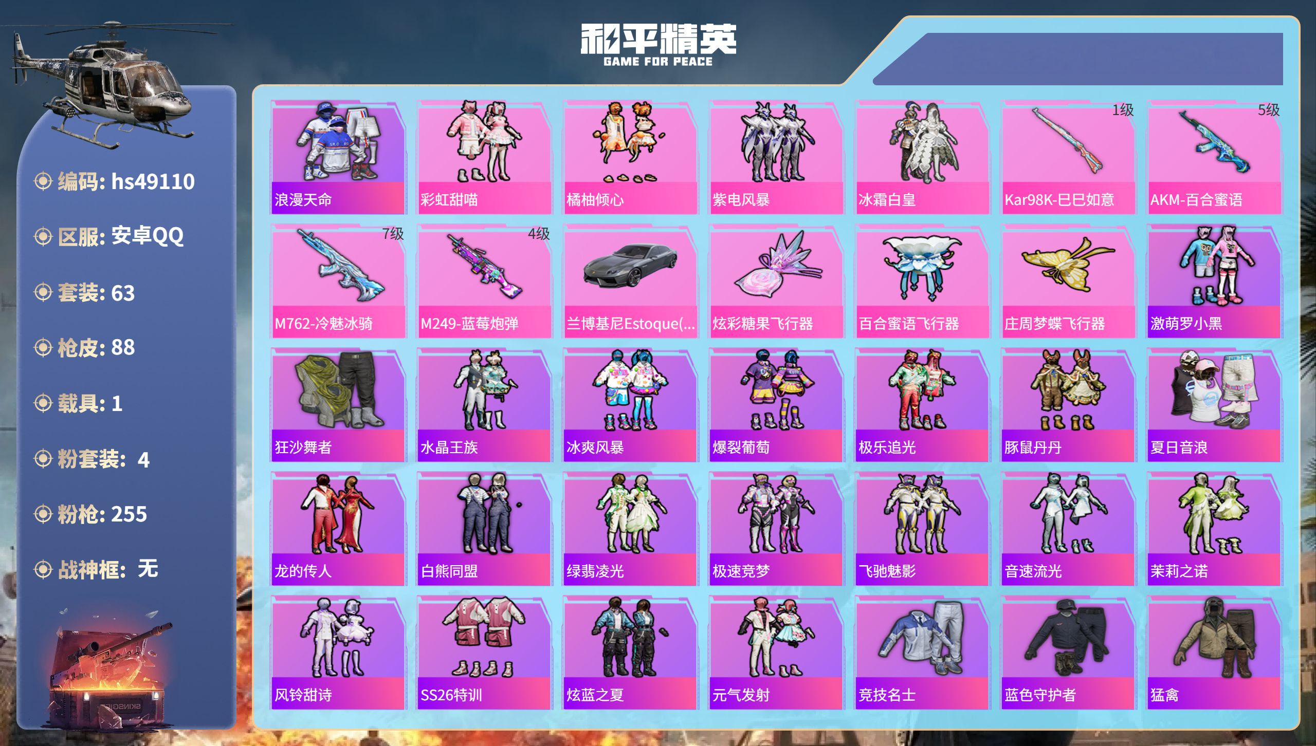 【101035】【可二次】【安卓QQ】紫电风暴 庄周梦蝶飞行器 M249-蓝莓炮弹 百合蜜语飞行器 兰博轿车灰色 狂沙舞者 浪漫天命 豚鼠丹丹 AKM-百合蜜语 冰霜白皇 激萌罗小黑 M762-冷魅冰骑
