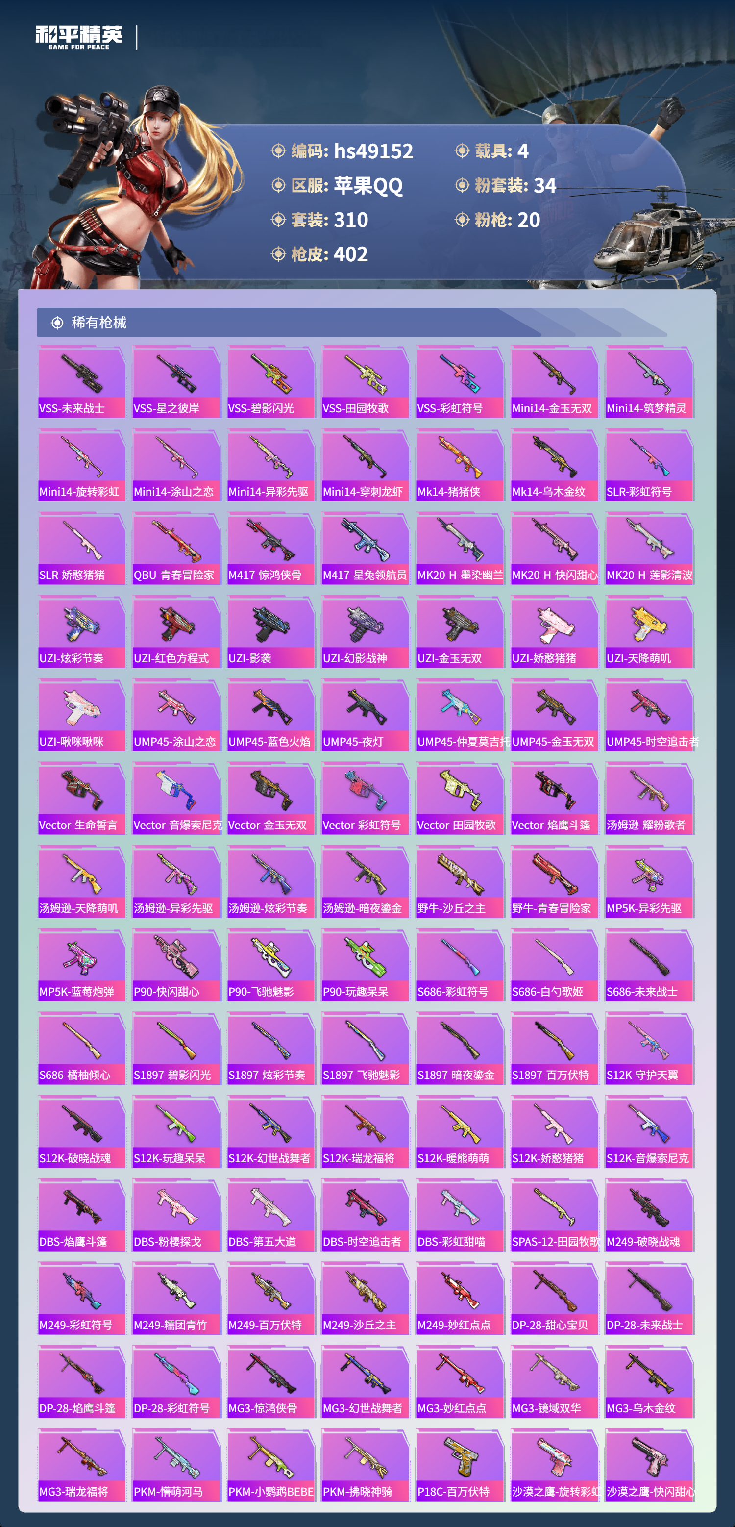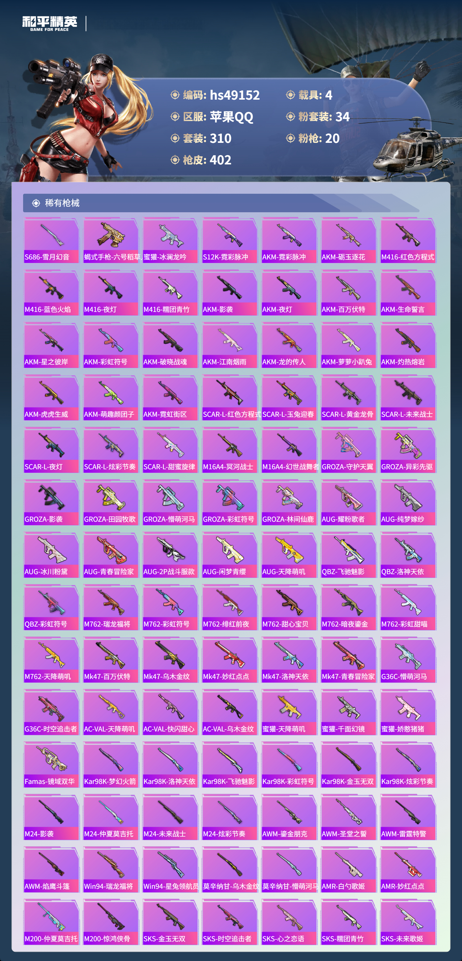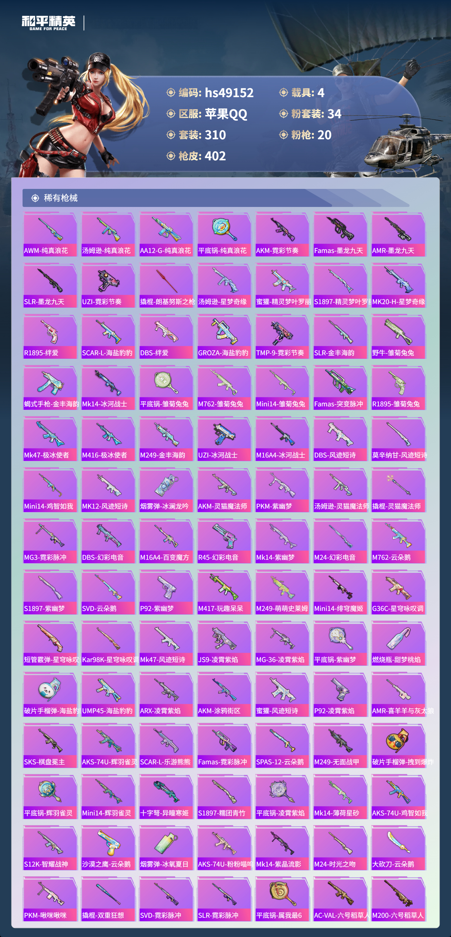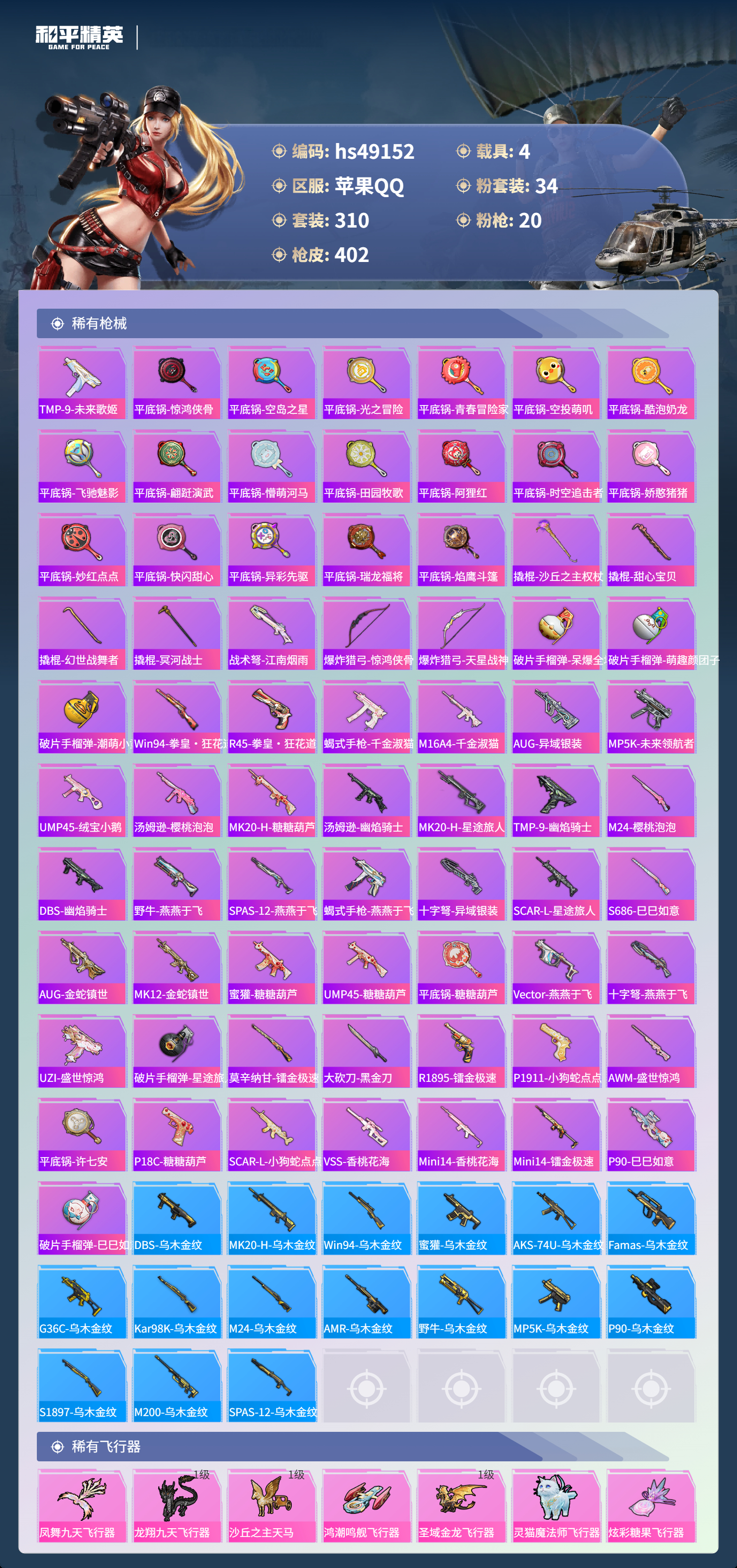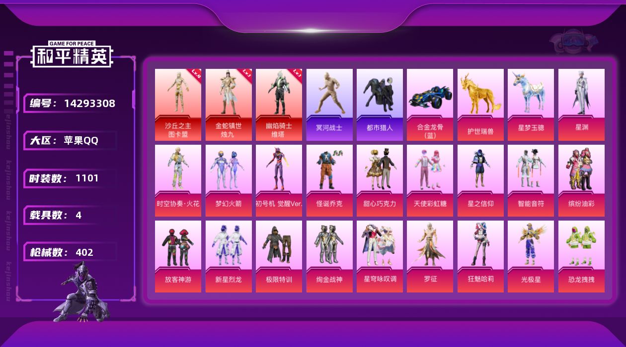 【101051】【可二次】【苹果QQ】合金龙骨蓝色 龟仙人 恐龙拽拽 水银刺客 漫步者 都市猎人 忍者信条 沙丘之主-图卡盟 M416-至情至圣 GROZA-林间仙鹿 缤纷油彩 智能音符 M416-超新星 星之信仰 怪诞乔克 M762-瑞龙福将 狂沙舞者 龙翔九天飞行器 音爆索尼克 SCAR-L-锦绣绵绵 AKM-炫紫旋律 AKM-梦之光华 星夜魔法师飞行翼 木乃伊 P90-金丰海韵 M416-