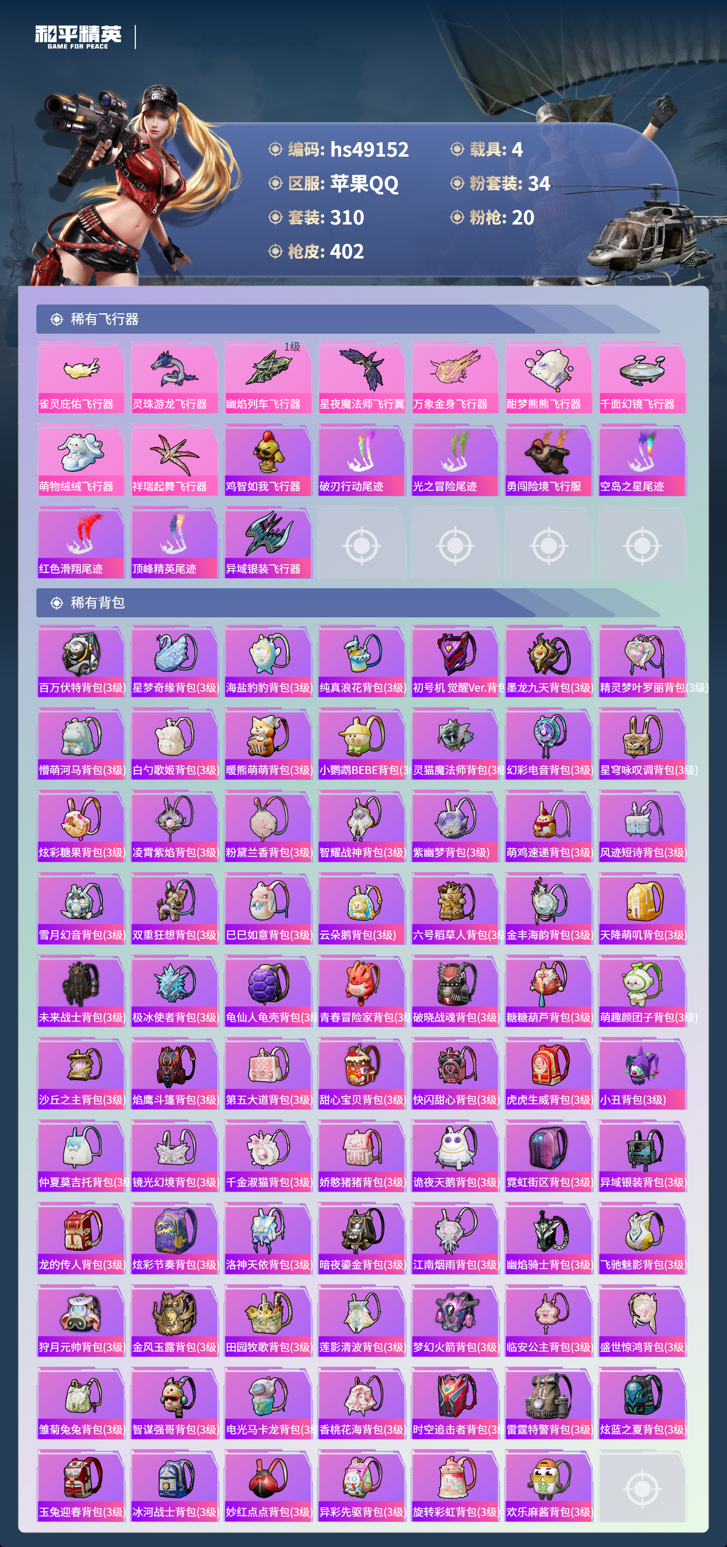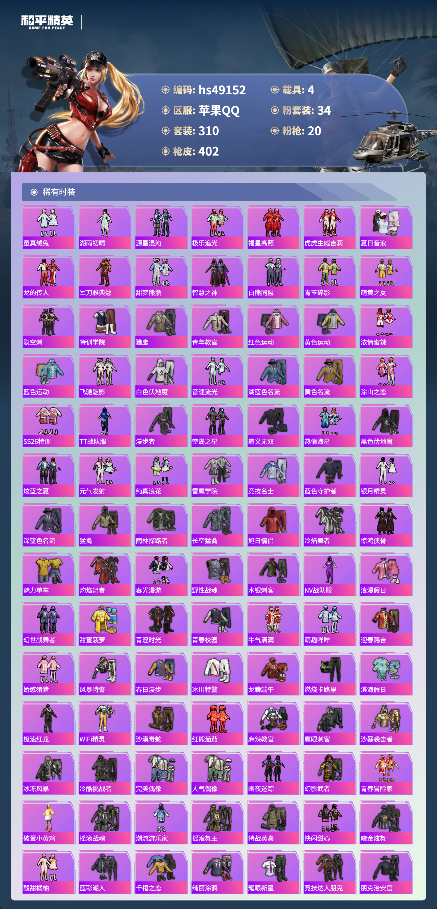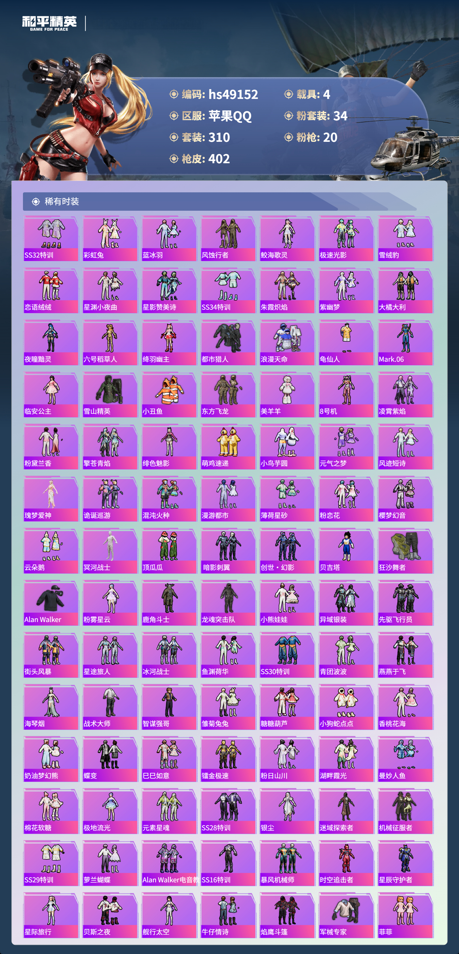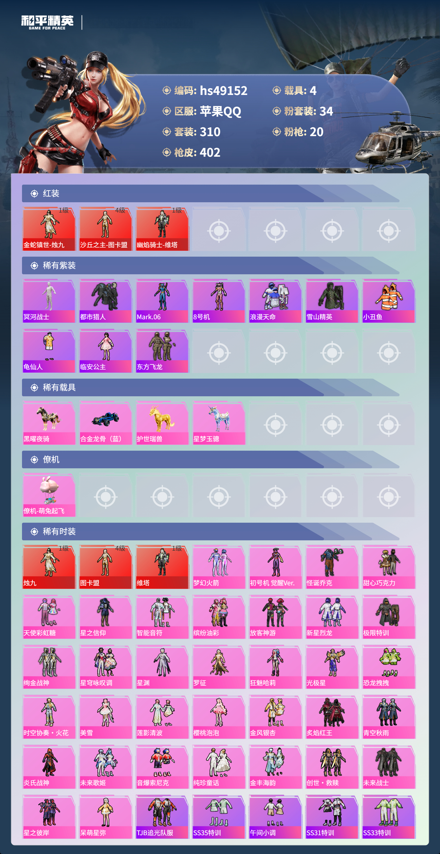 【101051】【可二次】【苹果QQ】合金龙骨蓝色 龟仙人 恐龙拽拽 水银刺客 漫步者 都市猎人 忍者信条 沙丘之主-图卡盟 M416-至情至圣 GROZA-林间仙鹿 缤纷油彩 智能音符 M416-超新星 星之信仰 怪诞乔克 M762-瑞龙福将 狂沙舞者 龙翔九天飞行器 音爆索尼克 SCAR-L-锦绣绵绵 AKM-炫紫旋律 AKM-梦之光华 星夜魔法师飞行翼 木乃伊 P90-金丰海韵 M416-