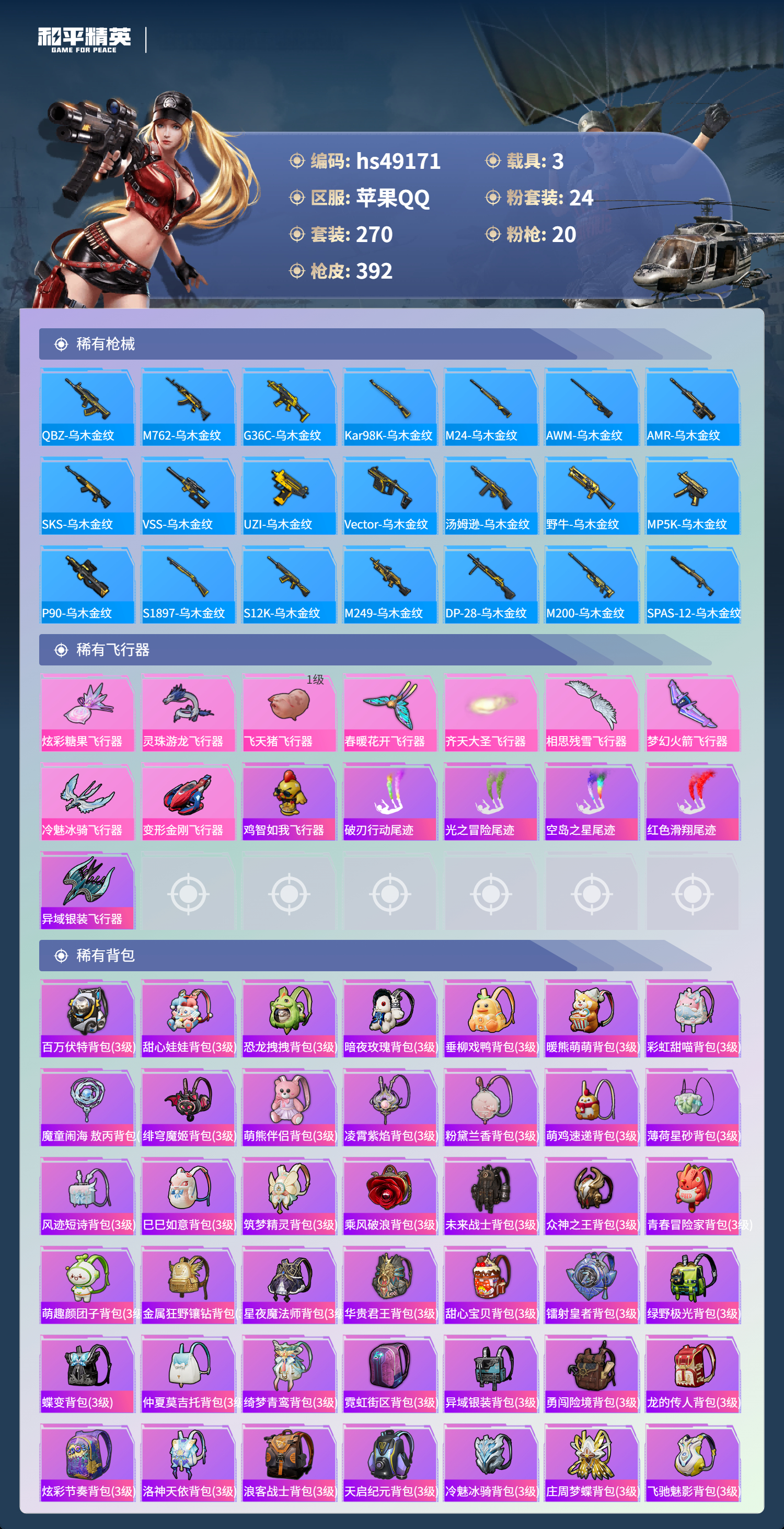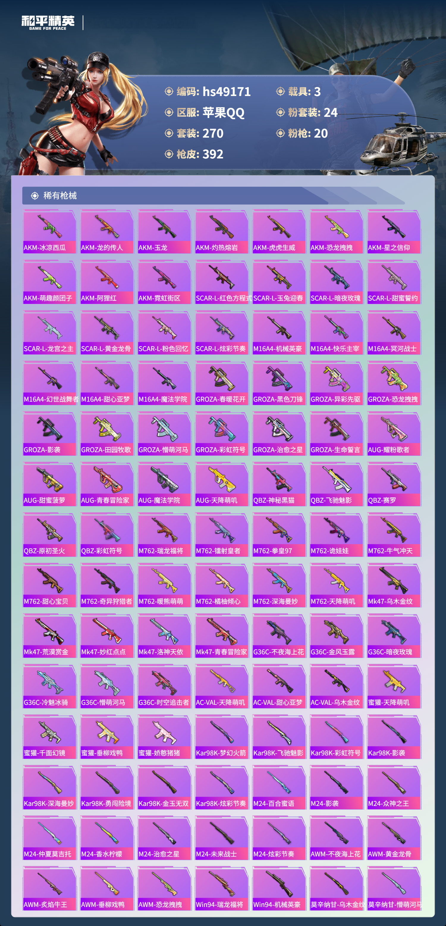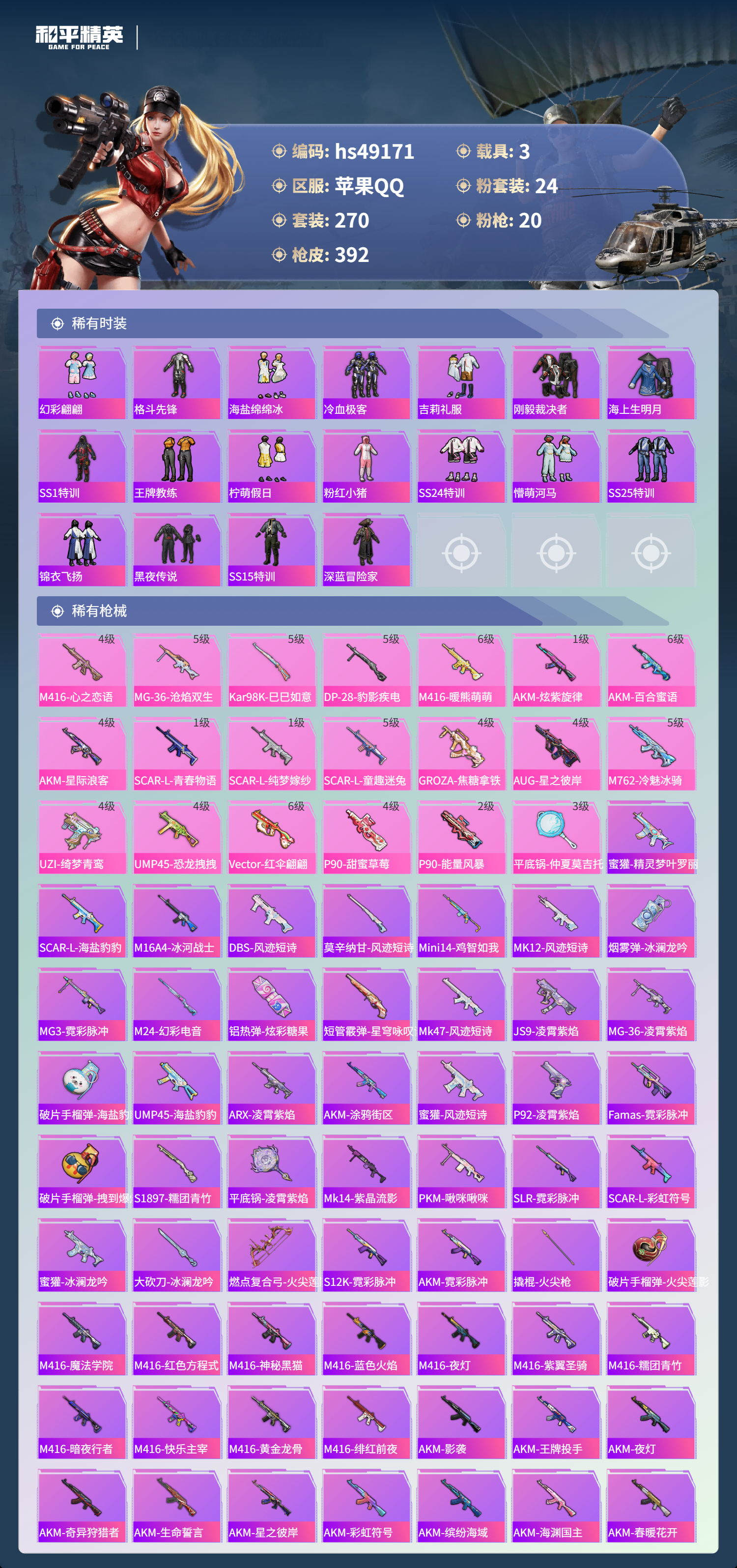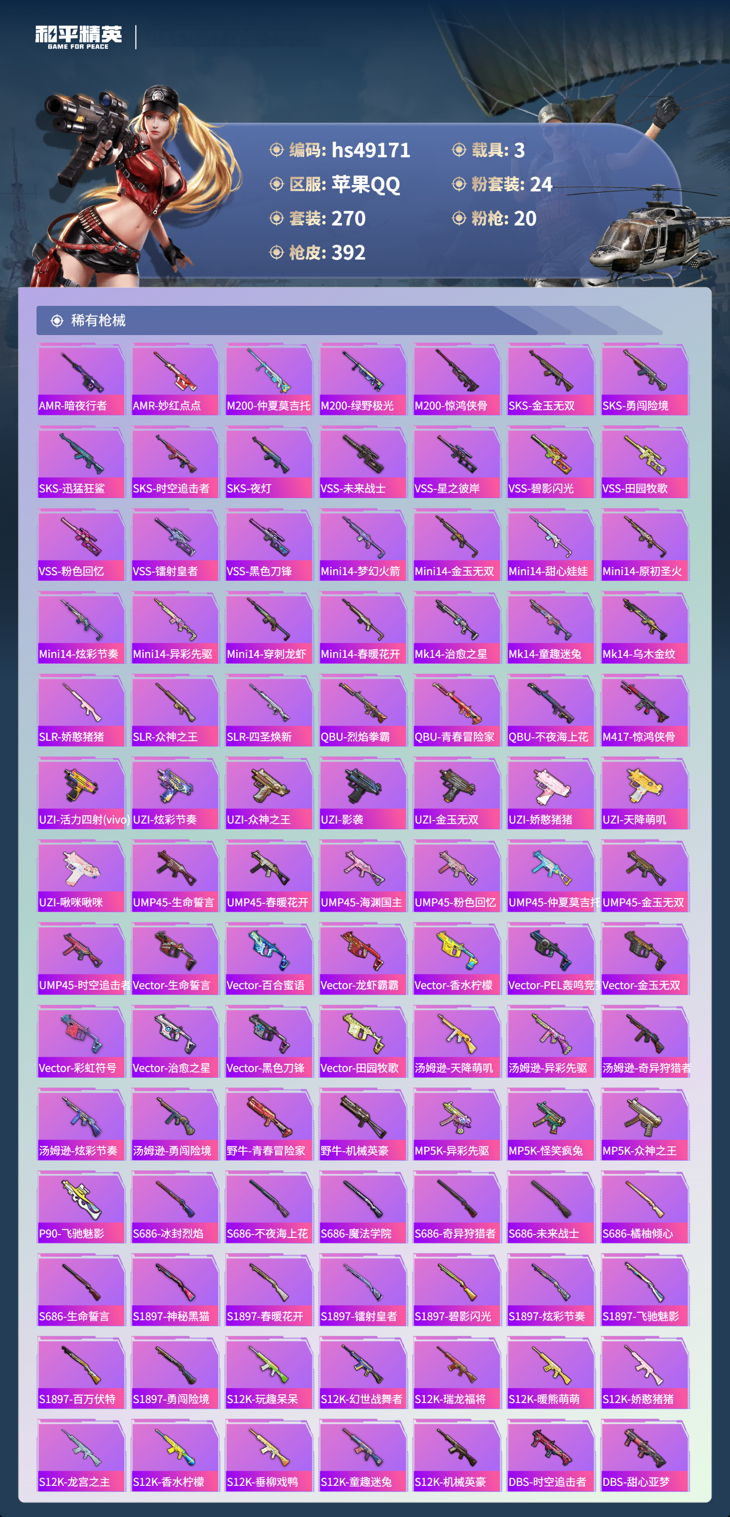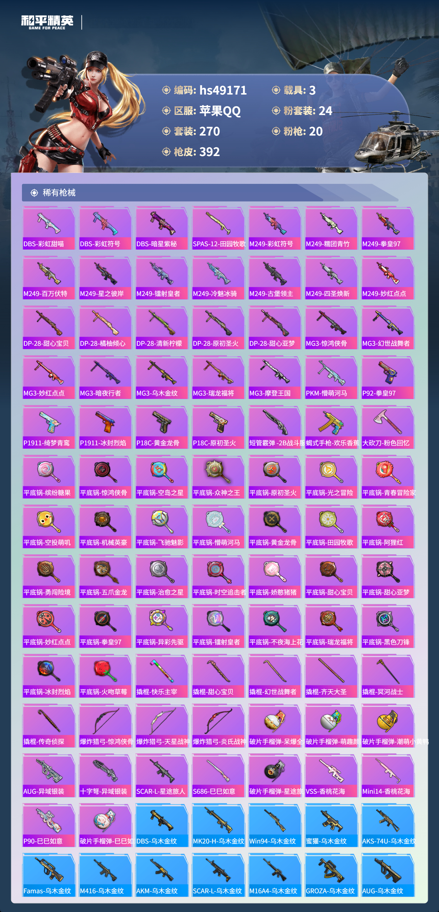 【101059】【不可二次】【苹果QQ】合金龙骨蓝色 龟仙人 恐龙拽拽 UZI-绮梦青鸾 水银刺客 AKM-星际浪客 漫步者 花间之火 都市猎人 M249-古堡领主 UMP45-恐龙拽拽 豚鼠丹丹 M762-奇异狩猎者 兰博轿车金色 M416-暖熊萌萌 M416-心之恋语 缤纷油彩 深海小丑鱼 SCAR-童趣迷兔 蝶舞迷情 迈凯伦570S 紫色 天之羽翼 AUG-星之彼岸 AWM-黄金龙骨 纯白