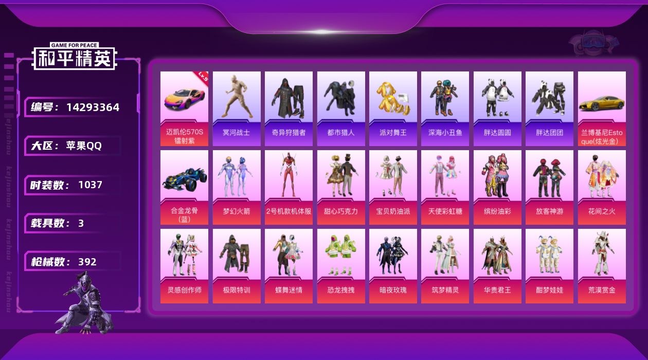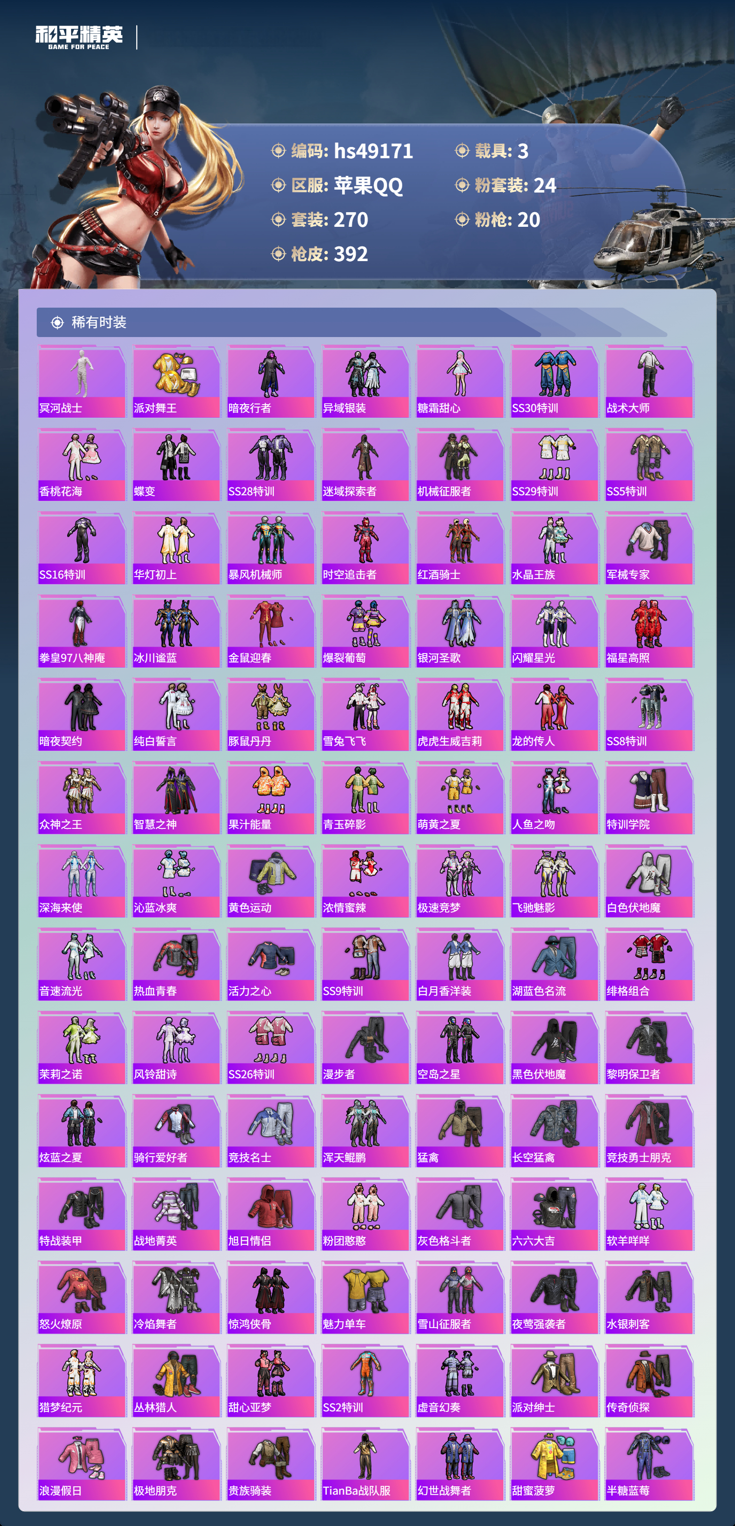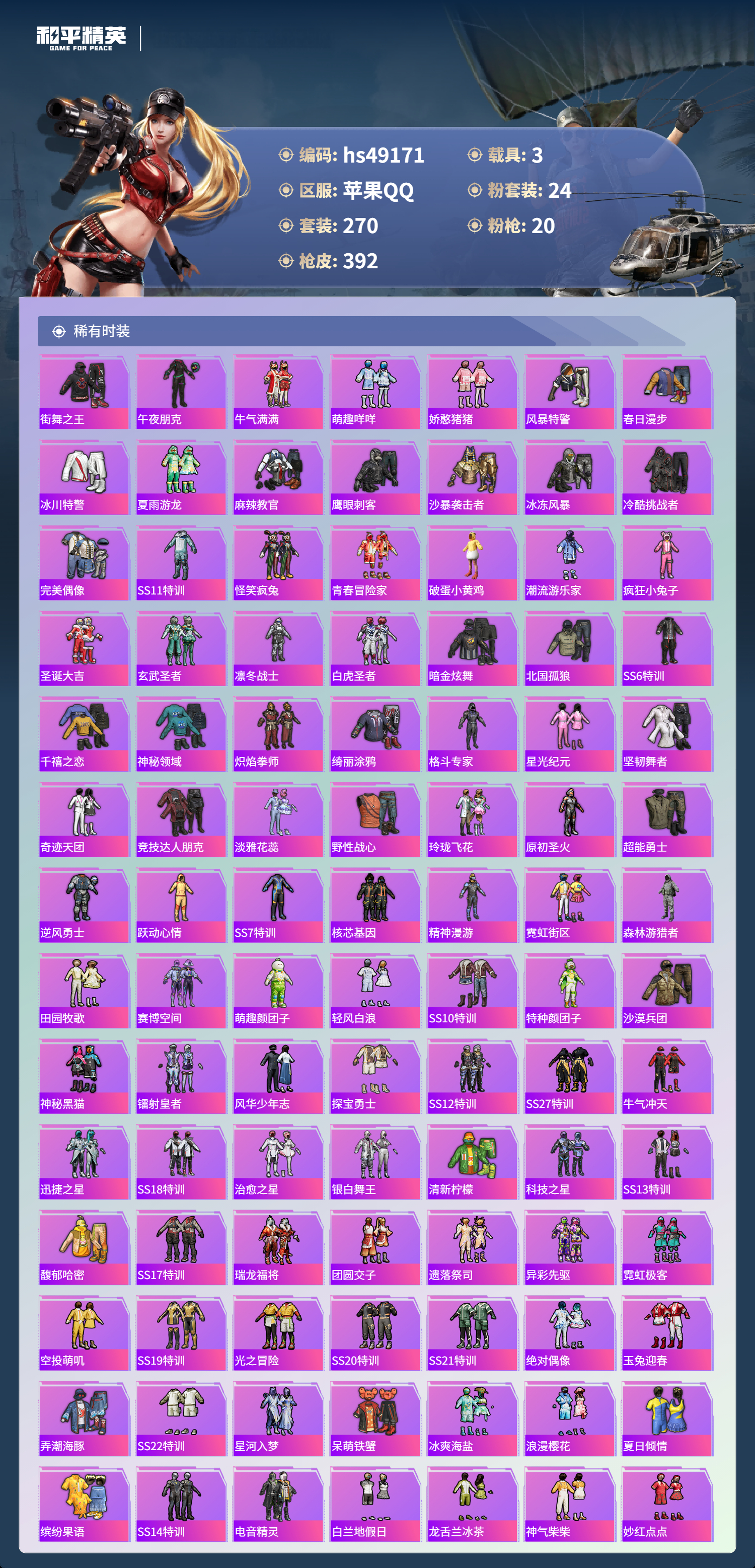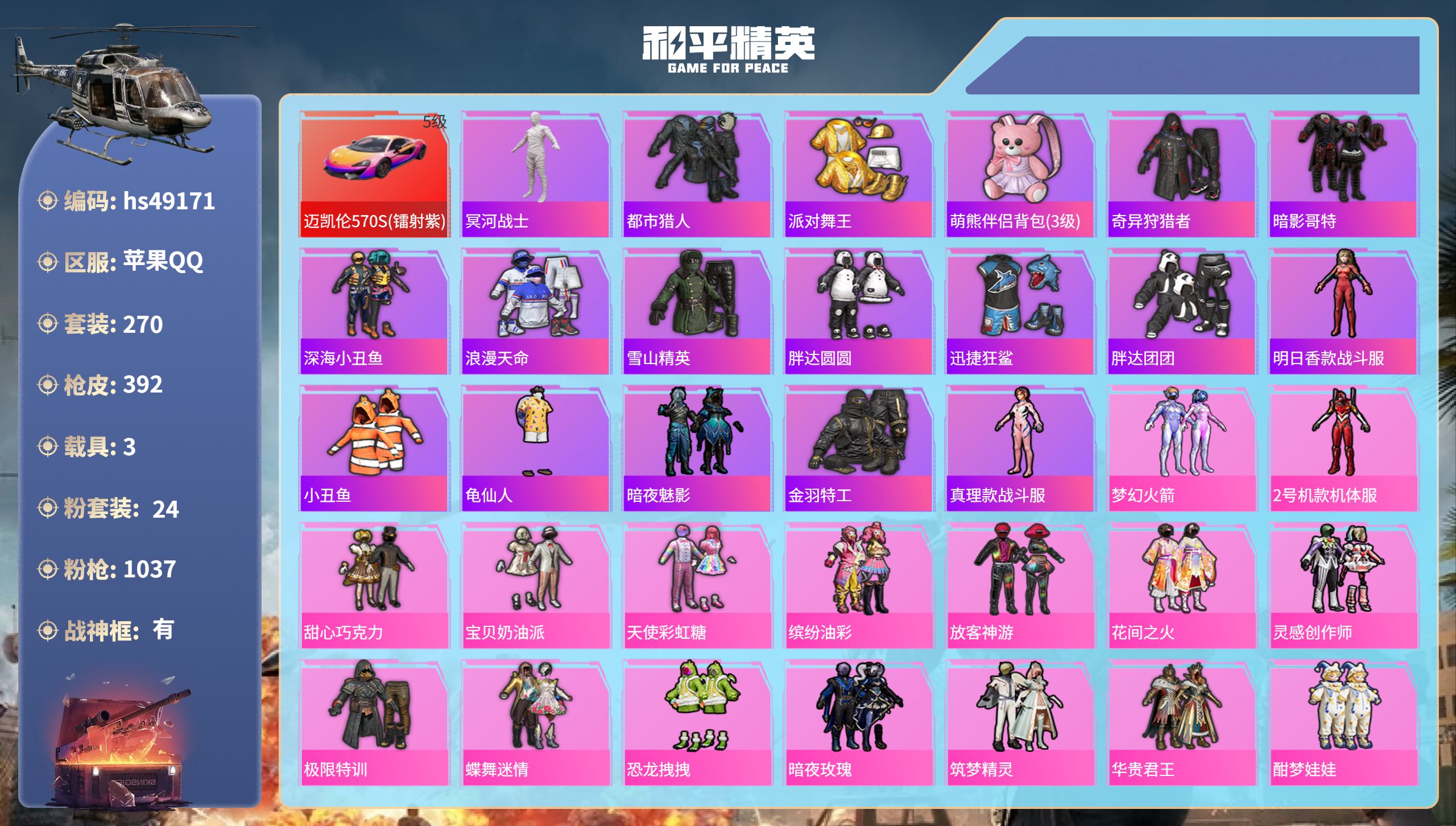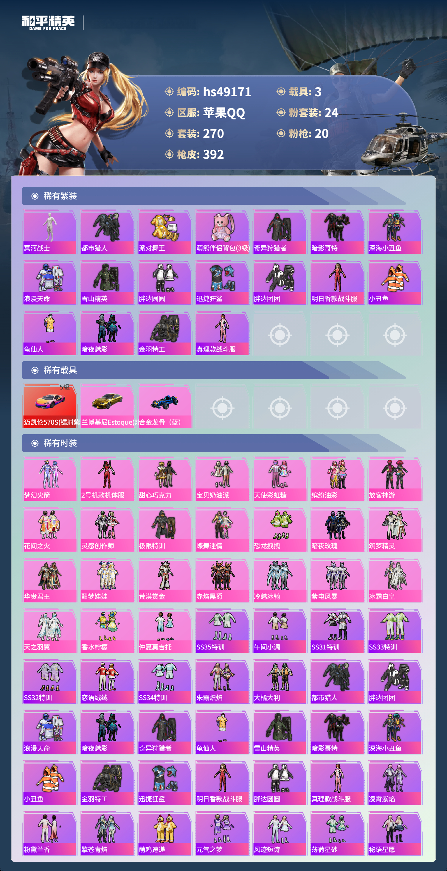 【101059】【不可二次】【苹果QQ】合金龙骨蓝色 龟仙人 恐龙拽拽 UZI-绮梦青鸾 水银刺客 AKM-星际浪客 漫步者 花间之火 都市猎人 M249-古堡领主 UMP45-恐龙拽拽 豚鼠丹丹 M762-奇异狩猎者 兰博轿车金色 M416-暖熊萌萌 M416-心之恋语 缤纷油彩 深海小丑鱼 SCAR-童趣迷兔 蝶舞迷情 迈凯伦570S 紫色 天之羽翼 AUG-星之彼岸 AWM-黄金龙骨 纯白