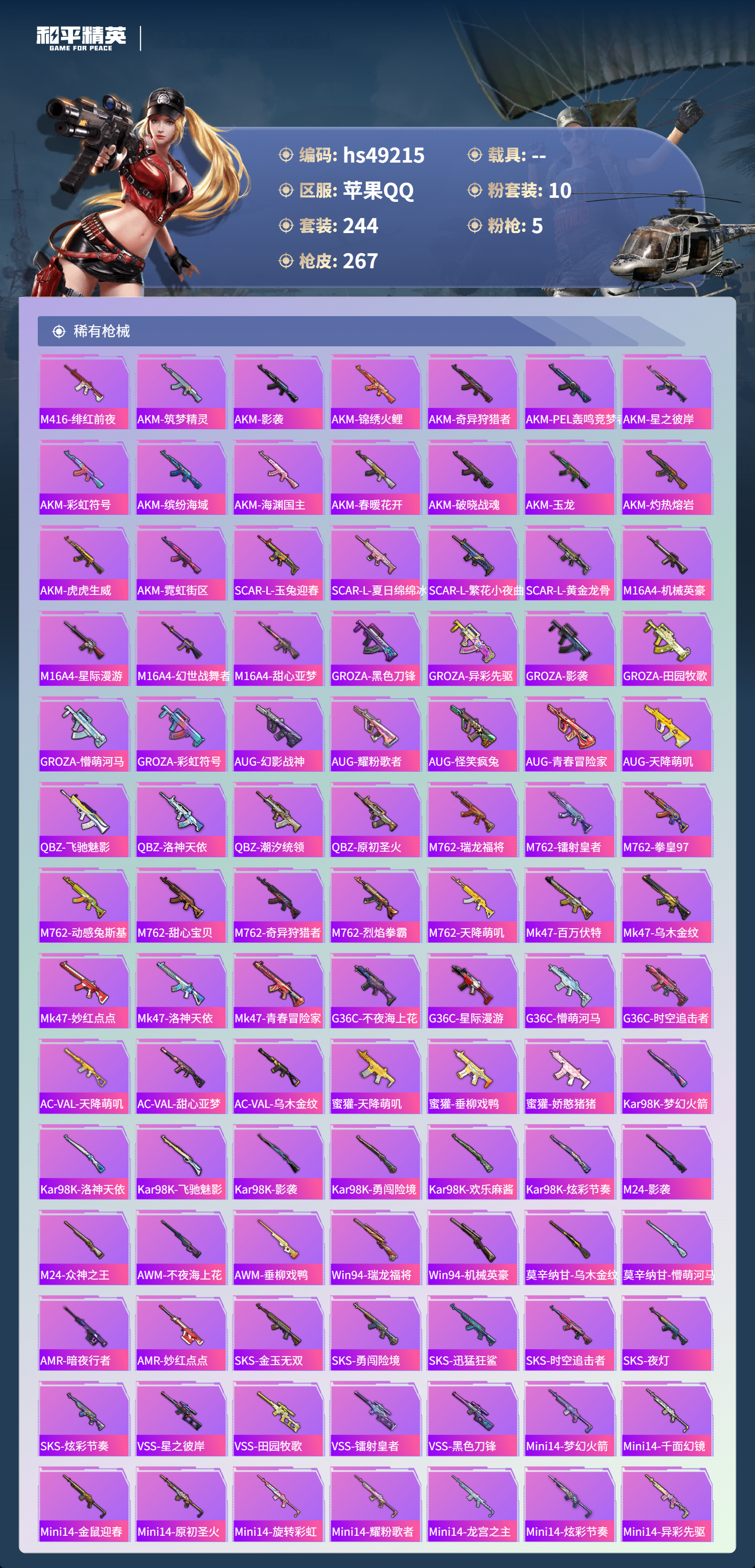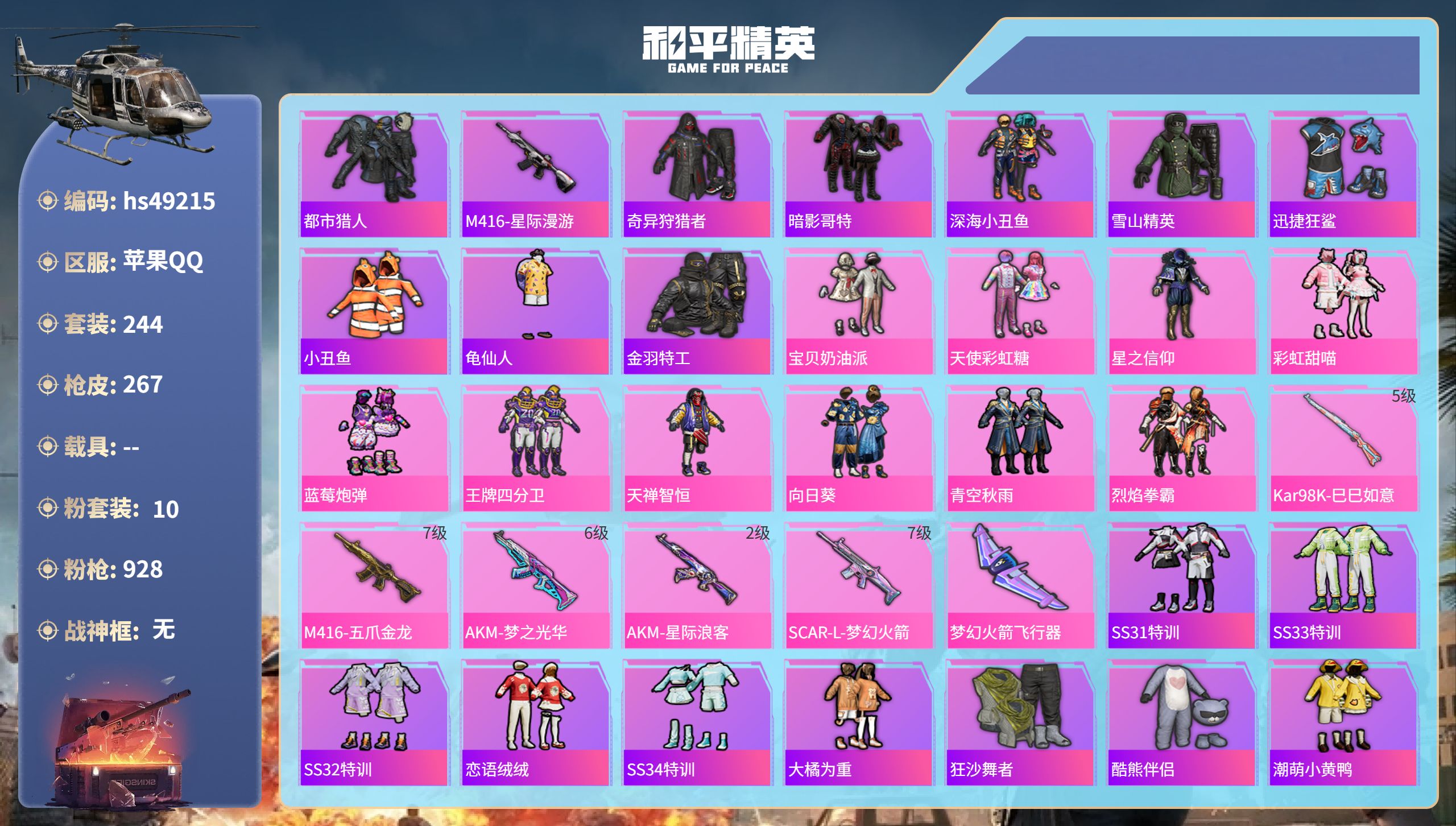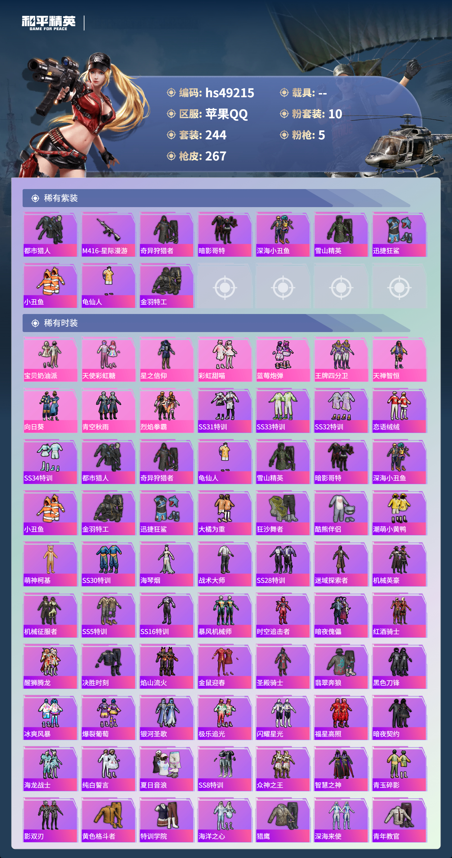 【101064】【可二次】【苹果QQ】龟仙人 大橘为重 AKM-星际浪客 王牌四分卫 漫步者 M416-星际漫游 都市猎人 M249-古堡领主 M762-奇异狩猎者 M416-仓鼠灰灰 深海小丑鱼 影双刃 醒狮腾龙 纯白誓言 AKM-奇异狩猎者 星之信仰 SCAR-L-梦幻火箭 VSS-烈焰拳霸 迅捷狂鲨 M762-瑞龙福将 潮萌小黄鸭 黑色刀锋 海洋之心 狂沙舞者 金羽特工 白月香洋装 AKM