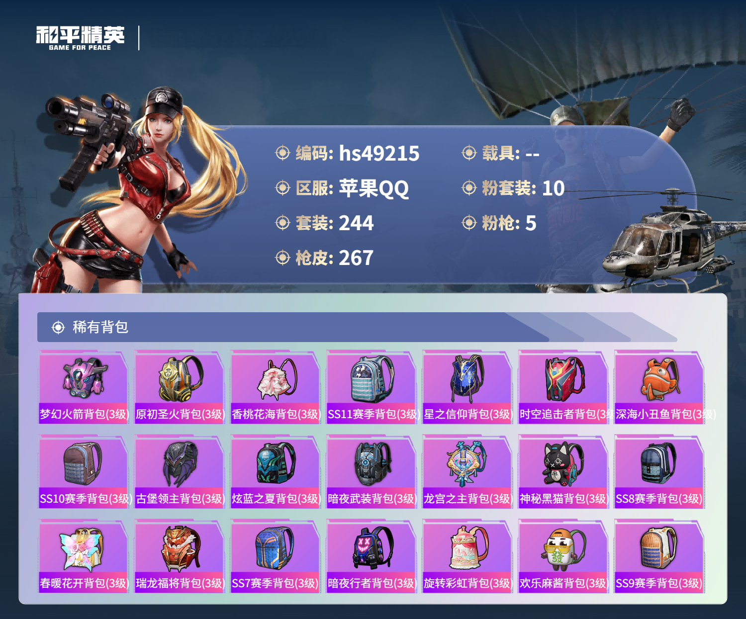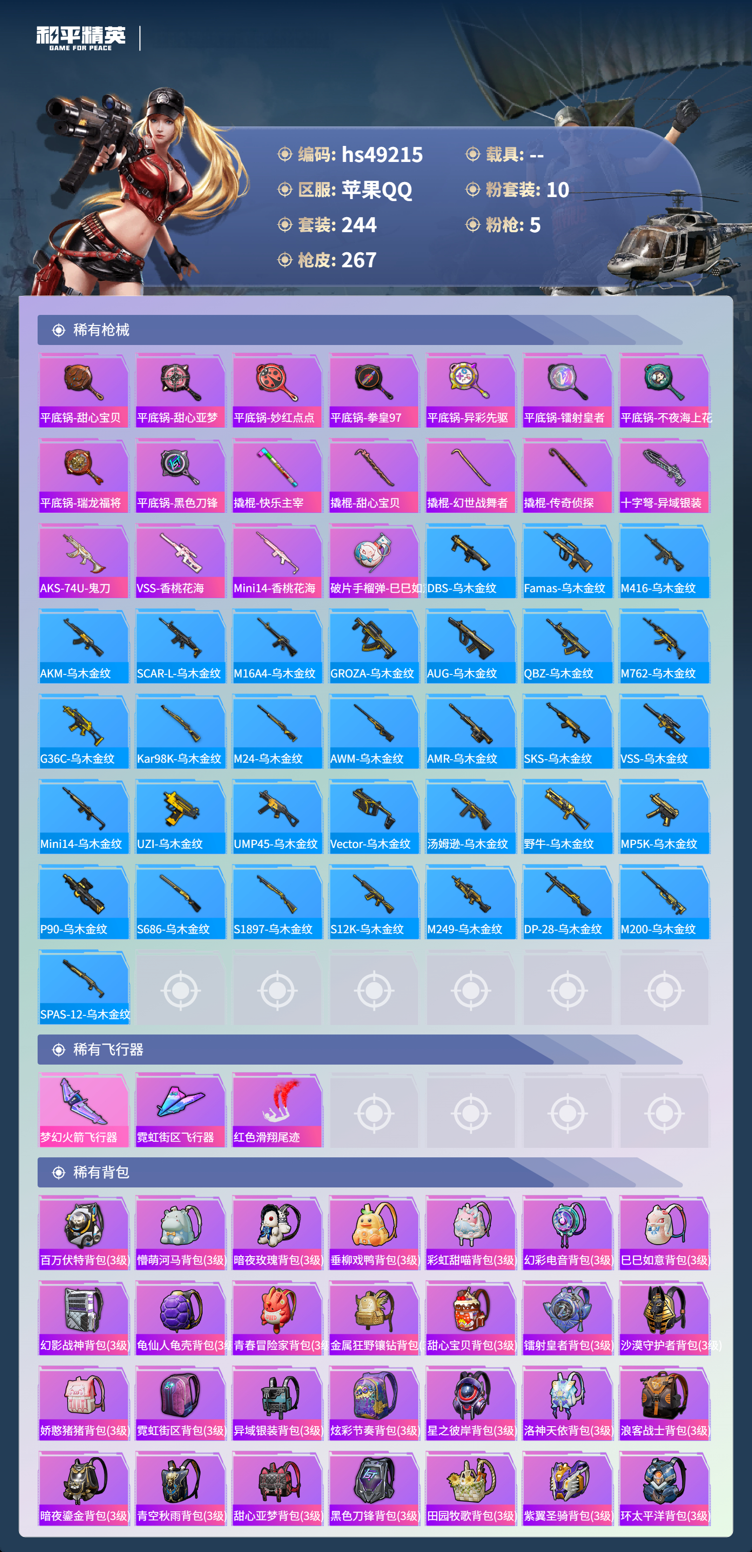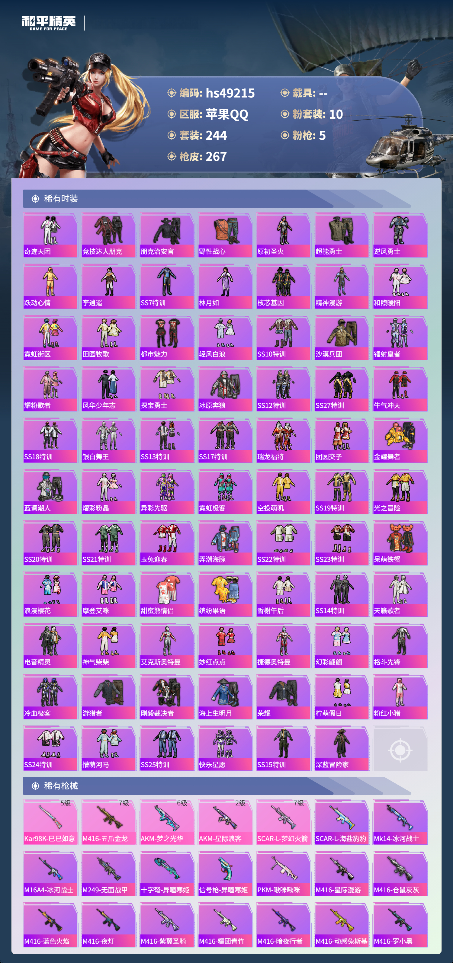 【101064】【可二次】【苹果QQ】龟仙人 大橘为重 AKM-星际浪客 王牌四分卫 漫步者 M416-星际漫游 都市猎人 M249-古堡领主 M762-奇异狩猎者 M416-仓鼠灰灰 深海小丑鱼 影双刃 醒狮腾龙 纯白誓言 AKM-奇异狩猎者 星之信仰 SCAR-L-梦幻火箭 VSS-烈焰拳霸 迅捷狂鲨 M762-瑞龙福将 潮萌小黄鸭 黑色刀锋 海洋之心 狂沙舞者 金羽特工 白月香洋装 AKM
