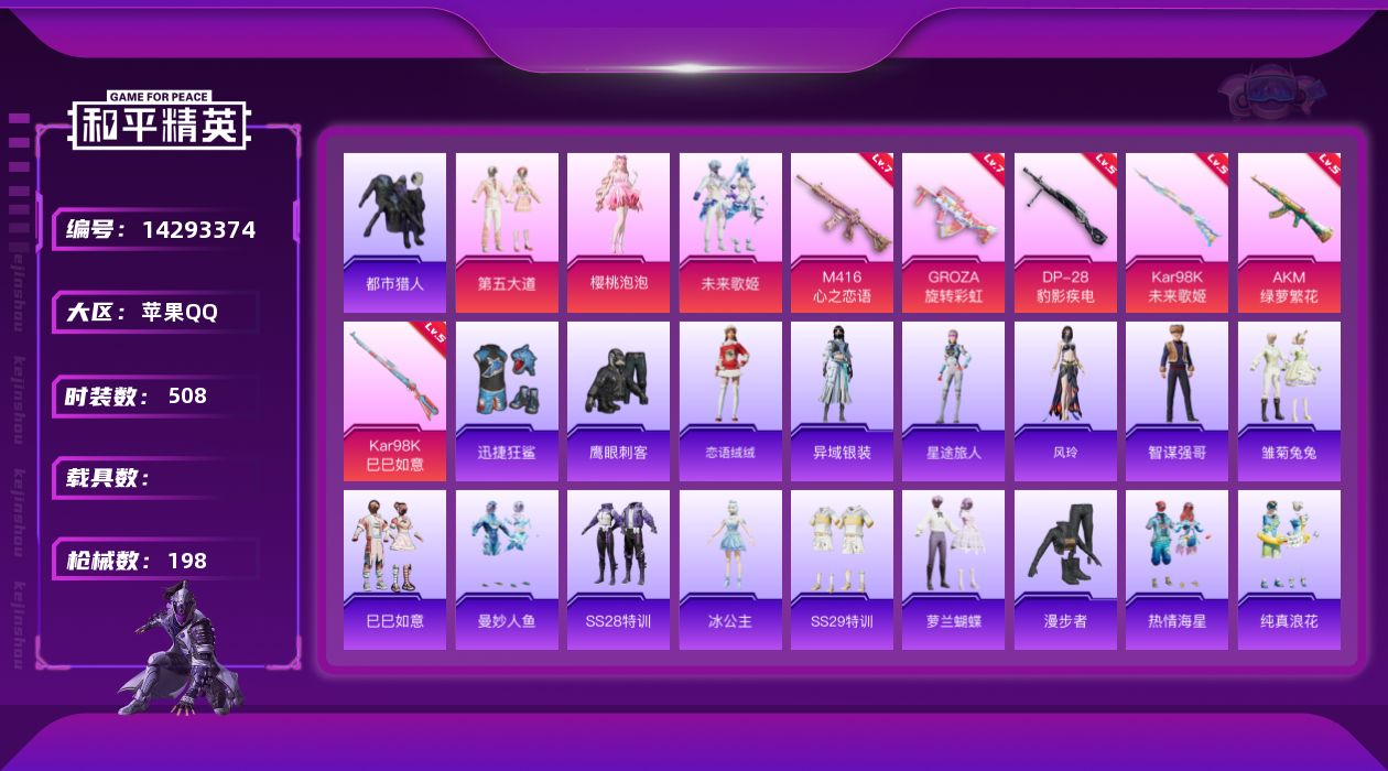 【101065】【不可二次】【苹果QQ】龟仙人 AKM-绿萝繁花 漫步者 都市猎人 迅捷狂鲨 M24-奇异狩猎者 齐天大圣飞行器 千面幻镜飞行器 豚鼠丹丹 Kar98k-未来歌姬 M762-奇异狩猎者 M416-心之恋语 GROZA-旋转彩虹