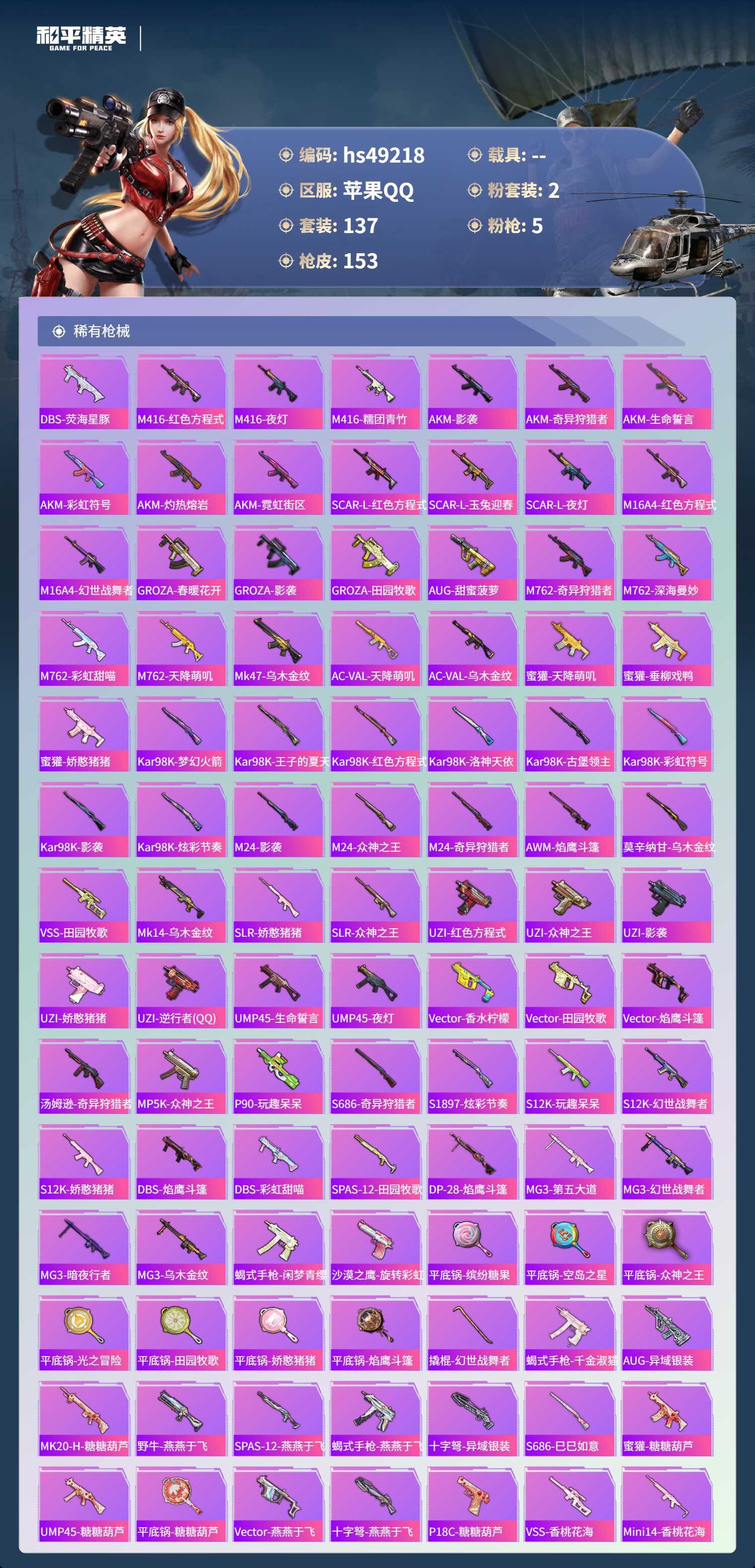 【101066】【可二次】【苹果QQ】龟仙人 S686-奇异狩猎者 漫步者 都市猎人 奇异狩猎者 M24-奇异狩猎者 极速红龙 平底锅-仲夏莫吉托 M762-奇异狩猎者 M416-电玩时刻 UMP45-量子极限 深海小丑鱼 派对舞王 浪漫天命 AKM-奇异狩猎者