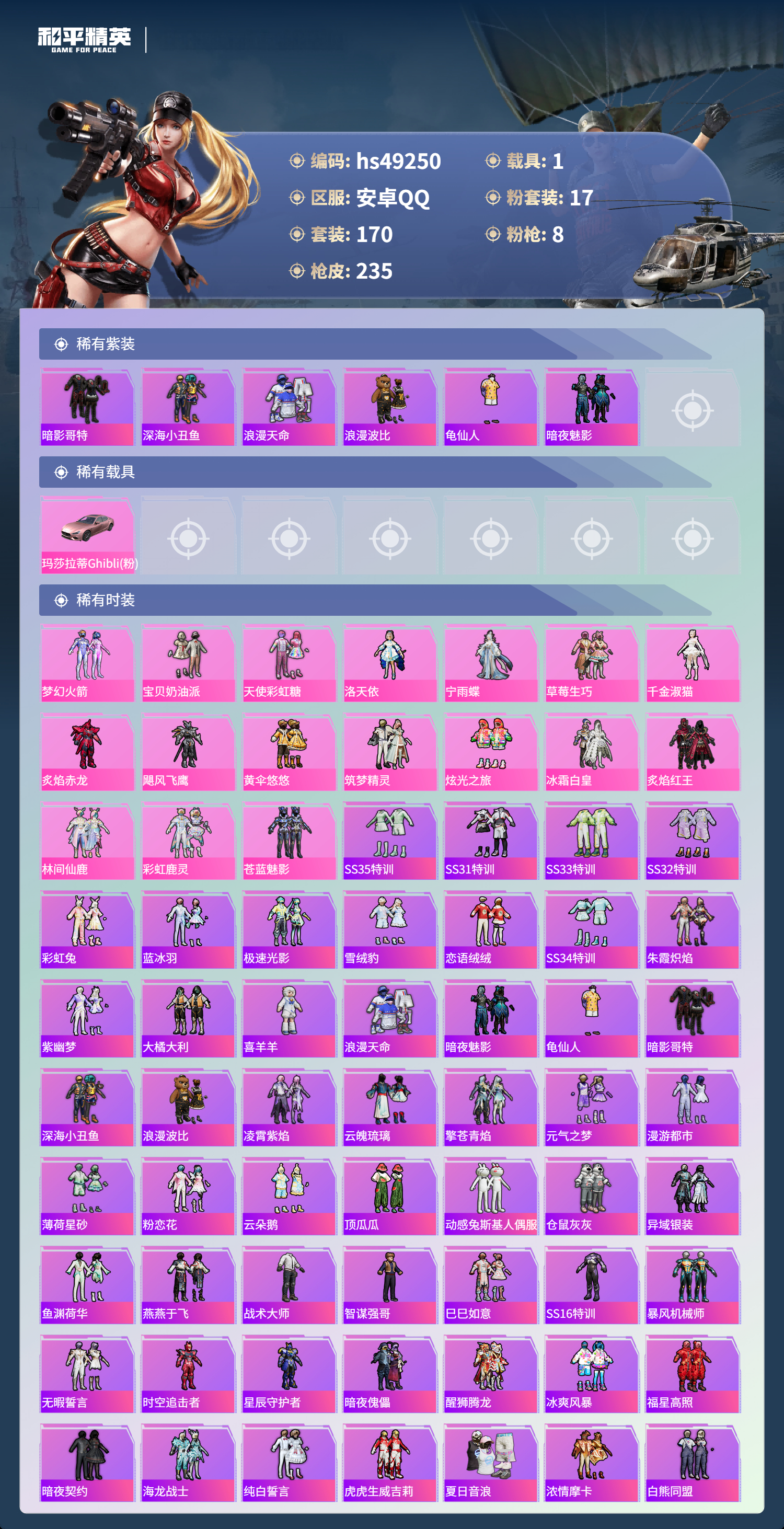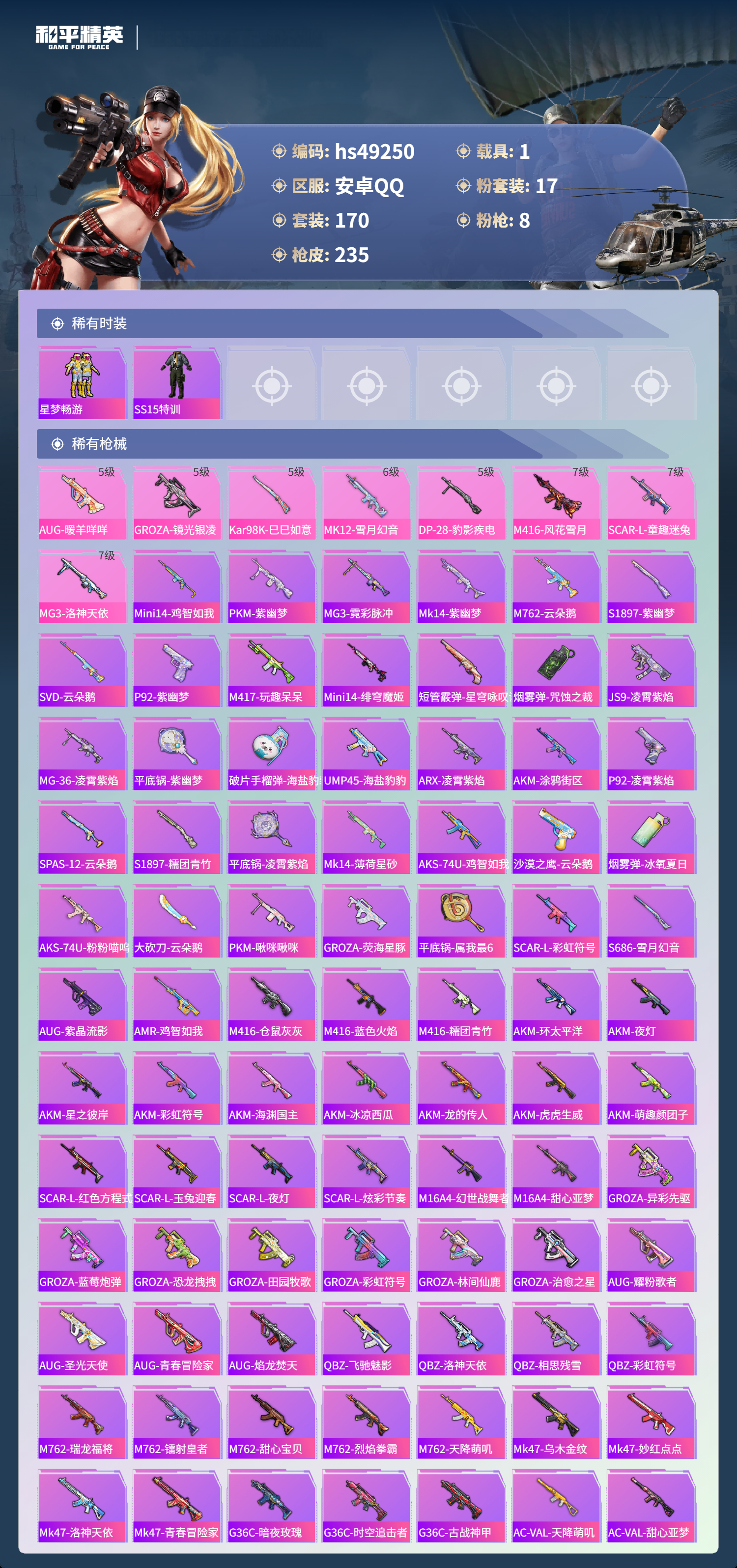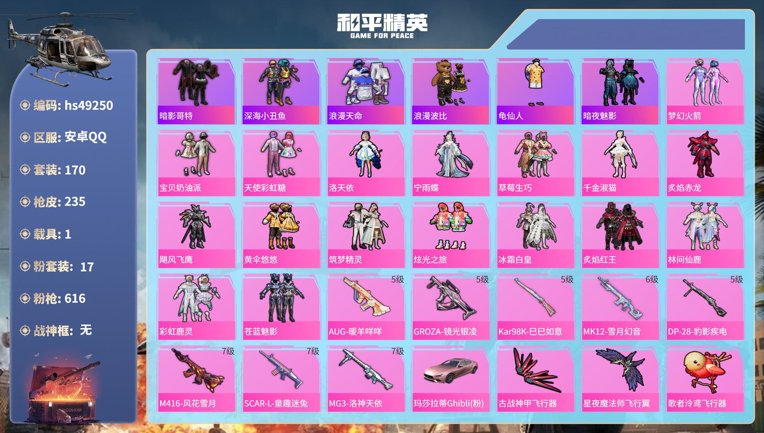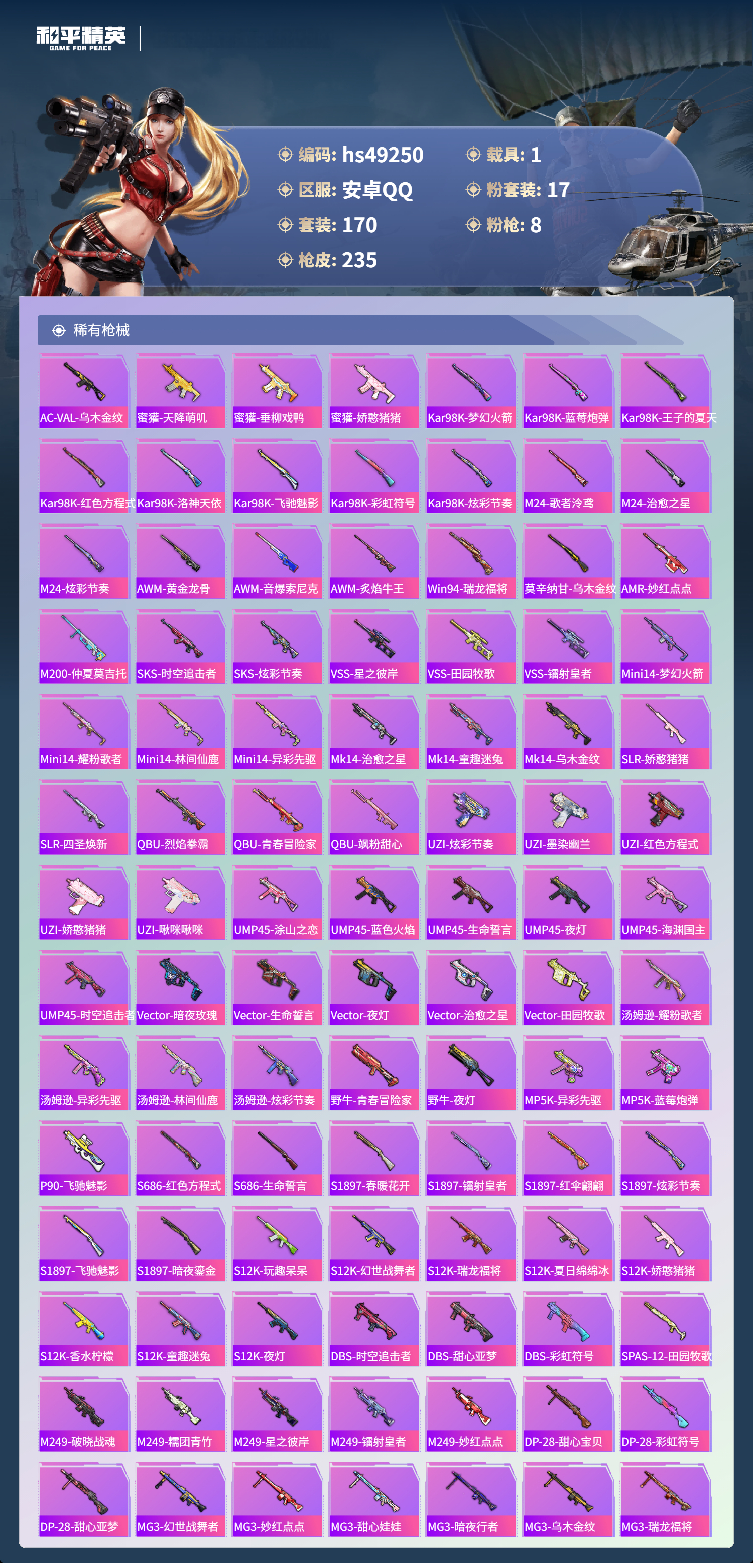 【101070】【不可二次】【安卓QQ】灵绣 龟仙人 炙焰赤龙 炙焰红王 苍蓝魅影 红伞翩翩飞行器 洛天依 汤姆逊-林间仙鹿 林间仙鹿 梦起落英 Mini14-林间仙鹿 仓鼠灰灰 M416-仓鼠灰灰 GROZA-林间仙鹿 深海小丑鱼 浪漫波比 SCAR-童趣迷兔 瑞龙福将 醒狮腾龙 浪漫天命 AWM-黄金龙骨 纯白誓言 团圆交子 飓风飞鹰 暗夜契约 M762-瑞龙福将 MG3-洛神天依 彩虹鹿灵