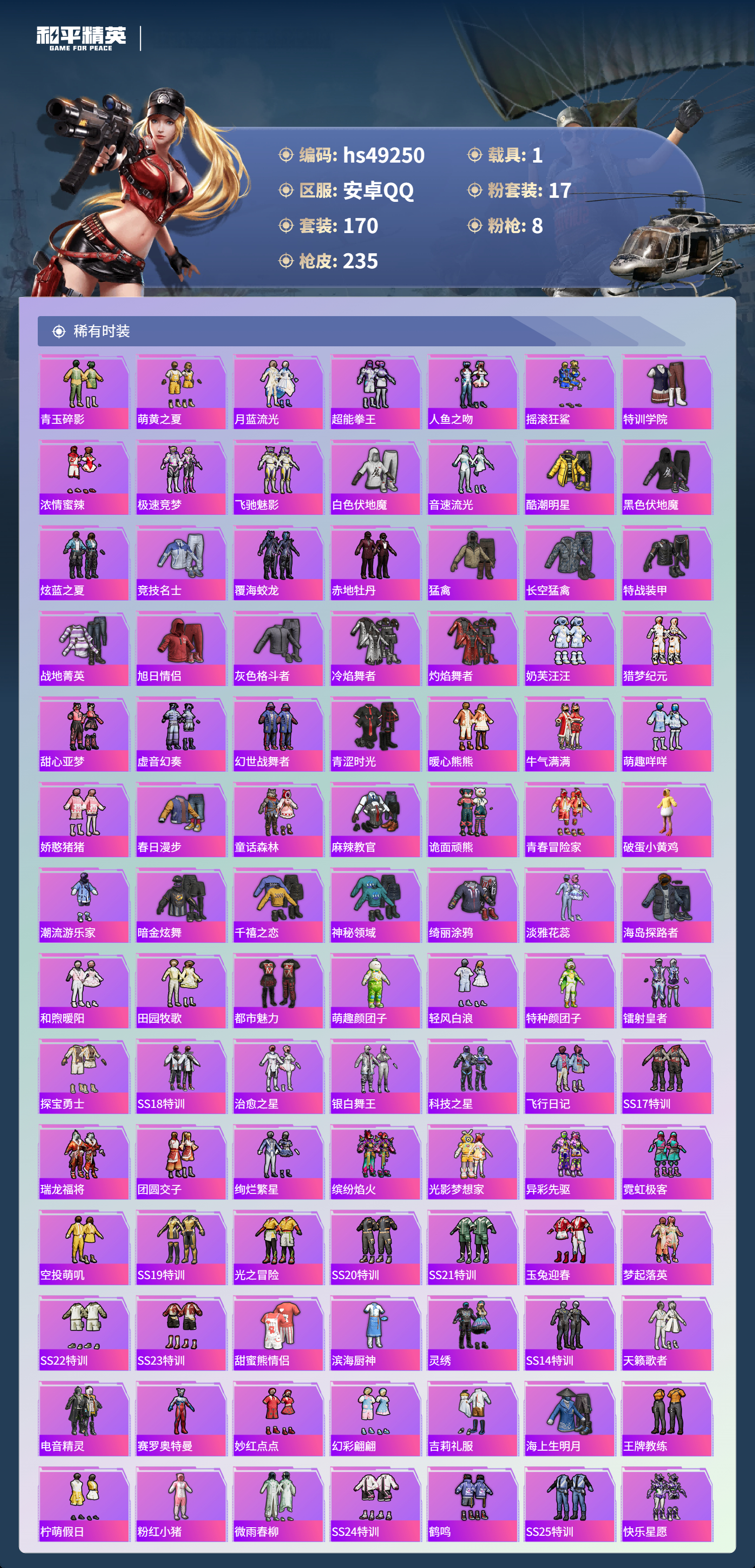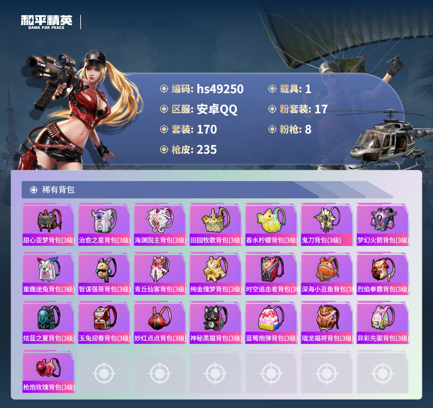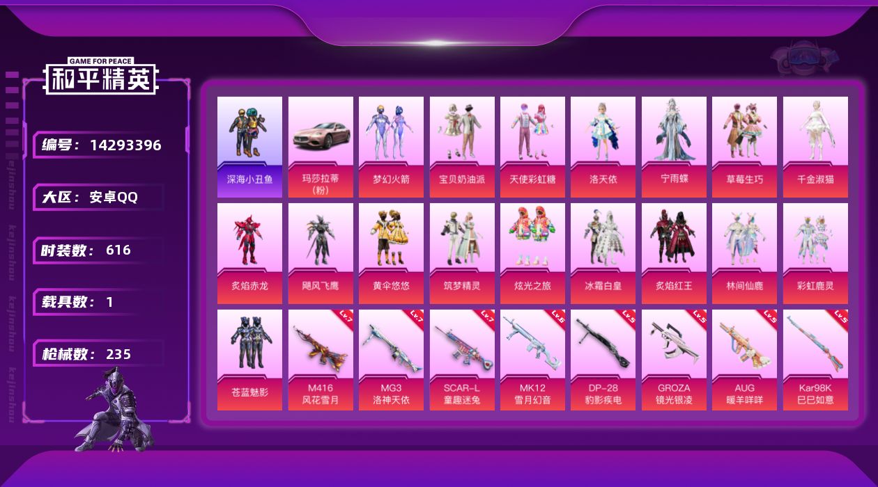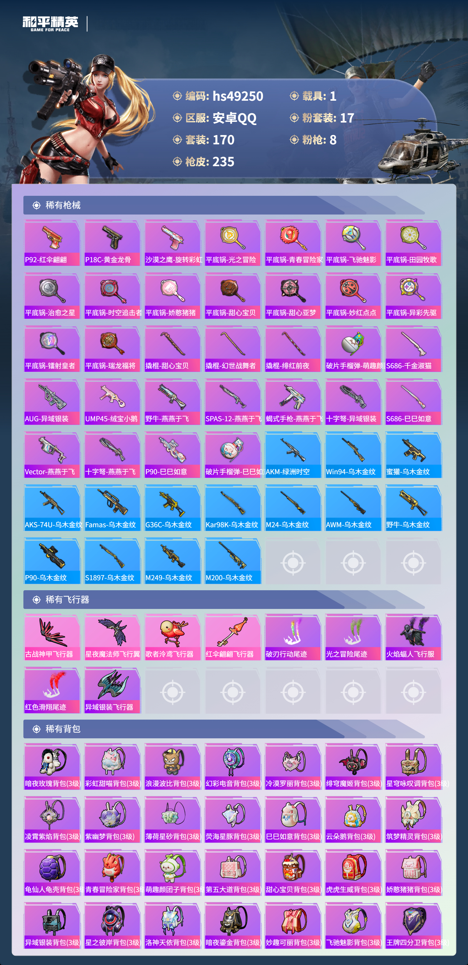 【101070】【不可二次】【安卓QQ】灵绣 龟仙人 炙焰赤龙 炙焰红王 苍蓝魅影 红伞翩翩飞行器 洛天依 汤姆逊-林间仙鹿 林间仙鹿 梦起落英 Mini14-林间仙鹿 仓鼠灰灰 M416-仓鼠灰灰 GROZA-林间仙鹿 深海小丑鱼 浪漫波比 SCAR-童趣迷兔 瑞龙福将 醒狮腾龙 浪漫天命 AWM-黄金龙骨 纯白誓言 团圆交子 飓风飞鹰 暗夜契约 M762-瑞龙福将 MG3-洛神天依 彩虹鹿灵
