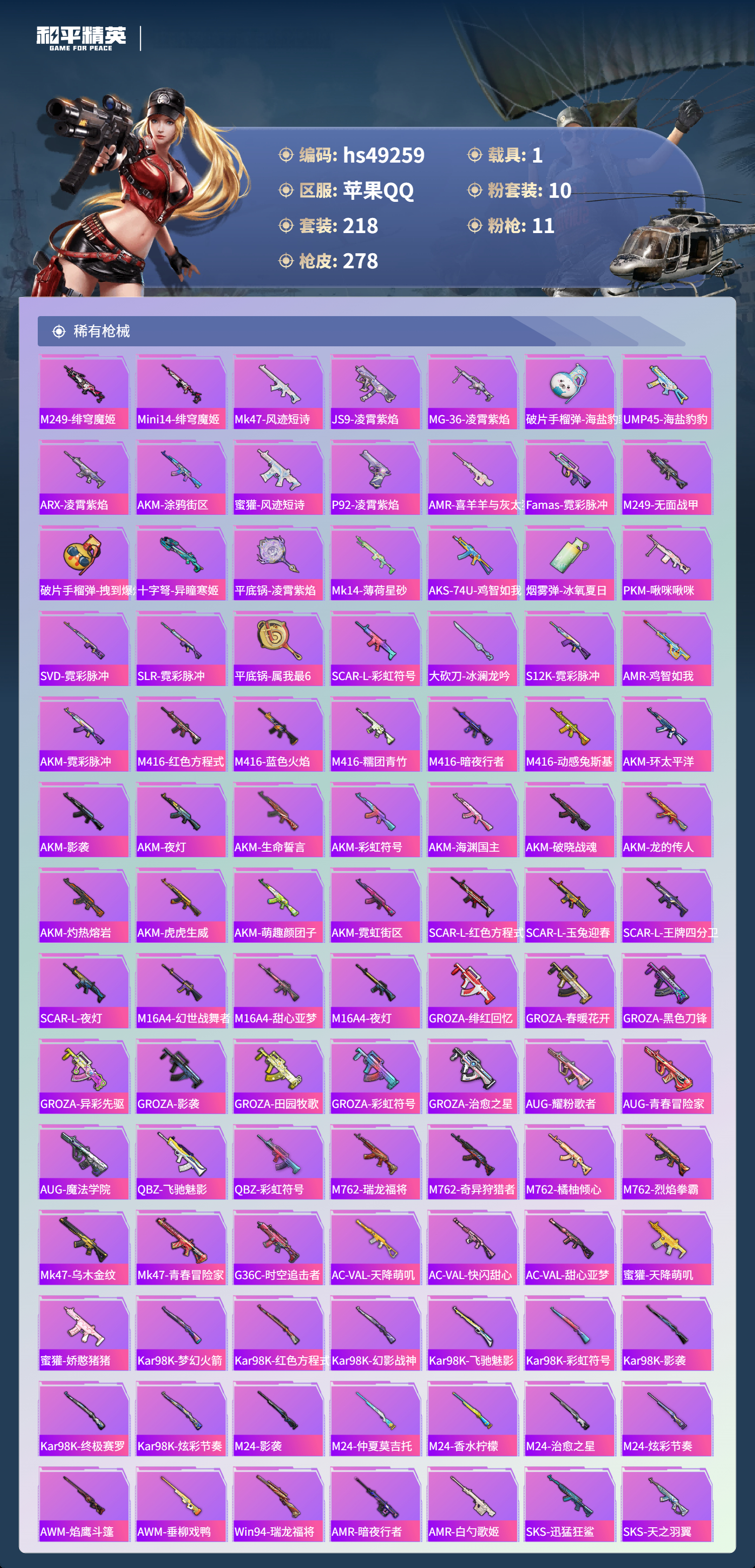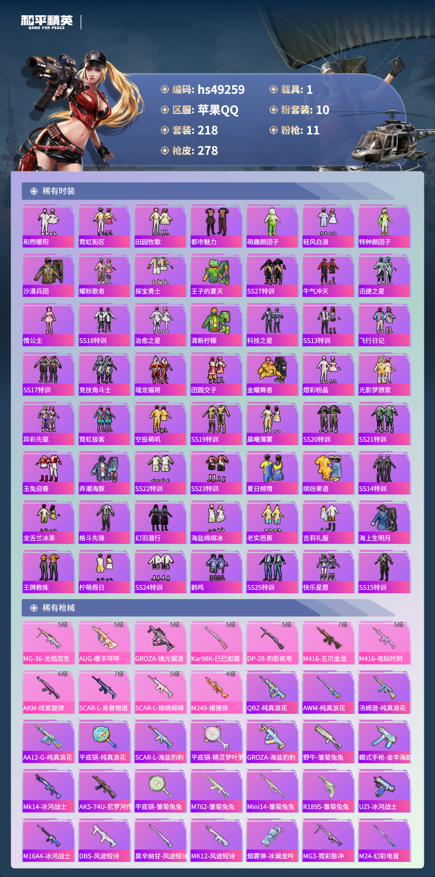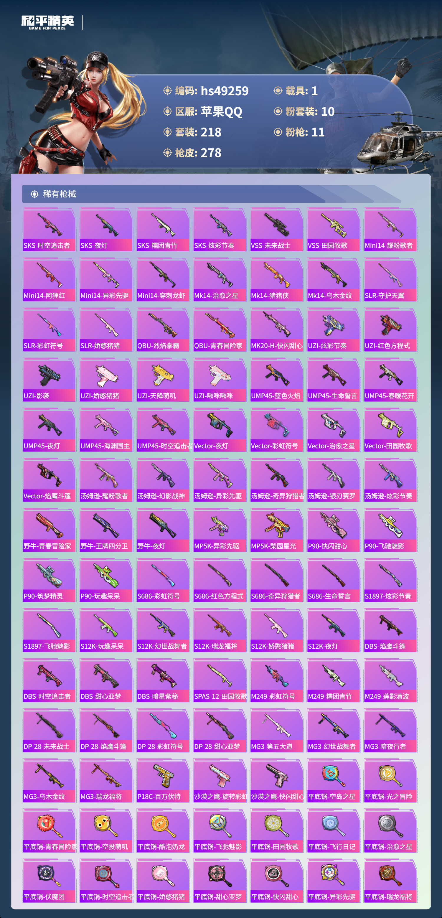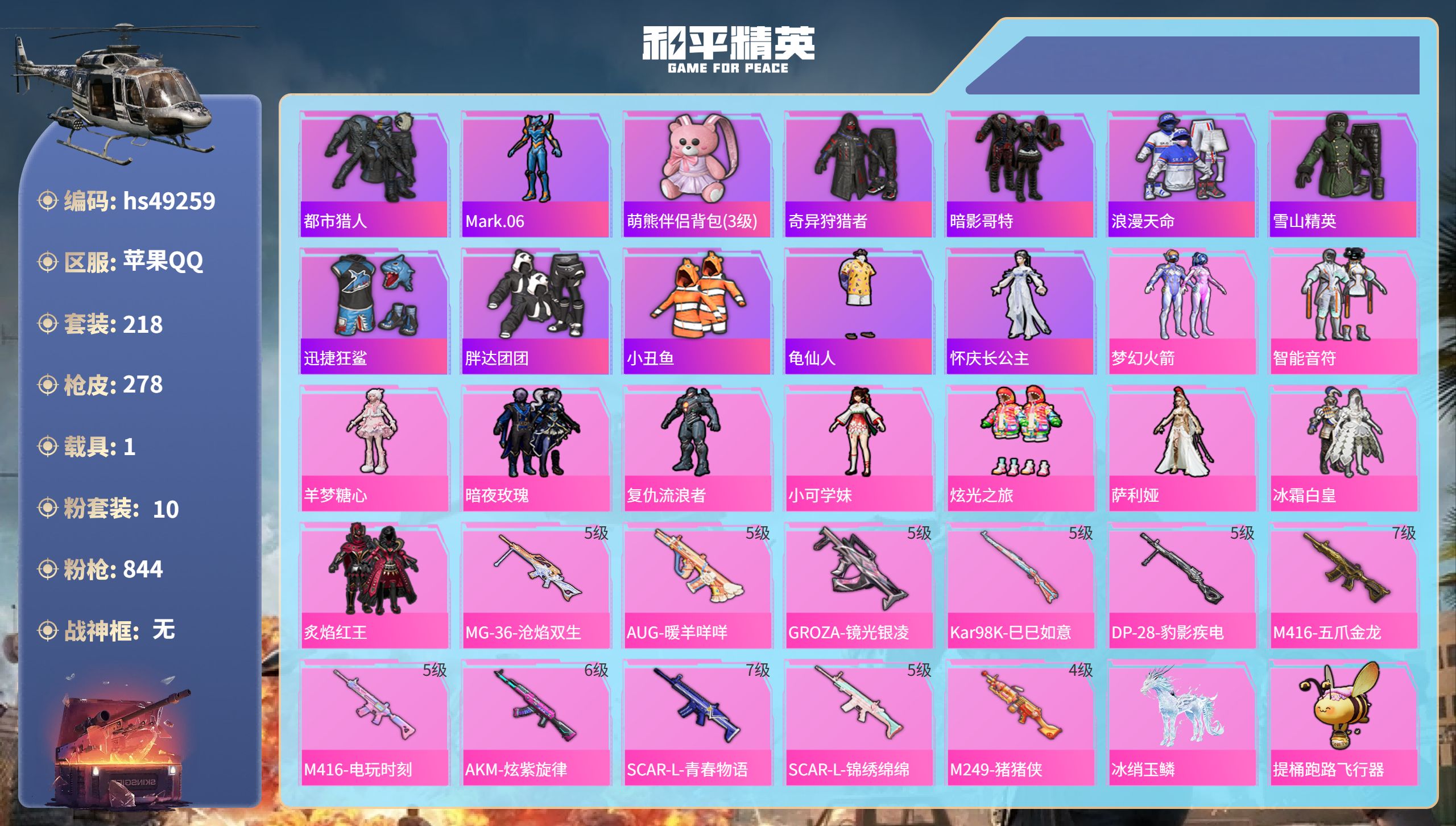 【101075】【不可二次】【苹果QQ】滑板小狐 龟仙人 S686-奇异狩猎者 M416-五爪金龙 漫步者 都市猎人 炙焰红王 极速红龙 M762-奇异狩猎者 M416-电玩时刻 M24-香水柠檬 瑞龙福将 智能音符 浪漫天命 梦之呓语 激萌罗小黑 胖达团团 团圆交子 迅捷狂鲨 奇异狩猎者 M762-瑞龙福将 千面幻镜飞行器 狂沙舞者 SCAR-L-锦绣绵绵 AKM-炫紫旋律 梦幻火箭 暗夜玫瑰