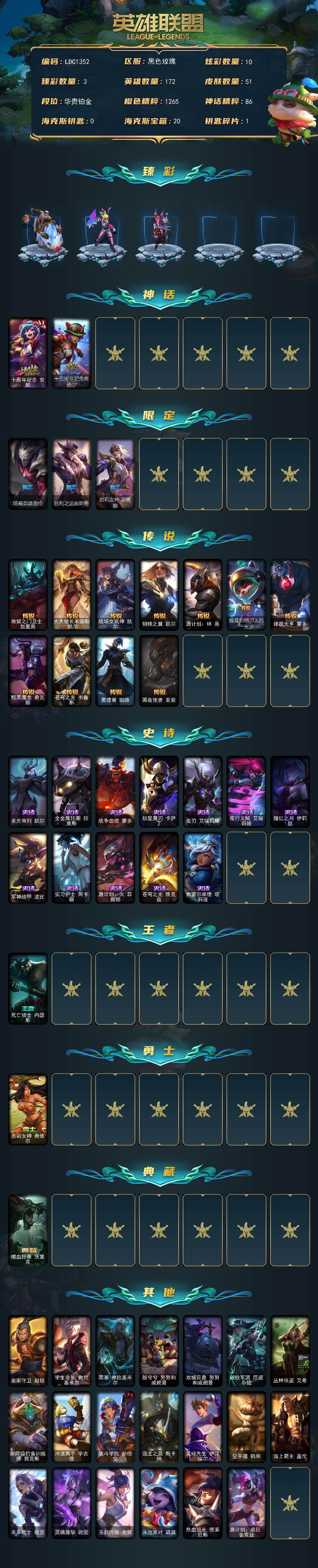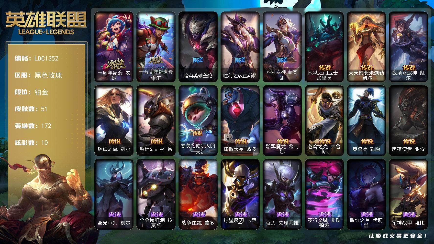 【105679】【LDC1352】172英雄/51皮肤/2神话/3限定/3臻彩/10炫彩/11传说/12史诗/铂金账号等级:197/无畏骑士瑟庄妮赤子初心/幻灵战斗兔锐雯梦幻强袭/星之守护者霞烈羽/十周年纪念安妮/十五周年纪念希维尔/暗裔英雄盖伦/胜利之运崔斯特/胜利女神菲奥娜/地狱之门卫士加里奥/大天使长米迦勒凯尔/战场女武神凯尔/钢铁之翼凯尔/源计划:林易/提莫“约德尔人的一大步”/律政大亨