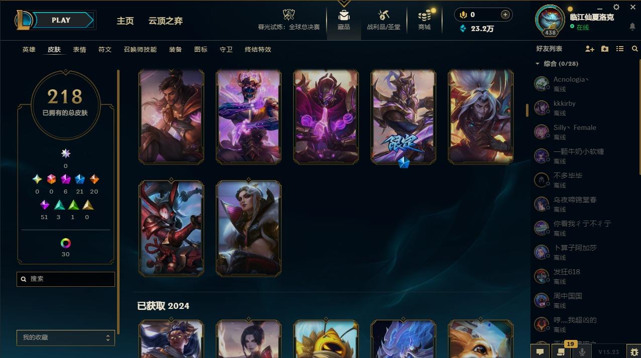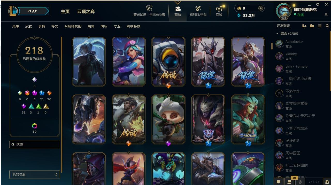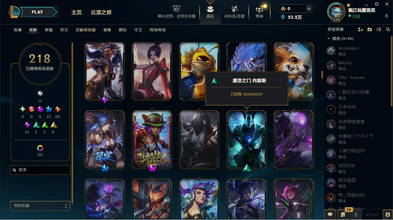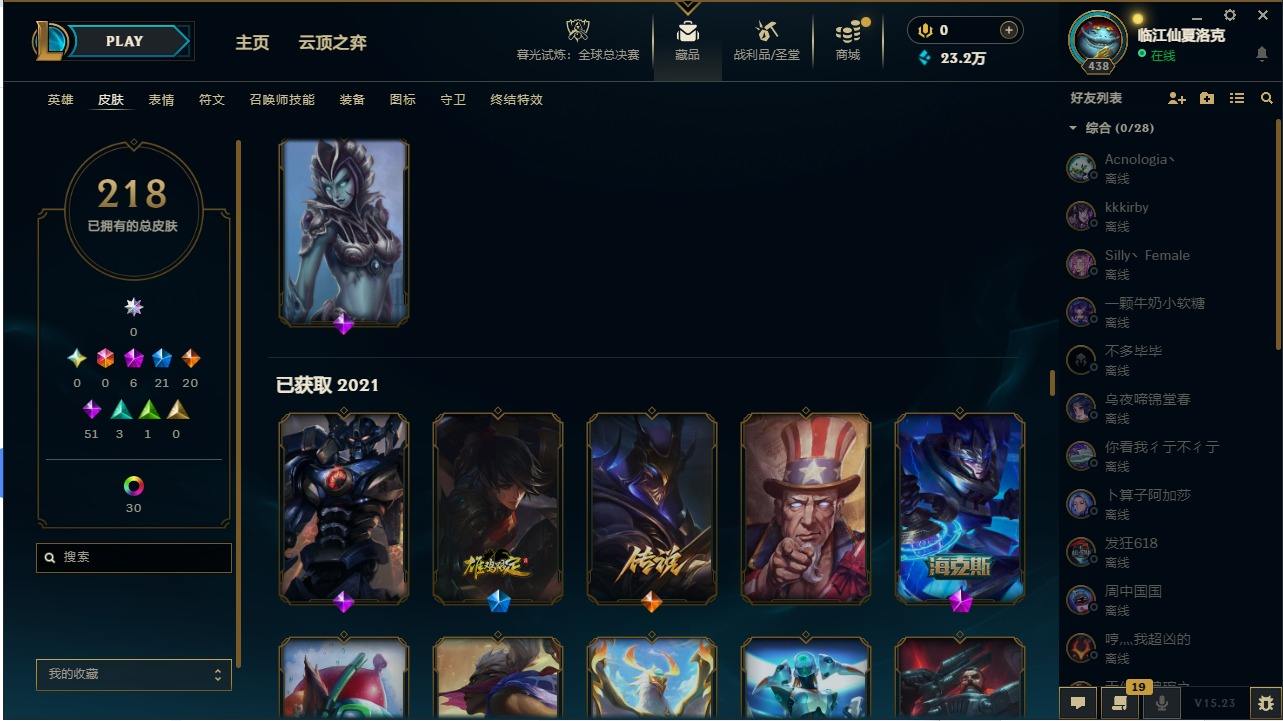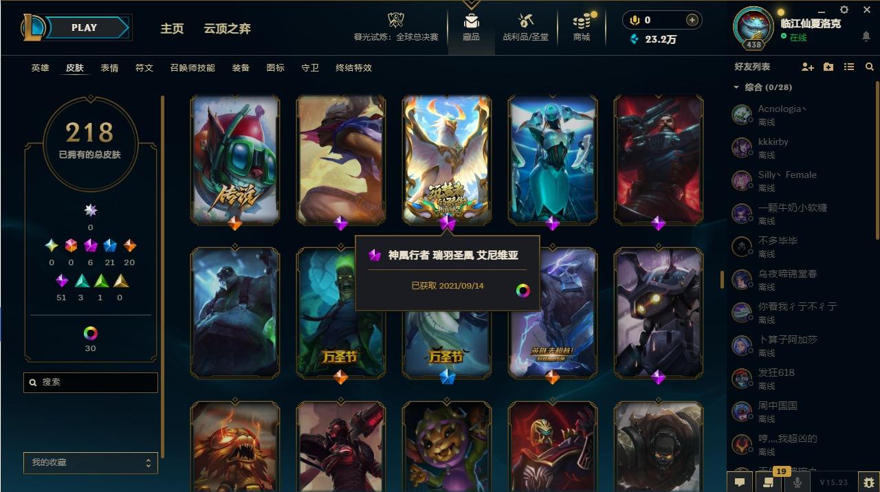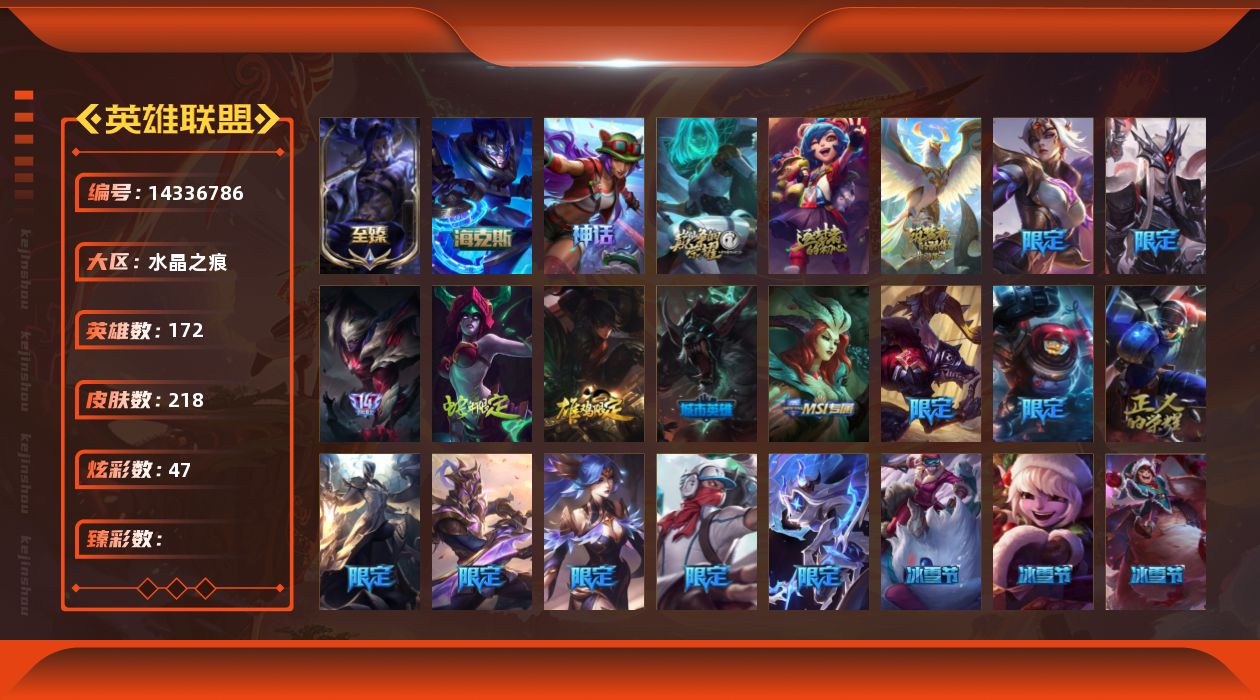【107345】[14336786]6神话 21限定 20传说 51史诗 218皮肤 47炫彩 172英雄 可二次 可修改实名 【至臻】:至臻 墨之影武者 亚索【海克斯】:海克斯 嘉文四世【限定】:银白审判 凯尔【赛季限定皮】:胜利女神-菲奥娜,胜利剑圣 易,胜利女神 娑娜【冠军限定系列】:S14 T1 永恩,S4 SSW 炼金,S12 DRX 千珏【冰雪节限定】:魄罗骑士 瑟庄妮,圣诞精灵 崔
