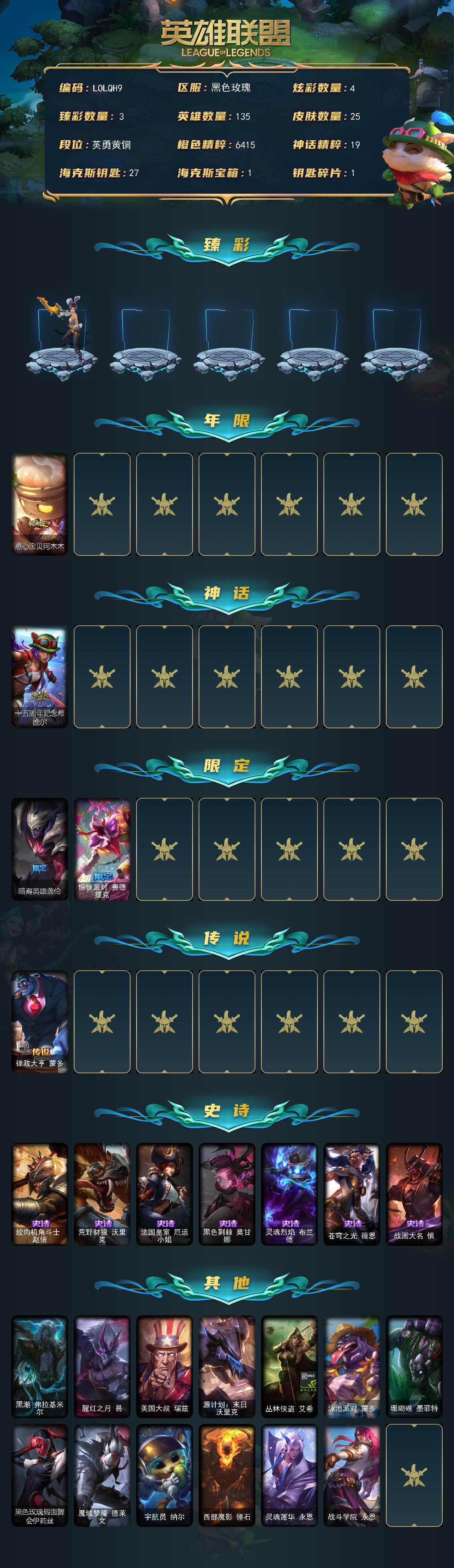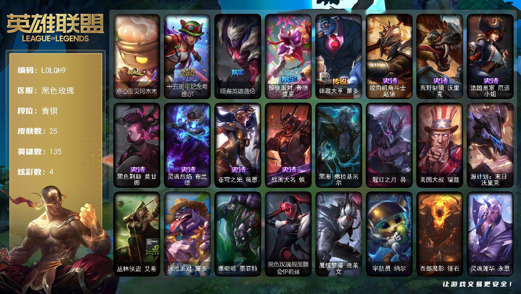 【119298】【LOLQH9】135英雄/25皮肤/1神话/3限定/3臻彩/4炫彩/1传说/7史诗/青铜账号等级:131/雾雨之刃锐雯/战斗学院卡特琳娜盛典礼服/幻灵战斗蝠薇恩梦幻强袭/点心宝贝阿木木/十五周年纪念希维尔/暗裔英雄盖伦/惊悚派对费德提克/律政大亨蒙多/绞肉机角斗士赵信/荒野豺狼沃里克/法国皇室厄运小姐/黑色荆棘莫甘娜/灵魂烈焰布兰德/苍穹之光薇恩/战国大名慎/黑潮弗拉基米尔/腥