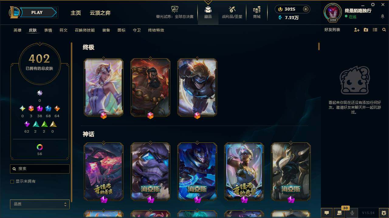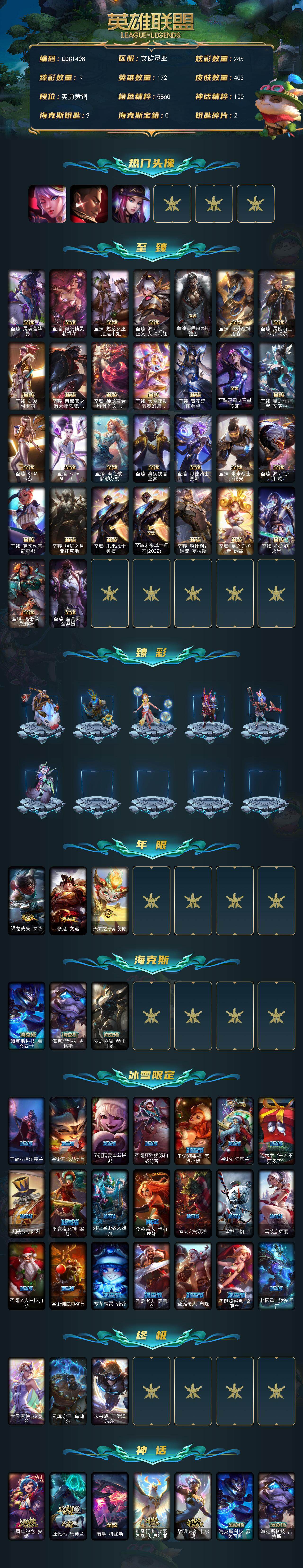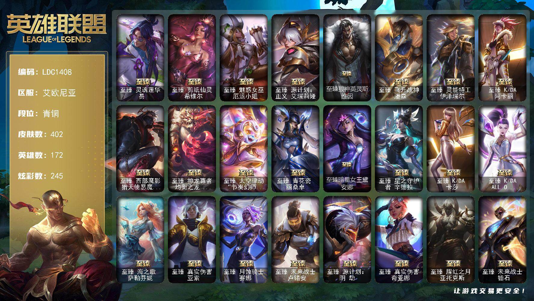 【119642】【LDC1408】172英雄/402皮肤/3终极/38神话/68限定/9臻彩/245炫彩/64传说/62史诗/青铜账号等级:320/觅心之翼奎因/觅心游侠卢锡安/KDA阿卡丽头像/至臻灵魂莲华易/至臻剪纸仙灵希维尔/至臻魅惑女巫厄运小姐/至臻源计划:正义艾瑞莉娅/至臻狼神英灵斯维因/至臻飞升战神潘森/至臻灵能特工伊泽瑞尔/至臻K/DA阿卡丽/至臻西部魔影猎天使恶魔泰隆/至臻神龙尊