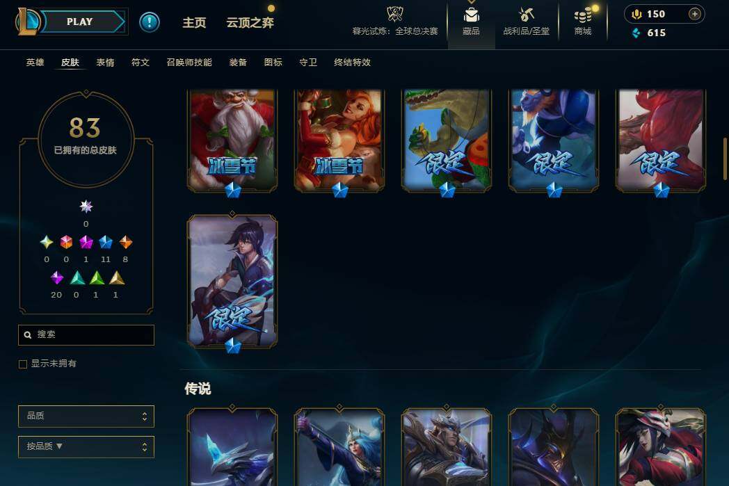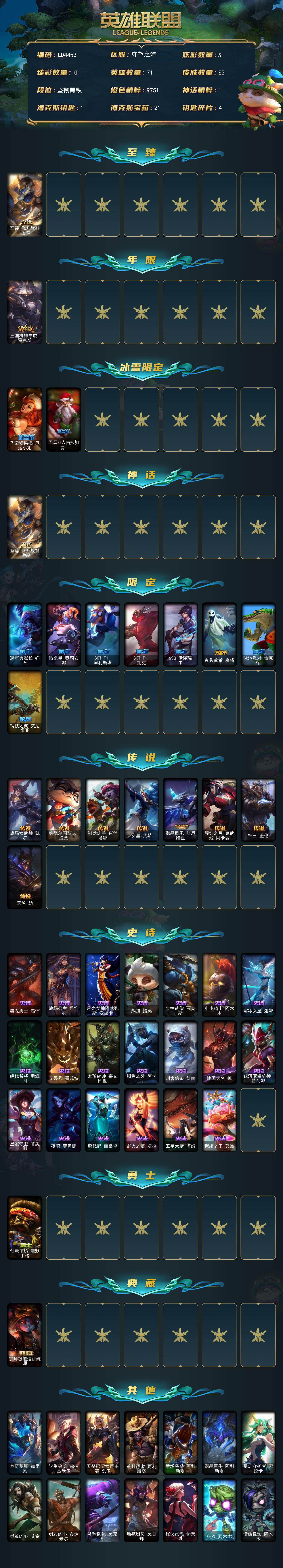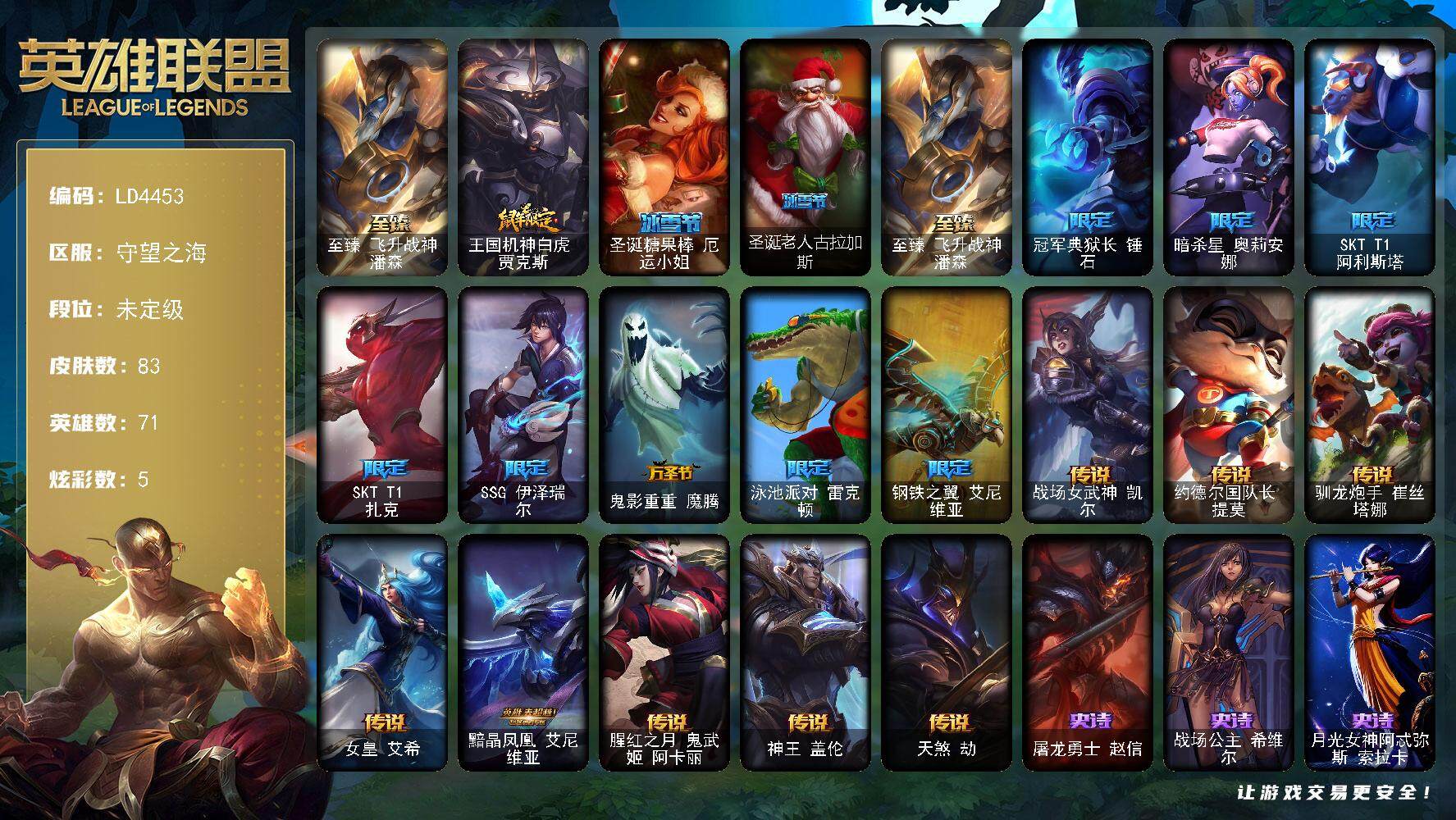 【119992】【LD4453】71英雄/83皮肤/1神话/11限定/5炫彩/8传说/20史诗/未定级/至臻飞升战神潘森/王国机神白虎贾克斯/圣诞糖果棒厄运小姐/圣诞老人古拉加斯/冠军典狱长锤石/暗杀星奥莉安娜/SKTT1阿利斯塔/SKTT1扎克/SSG伊泽瑞尔/鬼影重重魔腾/泳池派对雷克顿/钢铁之翼艾尼维亚/战场女武神凯尔/约德尔国队长提莫/驯龙炮手崔丝塔娜/女皇艾希/黯晶凤凰艾尼维亚/腥红之