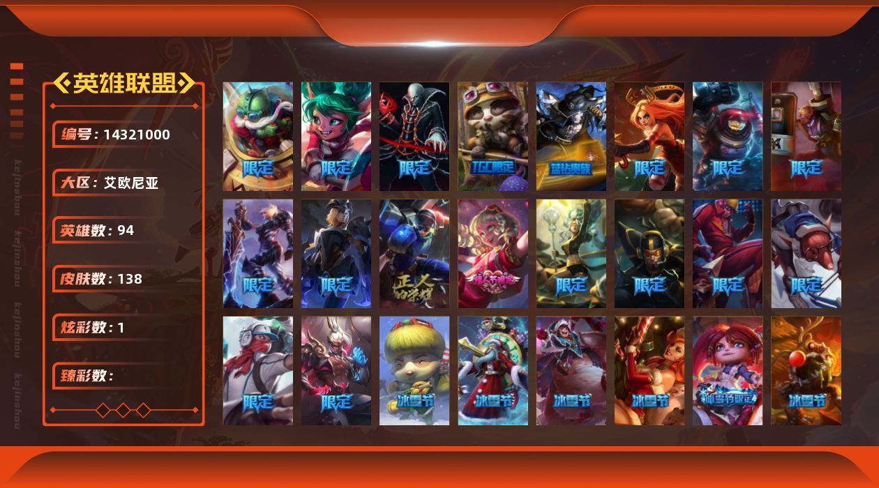 【120114】[14321000]26限定 10传说 34史诗 138皮肤 1炫彩 94英雄 可二次 可修改实名 要打十局匹配才能排位 【情人节限定】:甜心宝贝 安妮 【冠军限定系列】:S13 T1 李青,S1FNC 迦娜,S1FNC 嘉文四世,S3 SKT T1 李青,S4 SSW 图奇,S4 SSW 炼金 【冰雪节限定】:圣诞开心鬼 提莫,圣诞狂欢 基兰,圣诞狂欢 努努和威朗普,圣诞糖果棒