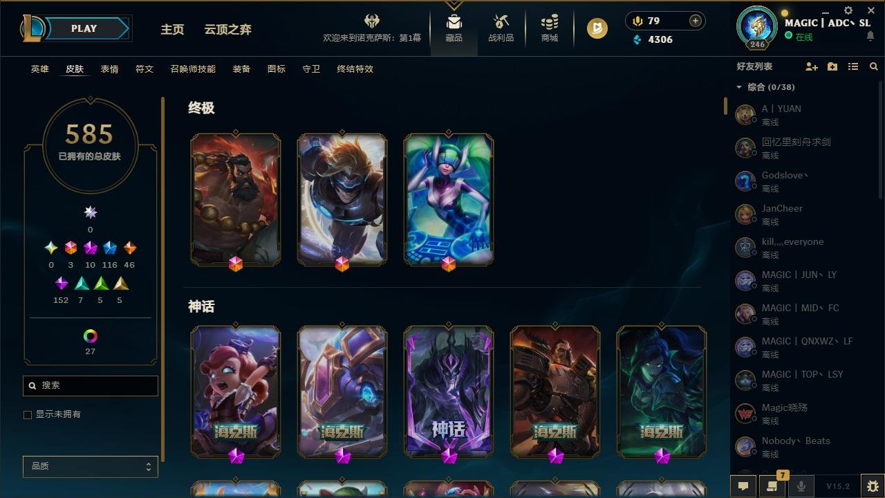 【130273】[14494472]3终极 10神话 116限定 46传说 154史诗 591皮肤 36炫彩 171英雄 可二次 可修改实名 【至臻】:至臻 灵能特工 伊泽瑞尔,至臻 源计划:逆流 塞拉斯【海克斯】:恐惧新星 德莱厄斯,摄魂 薇恩,海克斯 安妮,海克斯 克格莫【限定】:钢铁军团 拉克丝,奥斯曼大帝 泰达米尔,生化领主 泰达米尔【情人节限定】:觅心猎手 薇恩,觅心魔灵 奥利安娜,觅