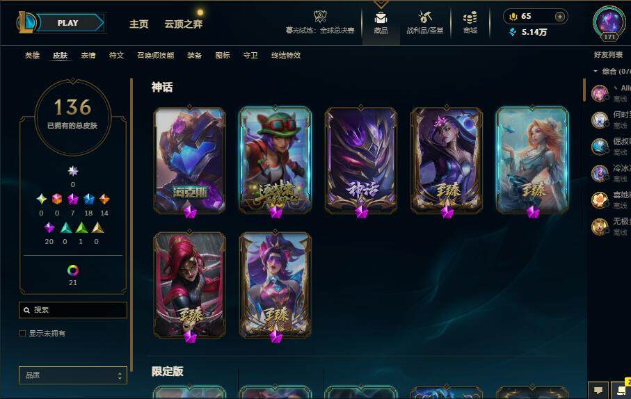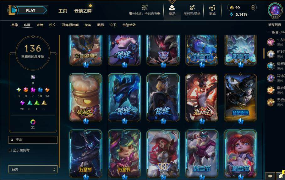 【132558】【LD4481】172英雄/136皮肤/7神话/18限定/8臻彩/63炫彩/14传说/20史诗/青铜账号等级:171/至臻黑色玫瑰假面舞会卡特琳娜/至臻幻灵狮心蕾欧娜/至臻暗星女王黛安娜/至臻海之歌萨勒芬妮/无畏骑士瑟庄妮赤子初心/玉剑传说舞剑仙承影/玉剑传说无劫胭脂/霸天异形卡兹克刹那银光/灵魂莲华卡西奥佩娅流火/玉剑传说神机花火青竹/可爱可爱粉红红布里茨/魔女阿卡丽虚荣/剪纸