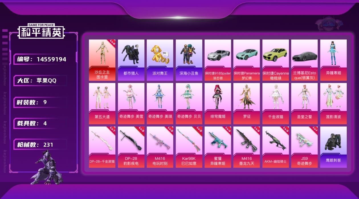 【139448】【不可二次】【苹果QQ】M416-电玩时刻 龟仙人 沙丘之主-图卡盟 漫步者 都市猎人 深海小丑鱼 派对舞王 兰博轿车灰色 浪漫天命 龙翔九天飞行器 暗影哥特 M416-墨龙九天