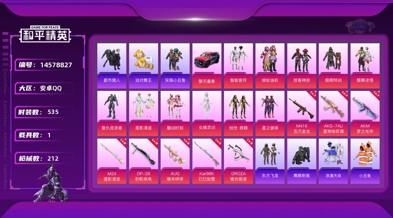 【143199】【不可二次】【安卓QQ】龟仙人 水银刺客 M24-莲影清波 M416-五爪金龙 漫步者 都市猎人 M24-奇异狩猎者 东方飞龙 梦之光华飞行器 极限特训 极速红龙 放客神游 星之彼岸 缤纷油彩 深海小丑鱼 馨动时刻 智能音符 蝶舞迷情 浪漫天命 M762-风花雪月 AKM-梦之光华 AKM-缤纷海域 AKM-百万伏特 粉红小猪 派对舞王