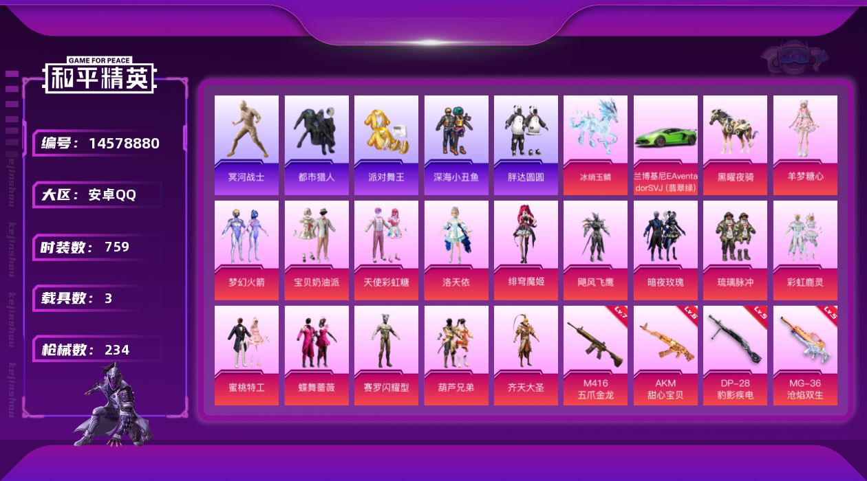 【143204】【不可二次】【安卓QQ】赛罗闪耀型 龟仙人 漫步者 M416-星际漫游 都市猎人 葫芦兄弟 Mini14-林间仙鹿 蝶舞蔷薇 MK47-林间仙鹿 GROZA-林间仙鹿 深海小丑鱼 醒狮腾龙 AKM-甜心宝贝 兰博SVJ绿色 飓风飞鹰 相思残雪飞行器 迅捷狂鲨 M762-瑞龙福将 齐天大圣飞行器 潮萌小黄鸭 狂沙舞者 金羽特工 齐天大圣 暗夜玫瑰 M249-蓝莓炮弹 M416-梨园