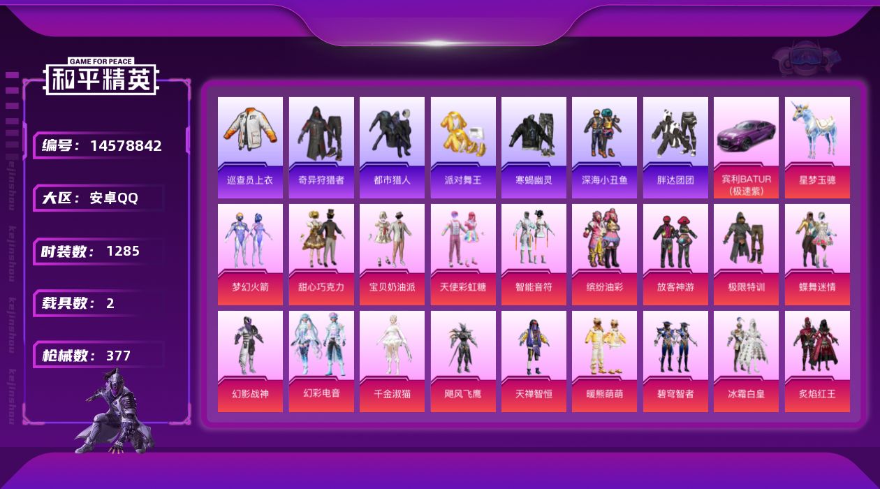 【143205】【可二次】【安卓QQ】龟仙人 水银刺客 漫步者 都市猎人 忍者信条 寒蝎幽灵 M416-暖熊萌萌 缤纷油彩 深海小丑鱼 智能音符 蝶舞迷情 幽冥伯爵 SS1特训 飓风飞鹰 迅捷狂鲨 M762-瑞龙福将 黑色刀锋 Vector-环太平洋 狂沙舞者 金羽特工 SCAR-L-锦绣绵绵 AKM-梦之光华 M762-青锋波束 M416-五爪金龙 炙焰红王 M24-奇异狩猎者 天禅智恒 东方