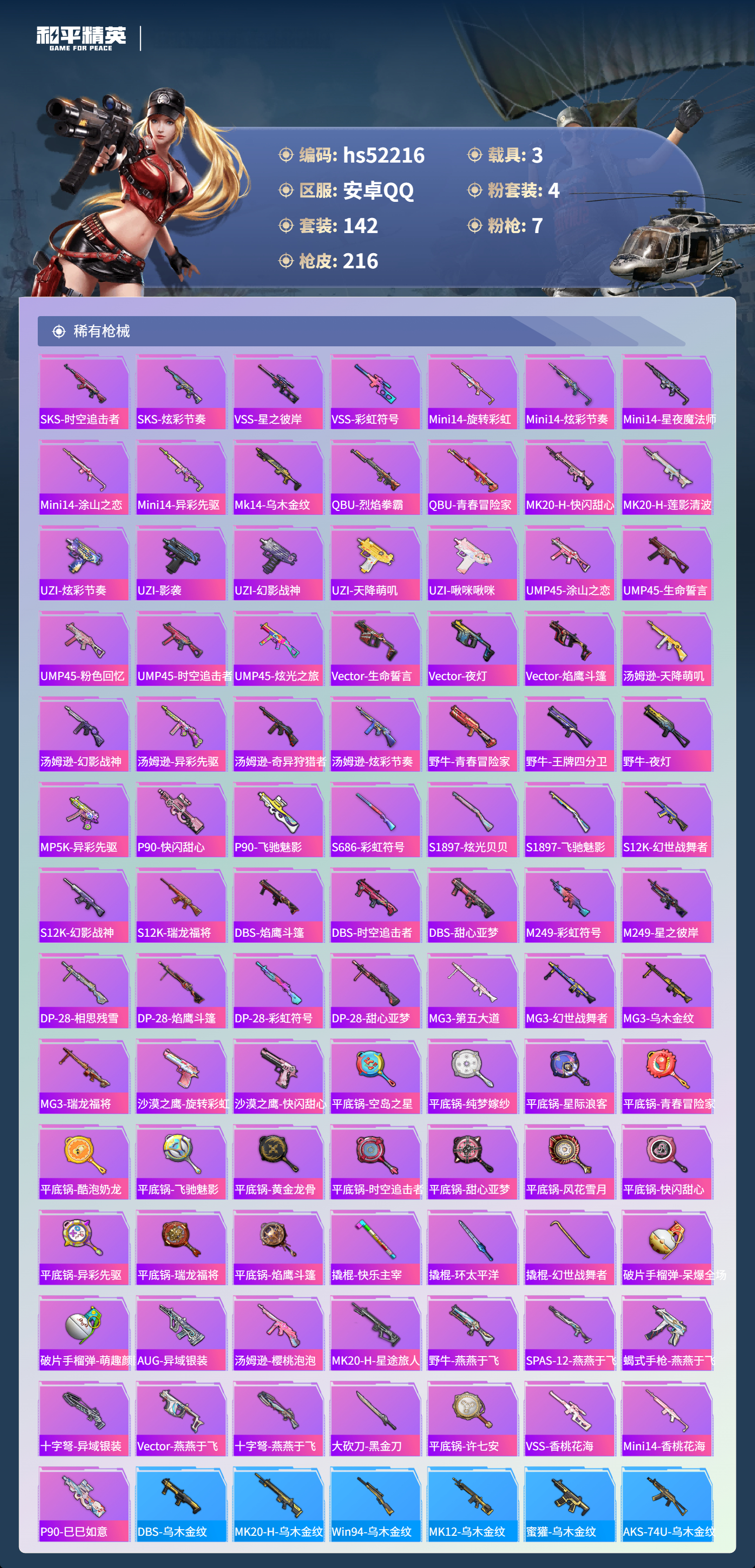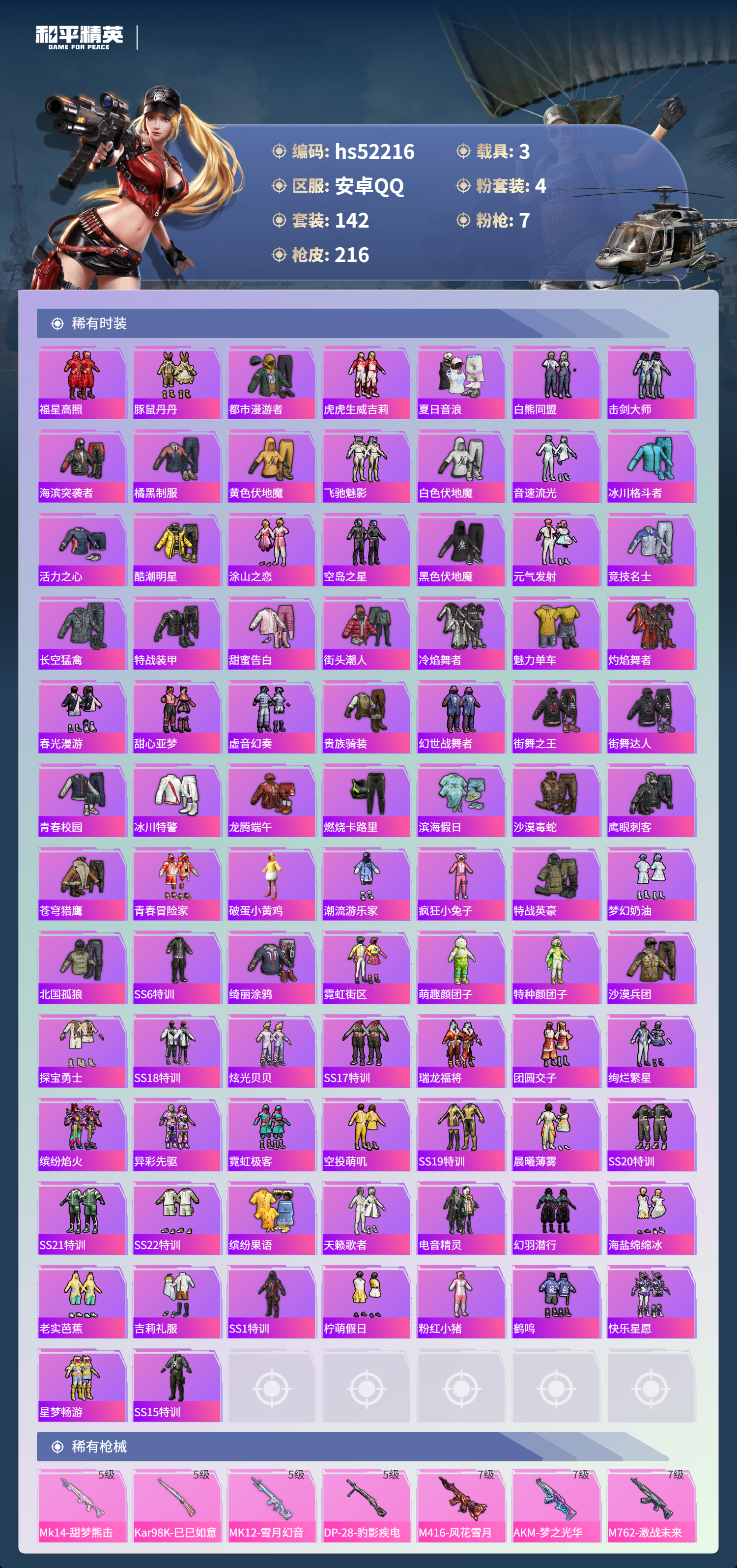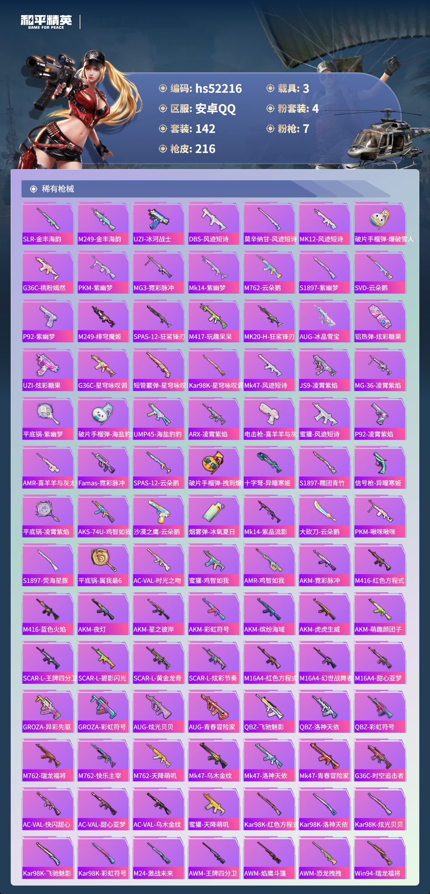 【143217】【不可二次】【安卓QQ】M24-激战未来 SS1特训 炫光贝贝 M762-激战未来 奇异狩猎者 M762-瑞龙福将 洛天依 星之彼岸飞行器 豚鼠丹丹 空客蔚蓝之翼 M416-风花雪月 鬼马风驰 AKM-梦之光华 星之彼岸 AKM-缤纷海域 粉红小猪 瑞龙福将 暗影哥特 雪山精英 团圆交子