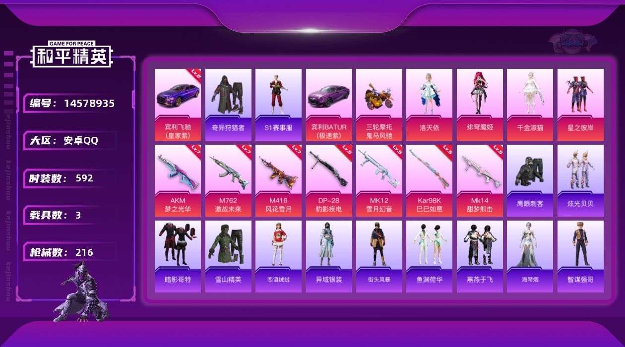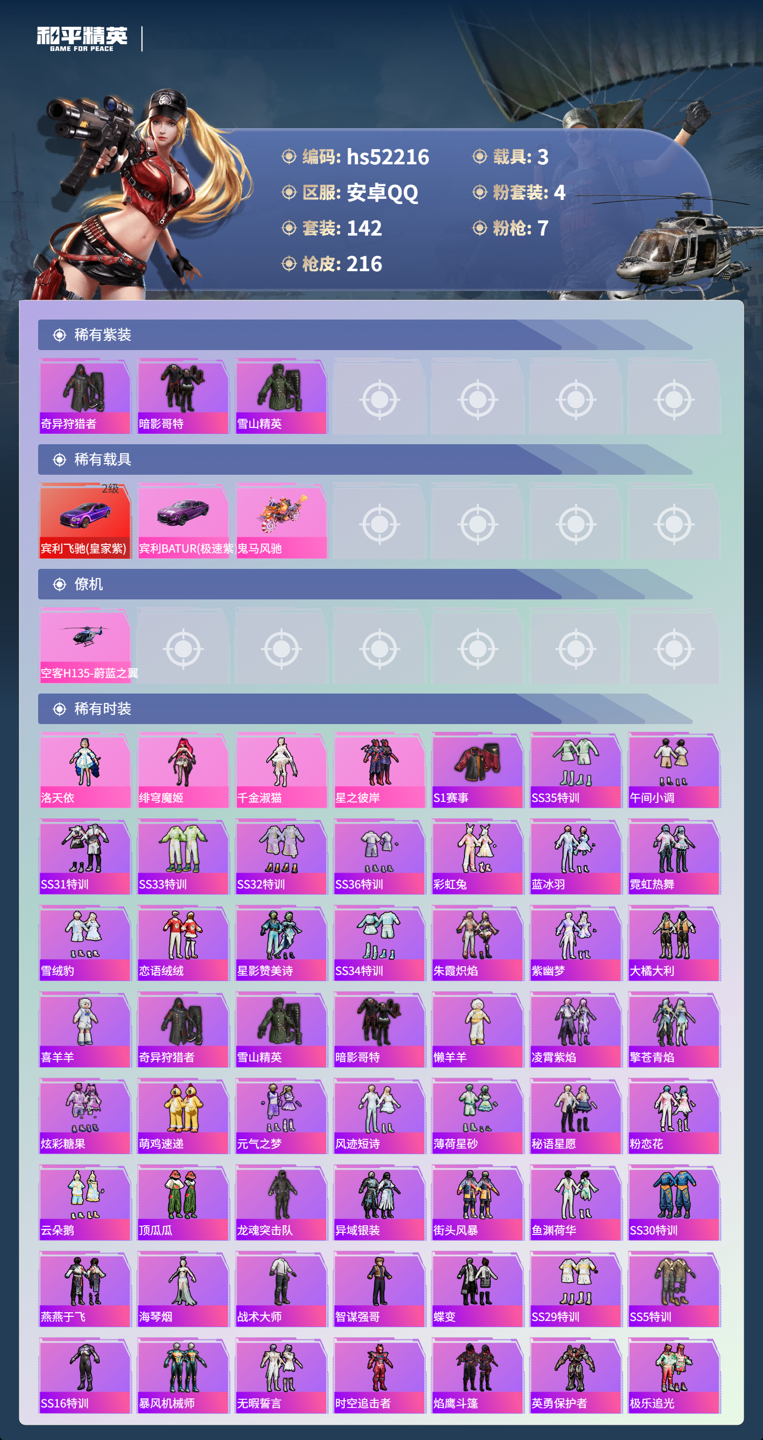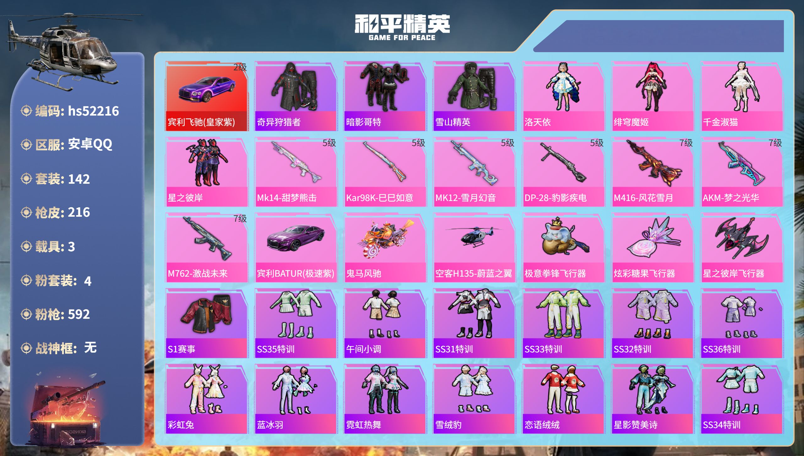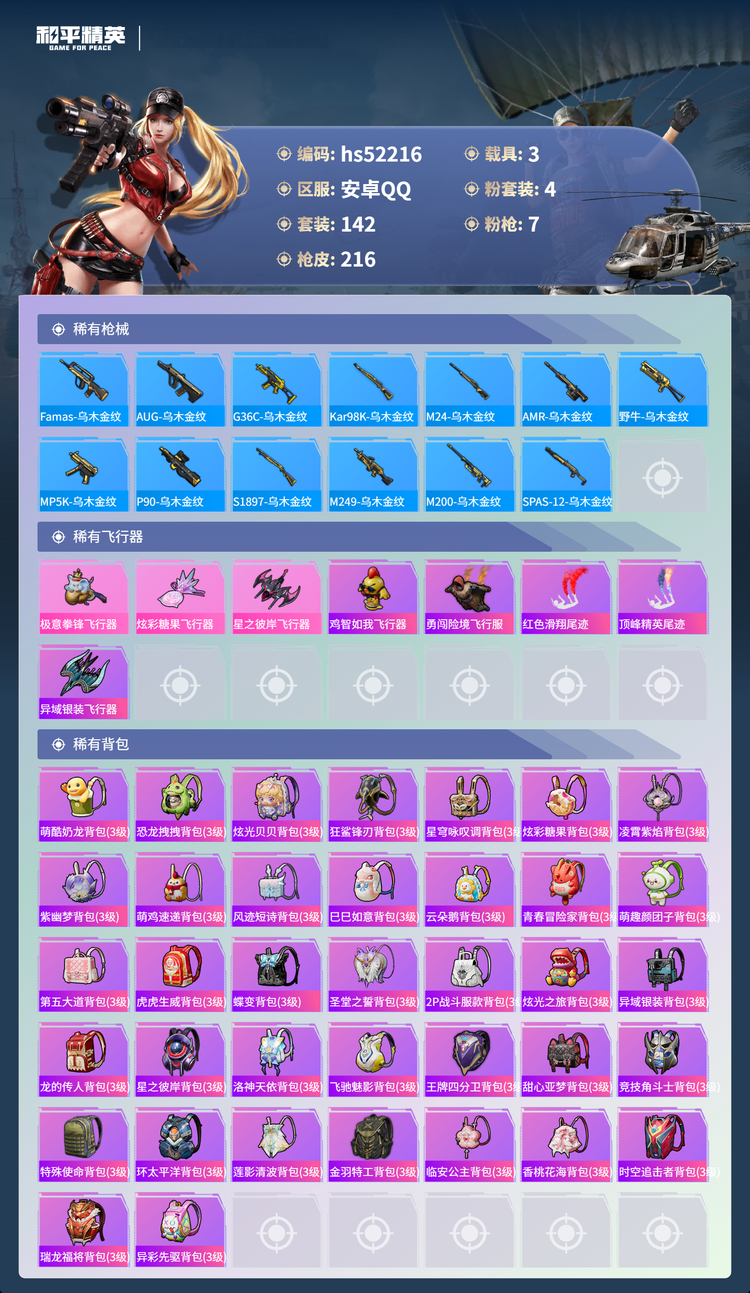 【143217】【不可二次】【安卓QQ】M24-激战未来 SS1特训 炫光贝贝 M762-激战未来 奇异狩猎者 M762-瑞龙福将 洛天依 星之彼岸飞行器 豚鼠丹丹 空客蔚蓝之翼 M416-风花雪月 鬼马风驰 AKM-梦之光华 星之彼岸 AKM-缤纷海域 粉红小猪 瑞龙福将 暗影哥特 雪山精英 团圆交子