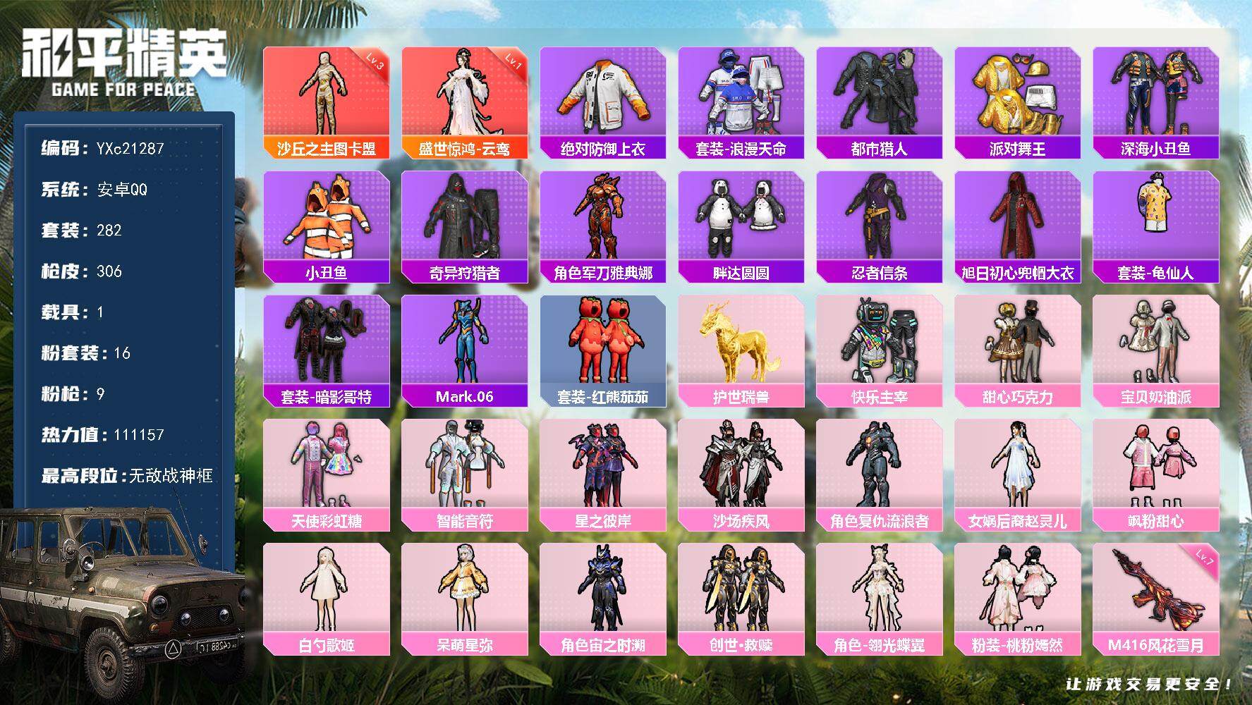 【143227】【不可二次】【安卓QQ】王牌四分卫降落伞 龟仙人 S686-奇异狩猎者 漫步者 都市猎人 M24-奇异狩猎者 东方飞龙 极速红龙 忍者信条 冰川粉黛降落伞 M762-奇异狩猎者 沙丘之主-图卡盟 巡查衣 盛世惊鸿-云鸾 快乐主宰 第五大道降落伞 星之彼岸 深海小丑鱼 瑞龙福将 智能音符 浪漫天命 狮王雄心 激萌罗小黑 未来战士降落伞 胖达圆圆 团圆交子 AKM-奇异狩猎者 沙场疾