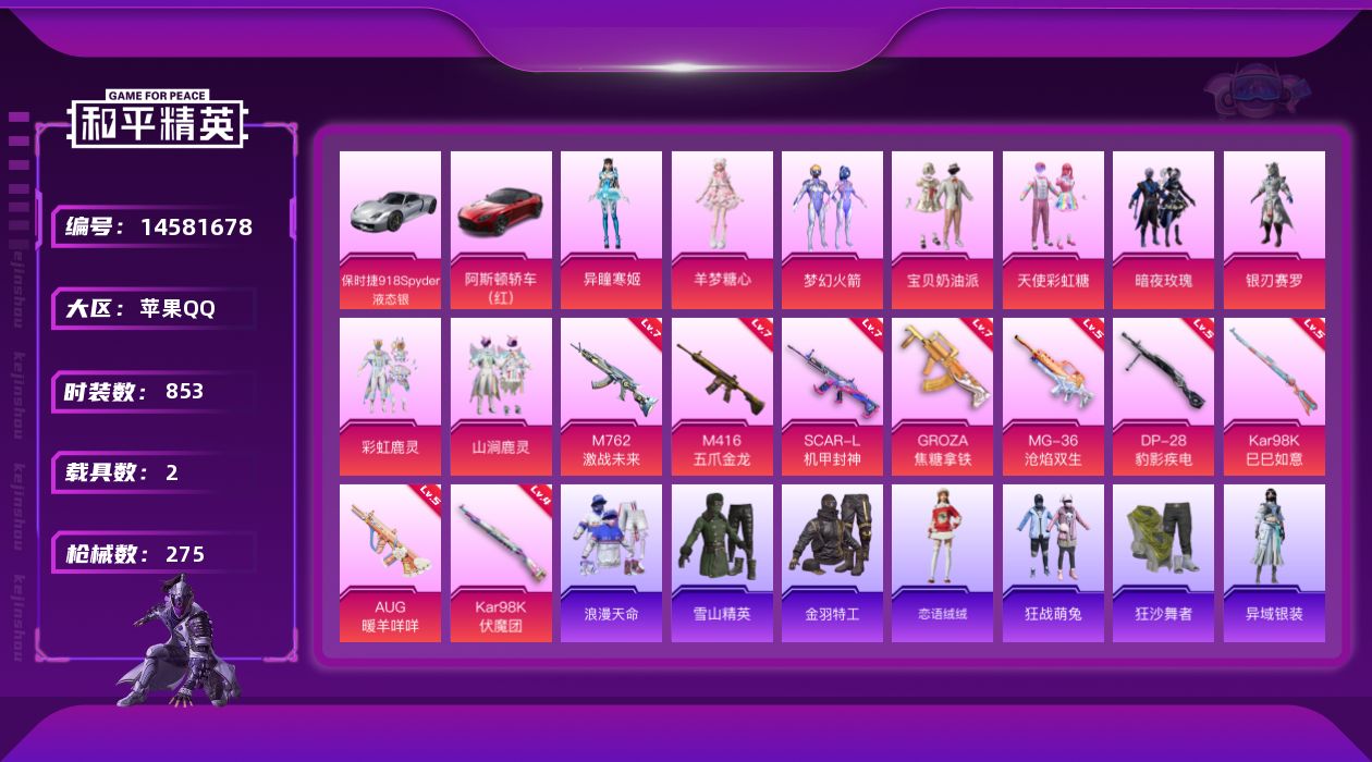 【143784】【不可二次】【苹果QQ】龟仙人 S686-奇异狩猎者 M416-五爪金龙 极速红龙 SCAR-L-机甲封神 Mini14-林间仙鹿 风花雪月飞行器 赛博空间 银刃赛罗 GROZA-林间仙鹿 山涧鹿灵 GROZA-焦糖拿铁 瑞龙福将 AWM-激战未来 浪漫天命 Kar98K-伏魔团 98K-伏魔团 团圆交子 SS1特训 M762-激战未来 M762-瑞龙福将 黑色刀锋 SCAR-机