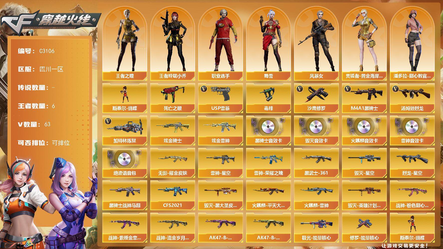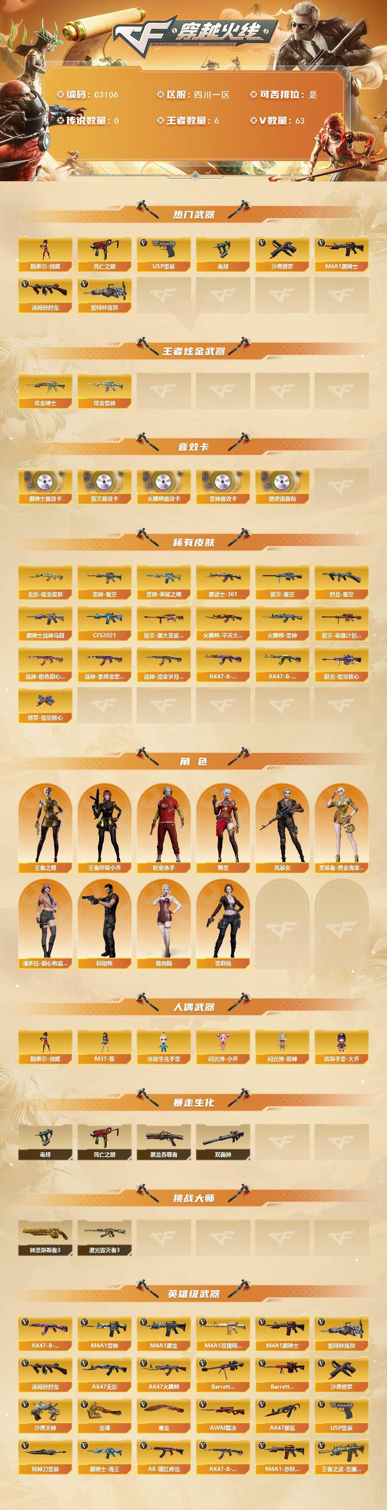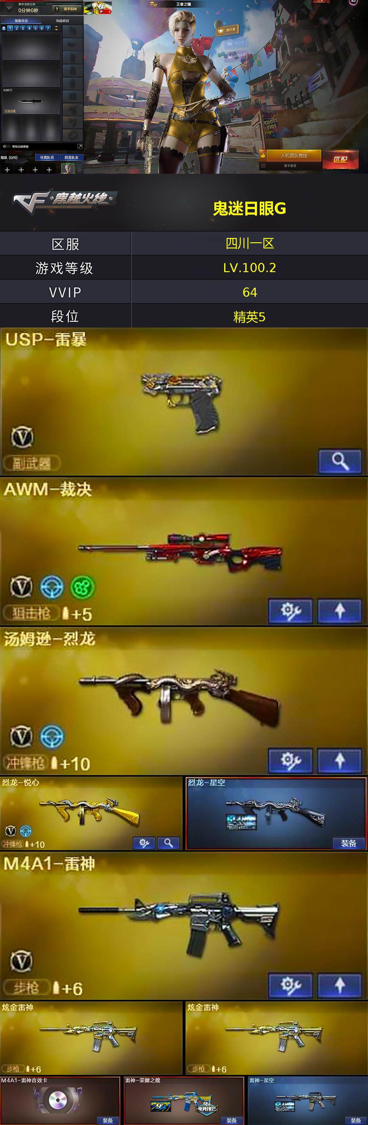 【147340】【C3106】四川一区-63V-6王者-3炫金【热门武器】:死亡之眼,毒蜂,M4A1-黑骑士*4,汤姆逊-烈龙,加特林-炼狱*2,斯泰尔-蝴蝶,USP-雷暴,沙鹰-修罗*3【王者炫金武器】:炫金骑士,炫金雷神*2【音效卡】:AK47-火麒麟音效卡,M4A1-雷神音效卡,M4A1-黑骑士音效卡*2,Barrett-毁灭音效卡,绝迹语音包【皮肤】:烈龙-星空,雷神-荣耀之魄,雷神-星