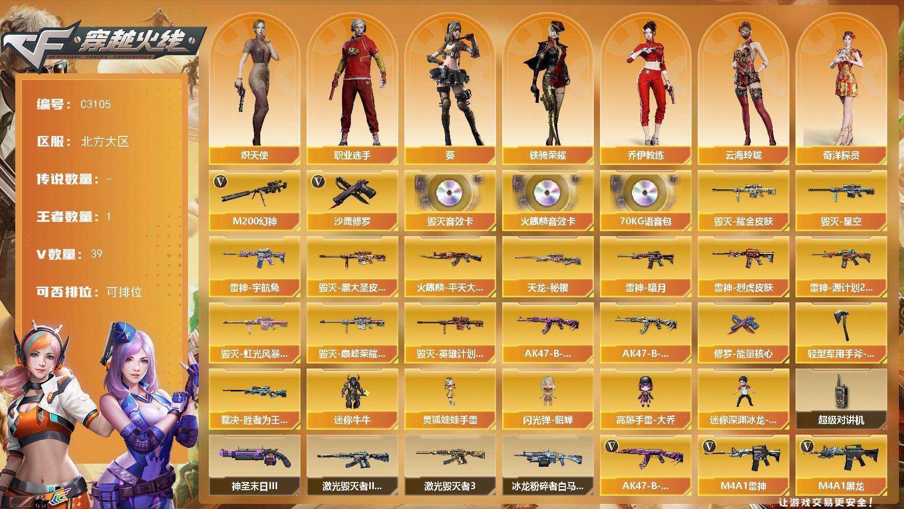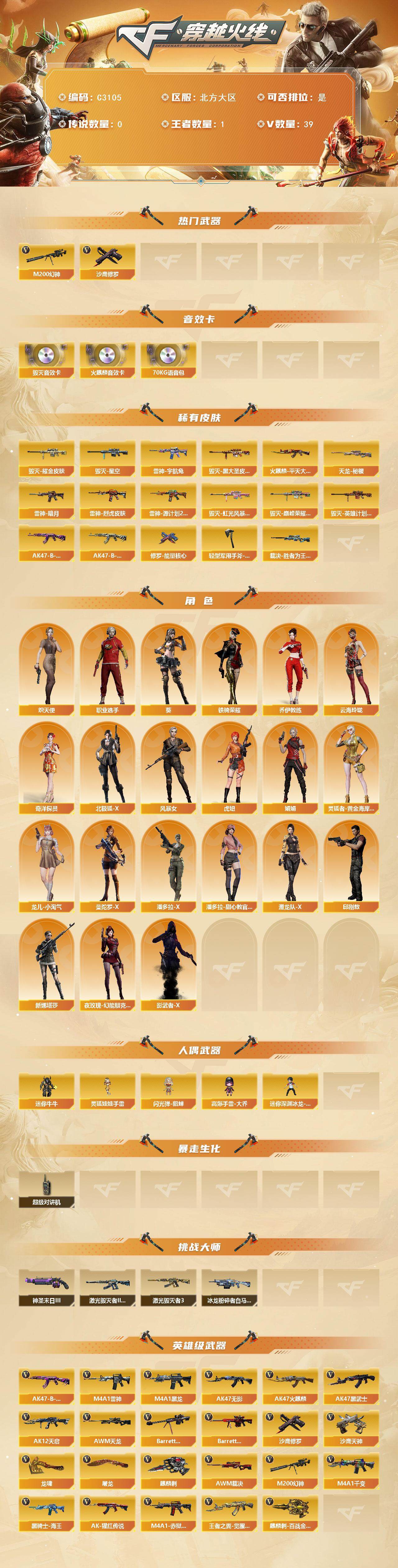 【147403】【147403】【C3105】北方大区-39V-1王者-0炫金【热门武器】:M200-幻神,沙鹰-修罗*2【音效卡】:AK47-火麒麟音效卡,