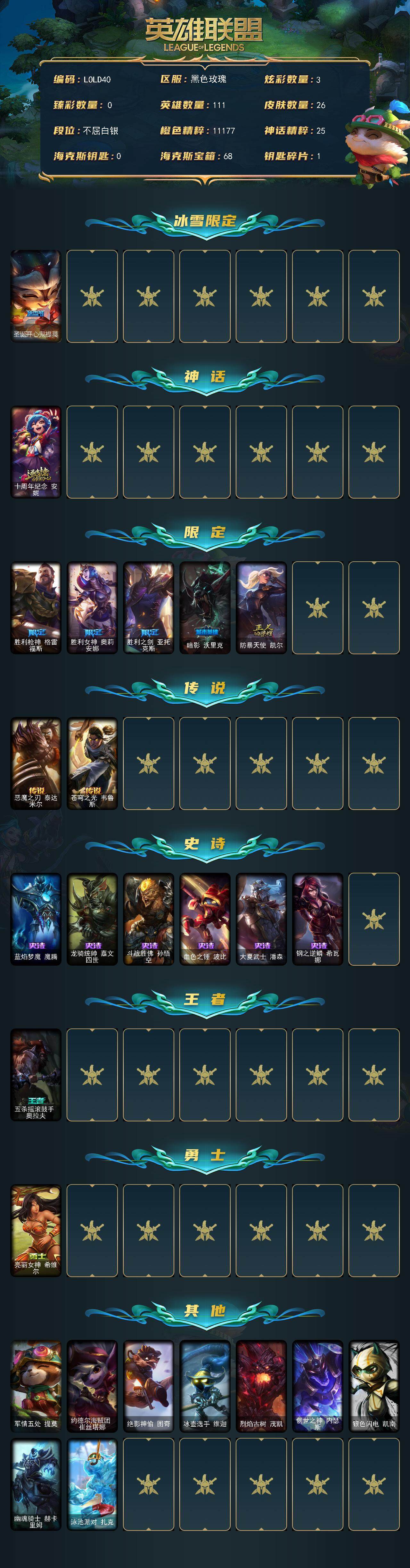 【185015】【LOLD40】111英雄/26皮肤/1神话/6限定/3炫彩/2传说/6史诗/白银账号等级:100/圣诞开心鬼提莫/十周年纪念安妮/胜利枪神格雷福斯/胜利女神奥莉安娜/胜利之剑亚托克斯/暗影妖狐阿狸/防暴天使凯尔/恶魔之刃泰达米尔/苍穹之光韦鲁斯/蓝焰梦魇魔腾/龙骑统帅嘉文四世/斗战胜佛孙悟空/血色之锤波比/大夏武士潘森/钢之逆鳞希瓦娜/五杀摇滚鼓手奥拉夫/靓丽女神希维尔/军情五