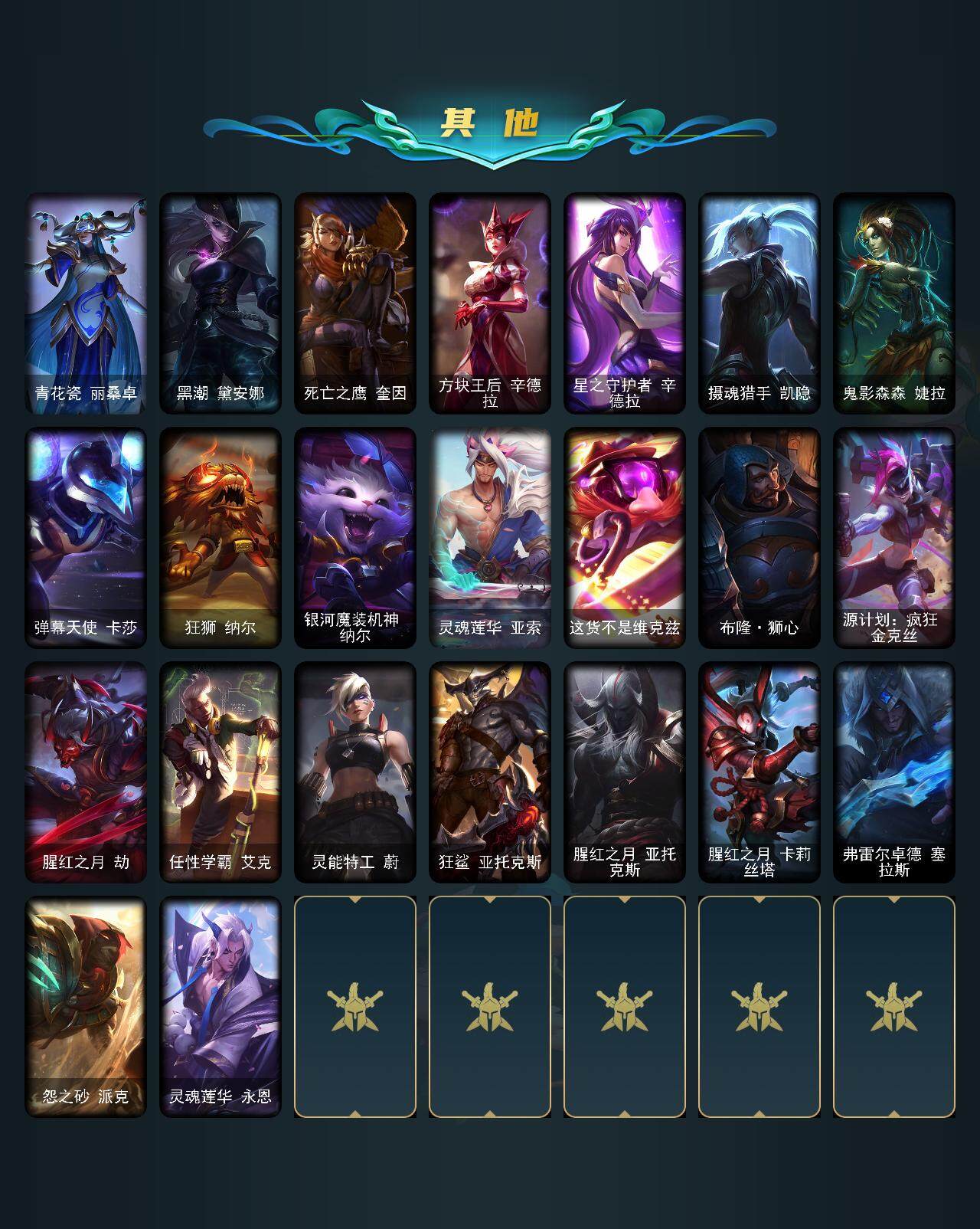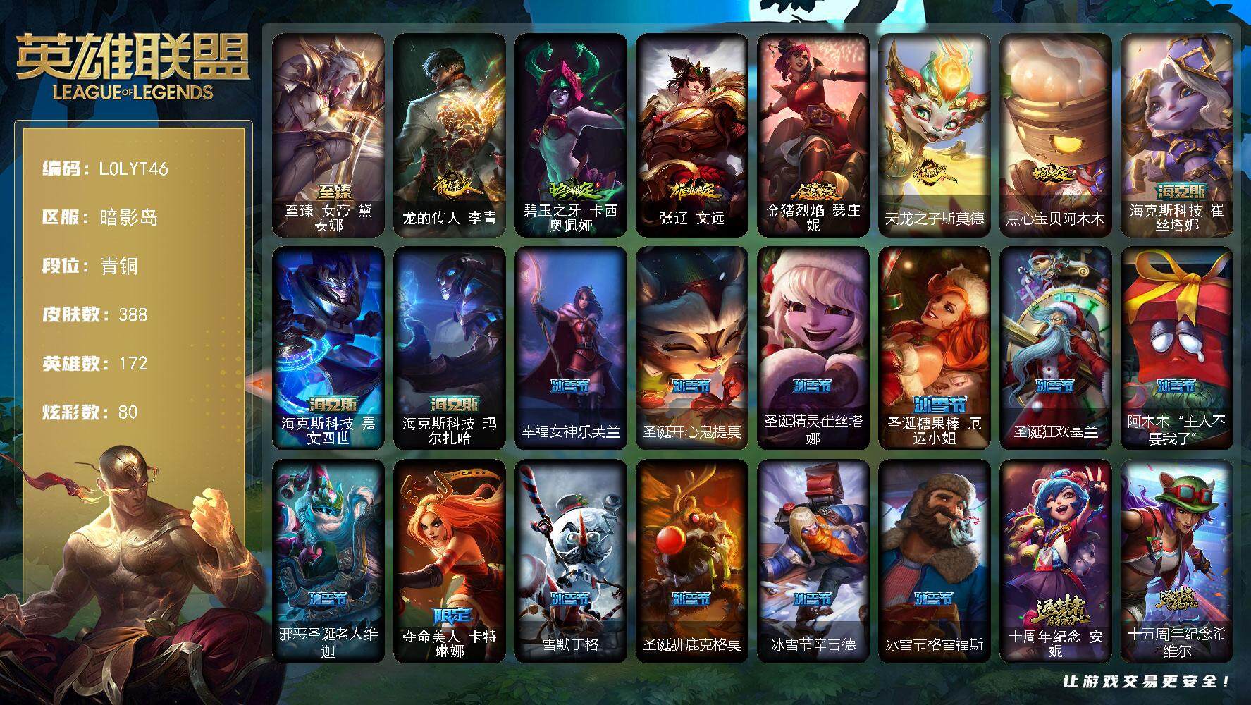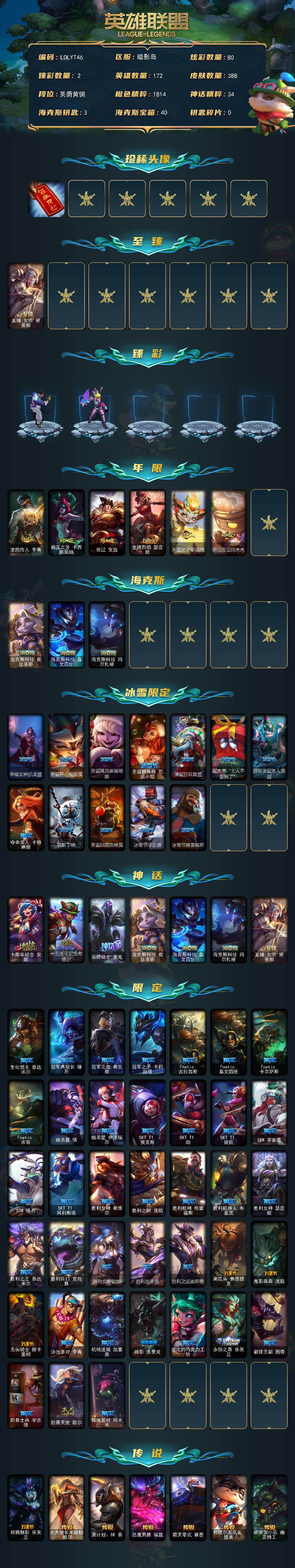 【185451】【LOLYT46】172英雄/388皮肤/7神话/56限定/2臻彩/80炫彩/39传说/110史诗/青铜/红包/至臻女帝黛安娜/龙的传人李青跃龙在渊/幻灵战斗兔锐雯梦幻强袭/龙的传人李青/碧玉之牙卡西奥佩娅/张辽文远/金猪烈焰瑟庄妮/天龙之子斯莫德/点心宝贝阿木木/海克斯科技崔丝塔娜/海克斯科技嘉文四世/海克斯科技玛尔扎哈/幸福女神乐芙兰/圣诞开心鬼提莫/圣诞精灵崔丝塔娜/圣诞糖
