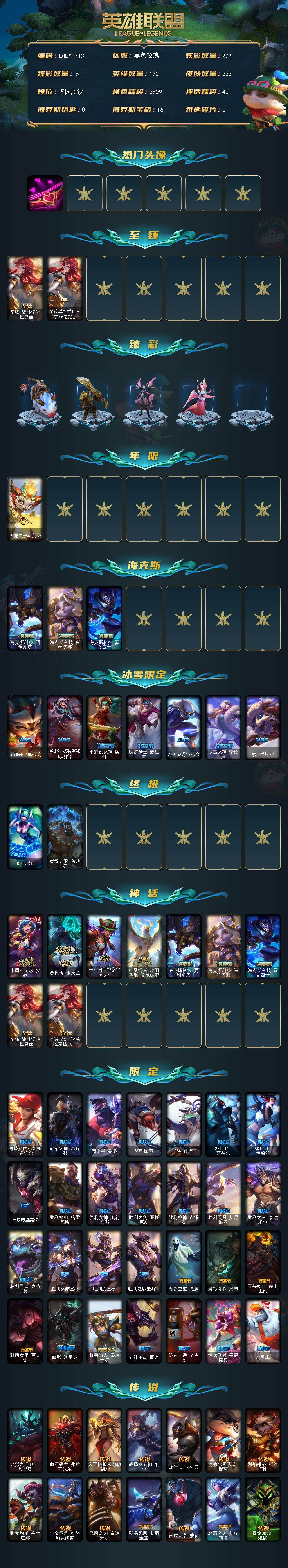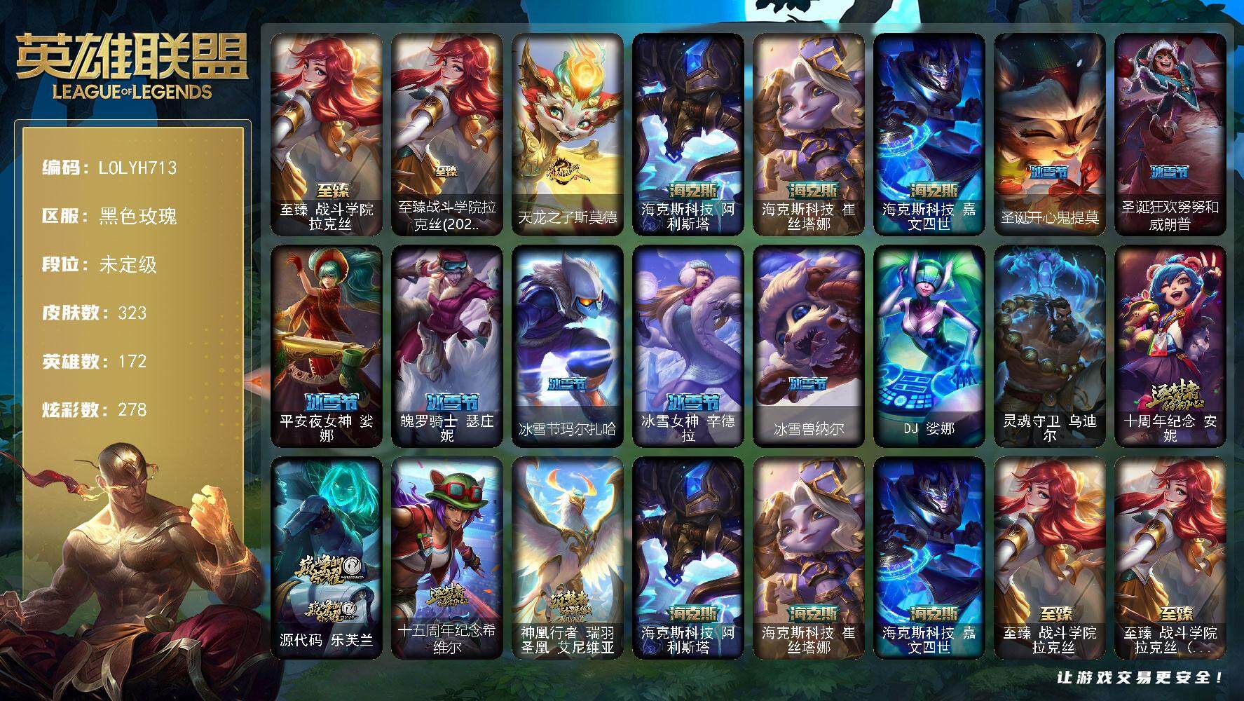 【185542】【LOLYH713】172英雄/323皮肤/2终极/9神话/36限定/6臻彩/278炫彩/30传说/77史诗/未定级账号等级:1432/爱情之歌/至臻战斗学院拉克丝/至臻战斗学院拉克丝(2022)/无畏骑士瑟庄妮赤子初心/张辽文远炫金将军/斗魂觉醒拉克丝无限斗志/弹幕天使卡莎炽天使勇敢/玉剑传说苍鸾丁香/战斗学院盖伦不死鸟/天龙之子斯莫德/海克斯科技阿利斯塔/海克斯科技崔丝塔娜/
