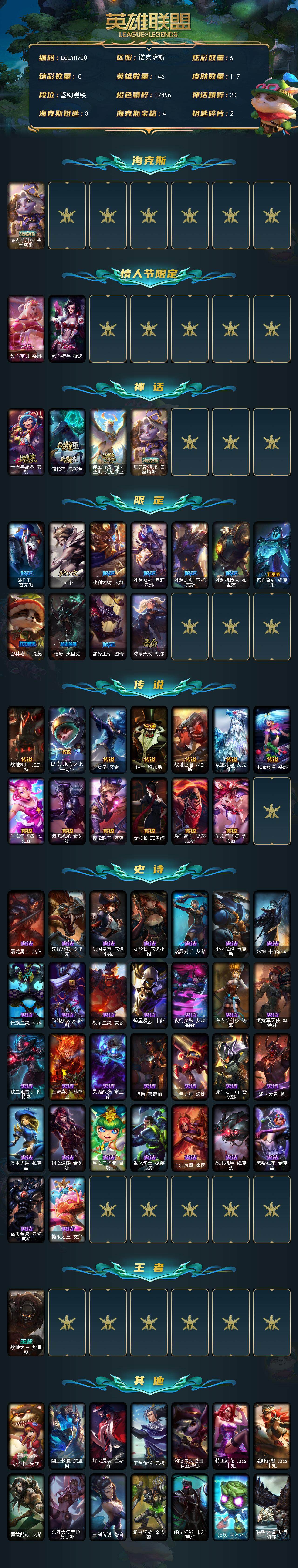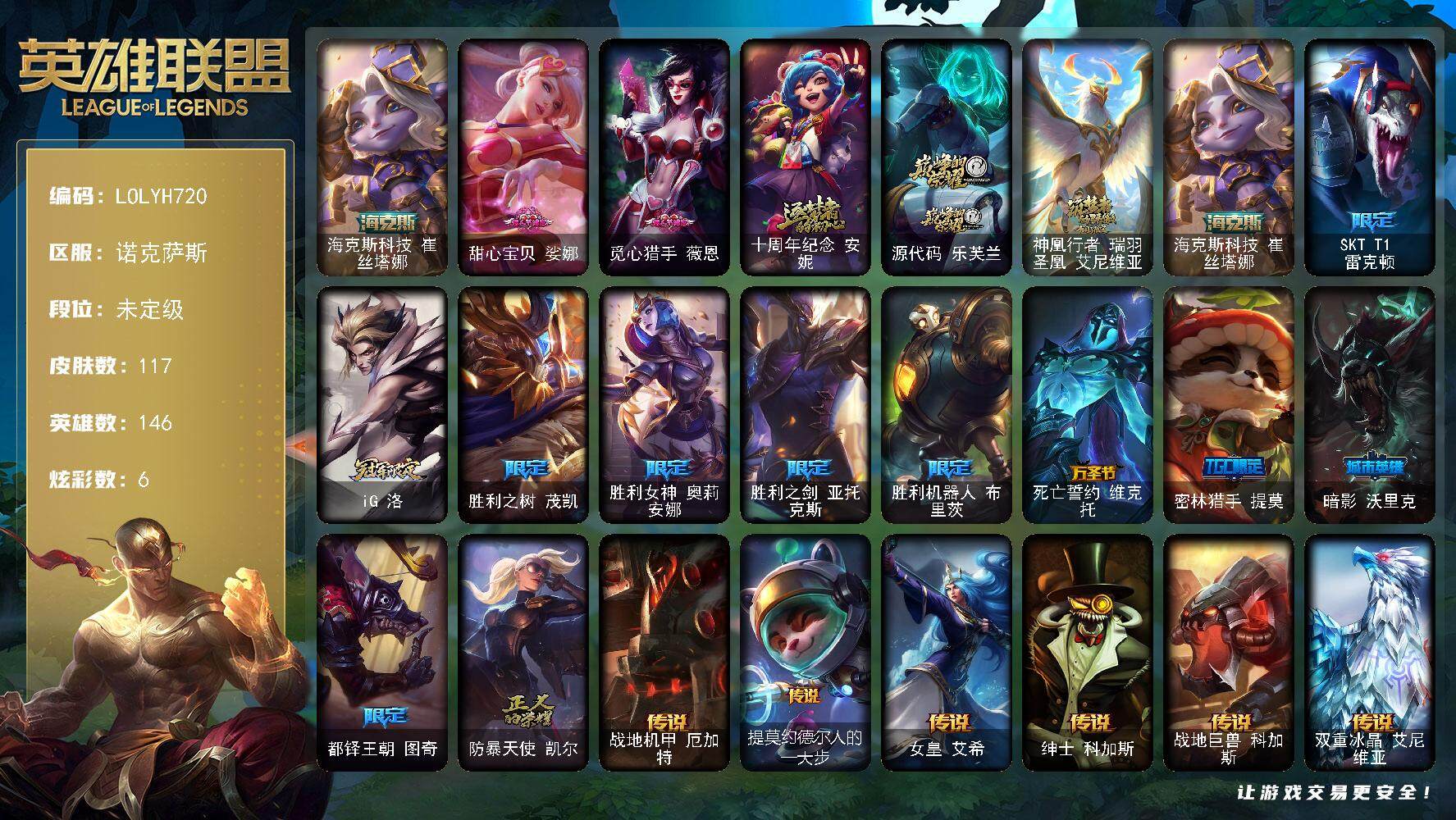 【185562】【LOLYH720】146英雄/117皮肤/4神话/13限定/6炫彩/13传说/30史诗/未定级/海克斯科技崔丝塔娜/甜心宝贝娑娜/觅心猎手薇恩/十周年纪念安妮/源代码乐芙兰/神凰行者瑞羽凤凰艾尼维亚/SKTT1雷克顿/IG洛/胜利之树茂凯/胜利女神奥莉安娜/胜利之剑亚托克斯/胜利机器人布里茨/死亡誓约维克托/密林猎手提莫/暗影妖狐阿狸/都铎王朝图奇/防暴天使凯尔/战地机甲厄加特