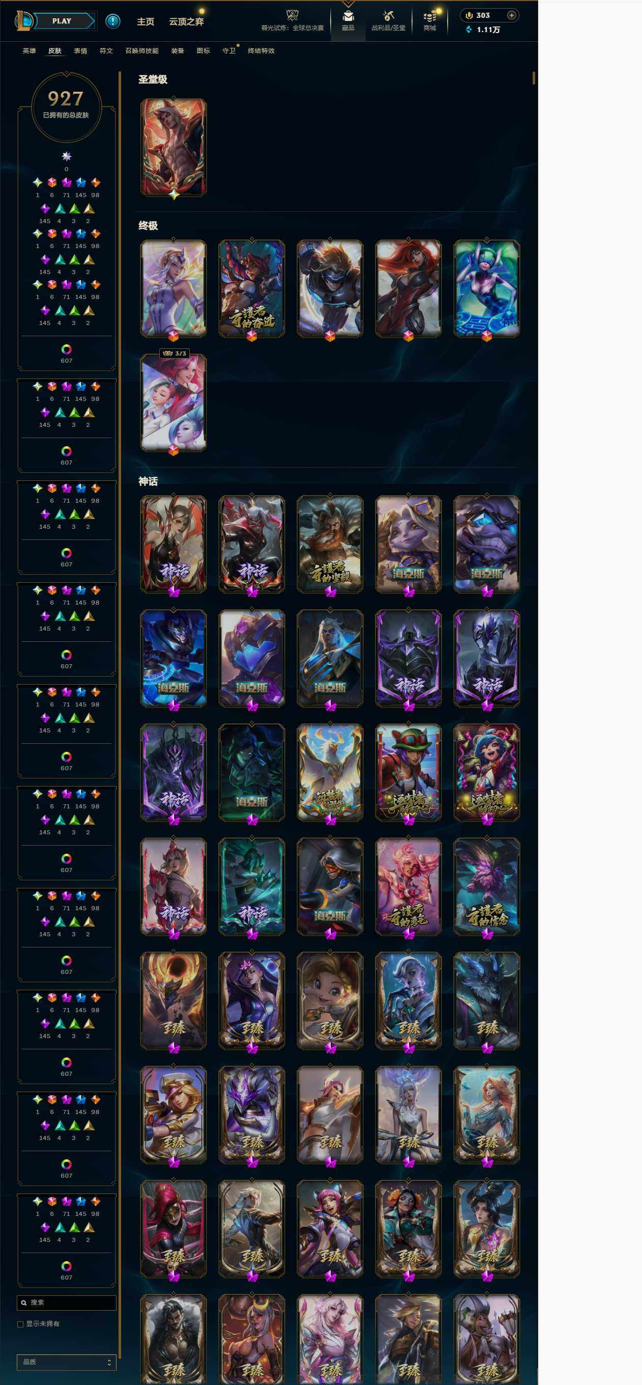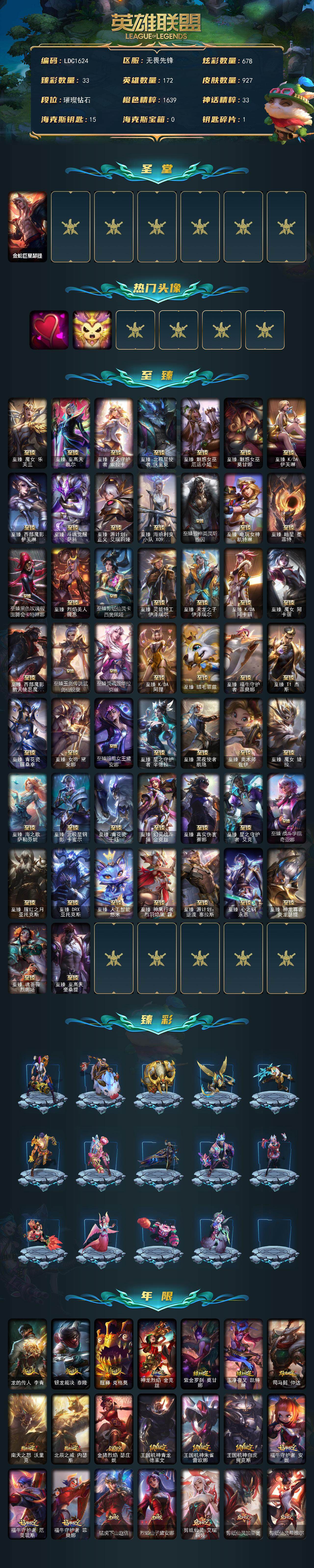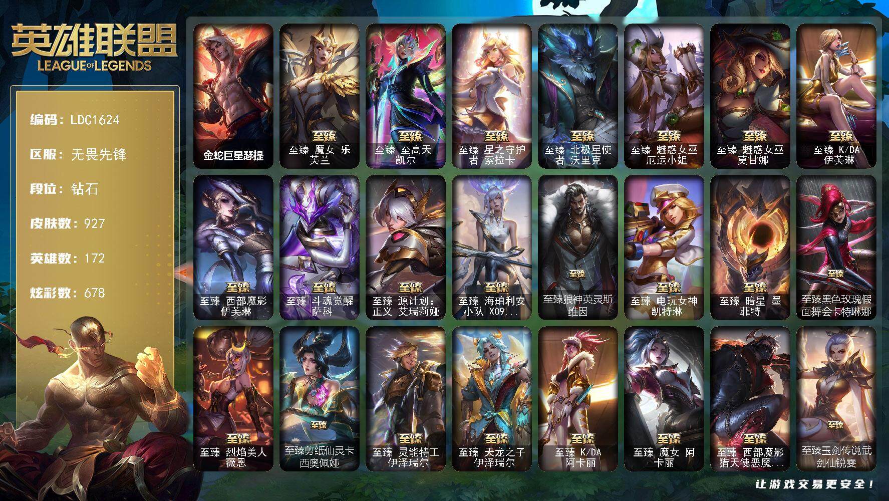 【185576】【LDC1624】172英雄/927皮肤/8终极/71神话/145限定/33臻彩/678炫彩/98传说/145史诗/钻石账号等级:856/金蛇巨星瑟提/爱意绵绵/星守索拉卡/至臻魔女乐芙兰/至臻至高天凯尔/至臻星之守护者索拉卡/至臻北极星使者沃里克/至臻魅惑女巫厄运小姐/至臻魅惑女巫莫甘娜/至臻K/DA伊芙琳/至臻西部魔影伊芙琳/至臻斗魂觉醒萨科/至臻源计划:正义艾瑞莉娅/至臻海