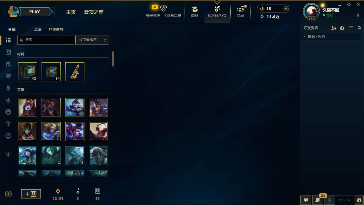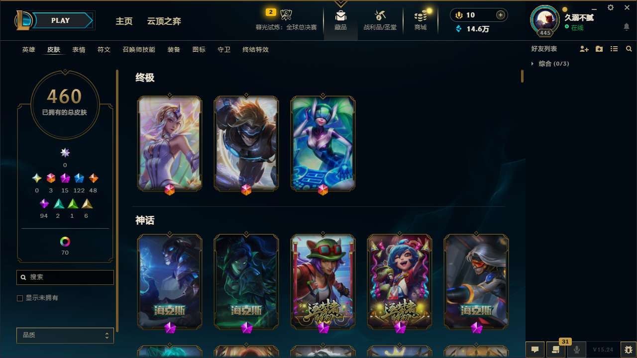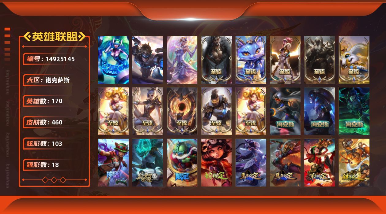 【187610】[14925145]t32969【诺克萨斯】460皮肤 103炫彩 18臻彩 15神话/122限定/48传说/170英雄 账号等级:445 单双排段位:黄金【重要头像】耀星女神拉克丝 暗星女王拉克丝 卡特琳娜的匕首 玉剑传说寒潭夭夭炫彩 电玩女神厄运小姐 电玩女神娑娜 【重要皮肤】狼神英灵斯维因至臻 人工智能悠米至臻 未来战士卢锡安至臻 暗星墨菲特至臻 KDA
