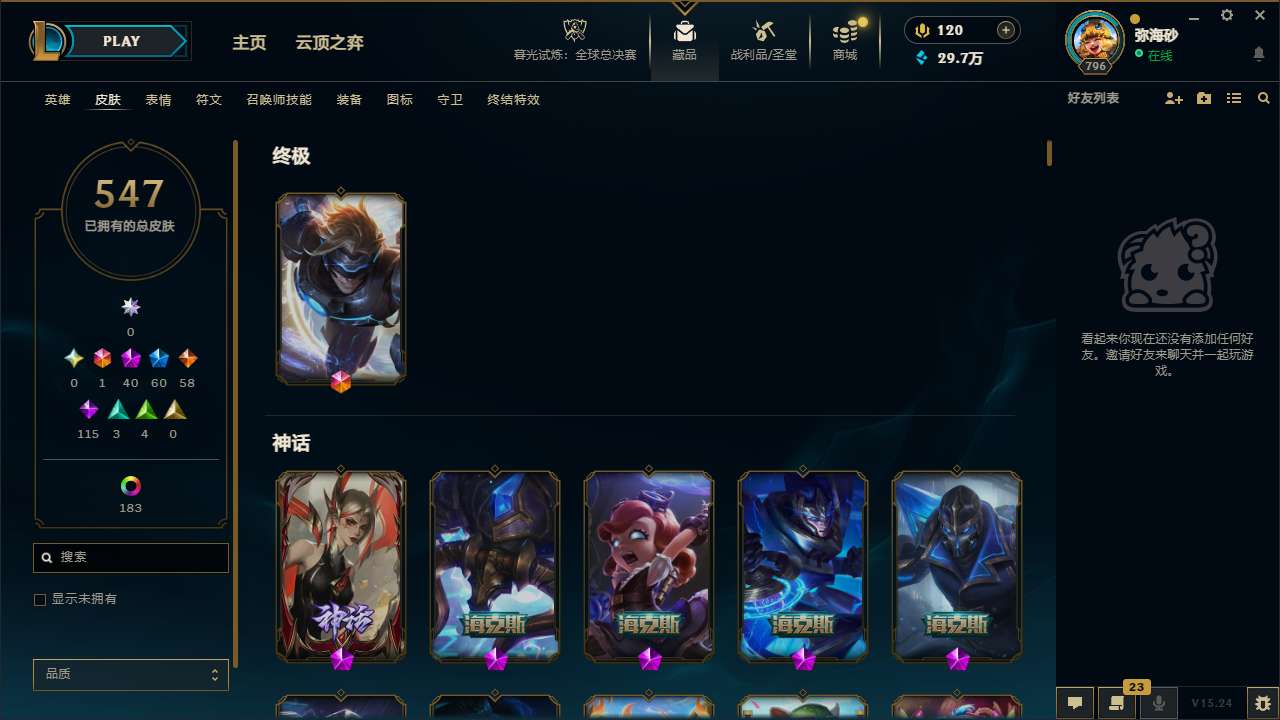 【187635】[14925370]t32970【艾欧尼亚】547皮肤 278炫彩 16臻彩 40神话/60限定/58传说/171英雄 账号等级:796 云顶神话:1 单双排段位:铂金【重要头像】觅心之翼奎因 我麦是开的么 KDA萨勒芬妮 战斗学院伊泽瑞尔神话炫彩 美猴王孙悟空 至臻福牛守护者菲奥娜 至臻女帝黛安娜 西部魔影卢锡安炫彩头 【重要皮肤】机神玄武盖伦至臻 狼神英灵斯