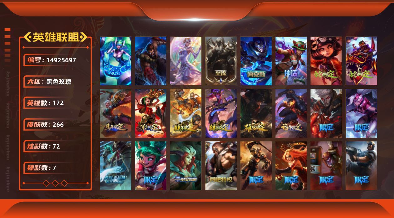 【187674】[14925697]t32980【黑色玫瑰】266皮肤 72炫彩 7臻彩 4神话/64限定/26传说/172英雄 账号等级:348 单双排段位:铂金【重要头像】爱意绵绵 战斗学院拉克丝 披萨鸡 【重要皮肤】腥红之月亚托克斯至臻 海克斯科技嘉文四世 胜利剑圣易 胜利女神娑娜 胜利之王泰达米尔 哥特萝莉安妮 奥斯曼大帝普朗克 电玩女神阿狸 龙的传人李青 替父从