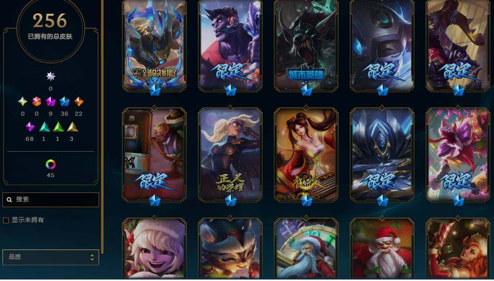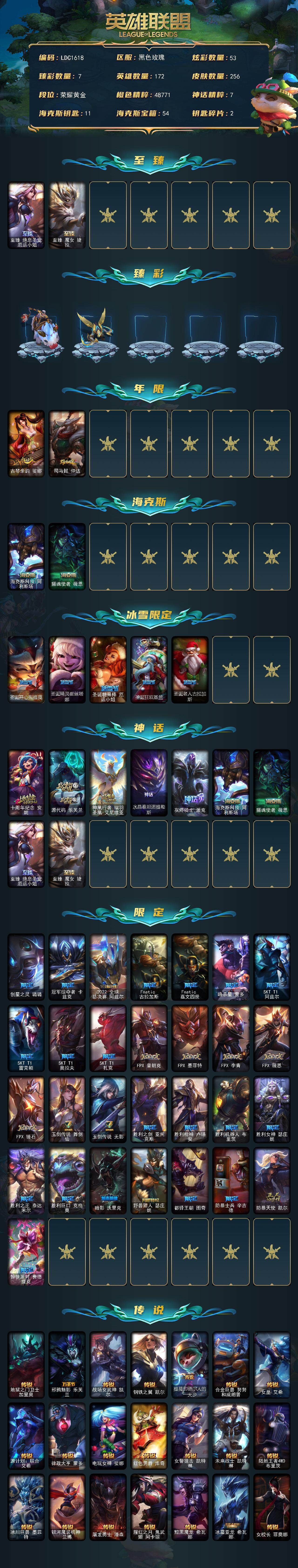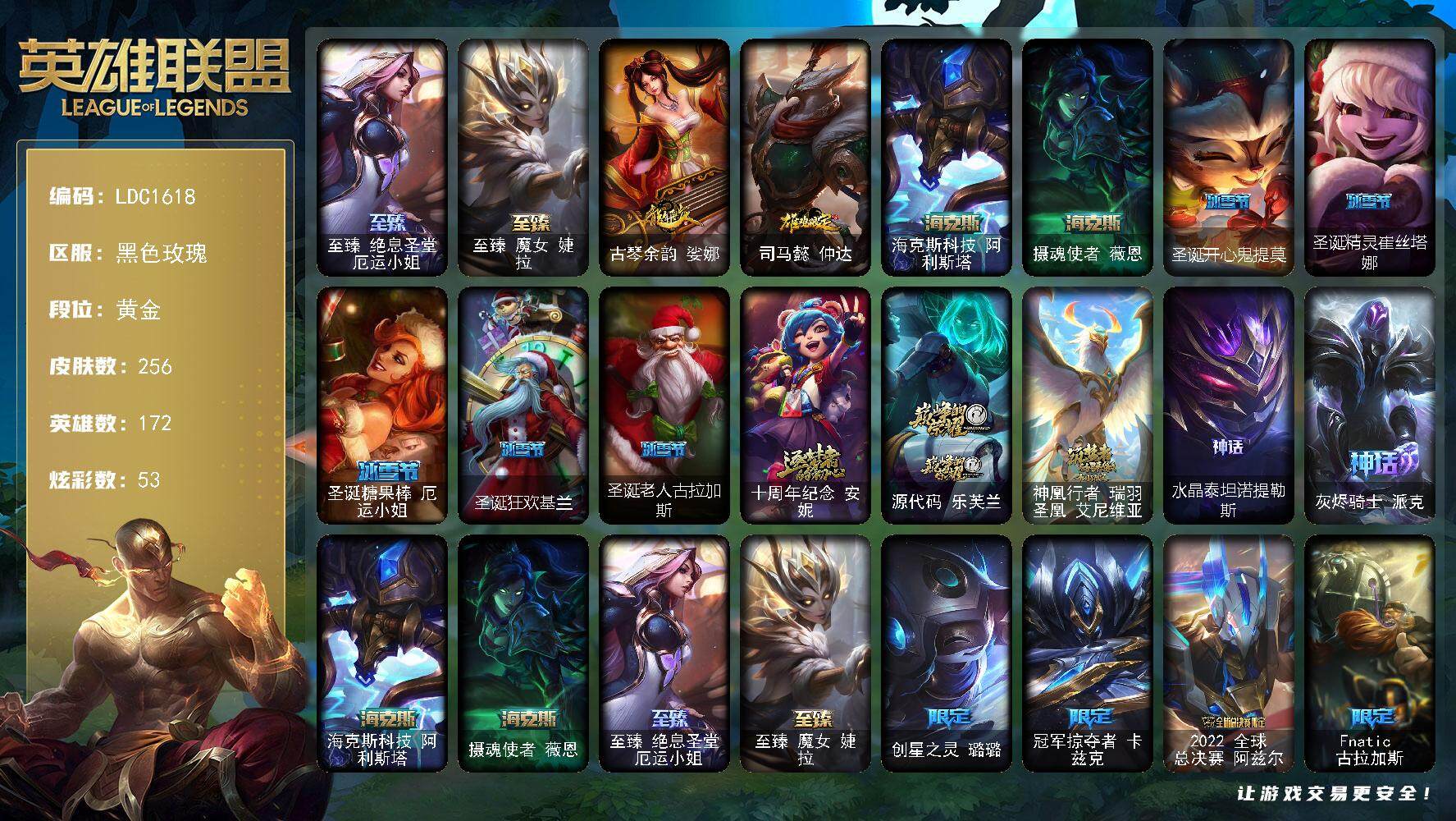 【187696】【LDC1618】172英雄/256皮肤/9神话/36限定/7臻彩/53炫彩/22传说/68史诗/黄金/至臻绝息圣堂厄运小姐/至臻魔女婕拉/无畏骑士瑟庄妮赤子初心/冠军掠夺者卡兹克凯旋圣装/古琴余韵娑娜/司马懿仲达/海克斯科技阿利斯塔/摄魂使者薇恩/圣诞开心鬼提莫/圣诞精灵崔丝塔娜/圣诞糖果棒厄运小姐/圣诞狂欢基兰/圣诞老人古拉加斯/十周年纪念安妮/源代码乐芙兰/神凰行者瑞羽凤凰
